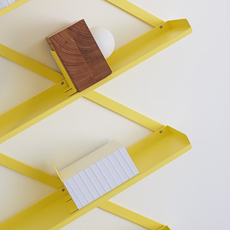 A bookcase with a characteristic pantograph design. It can be mounted at various angles in keeping with style or space requirements.