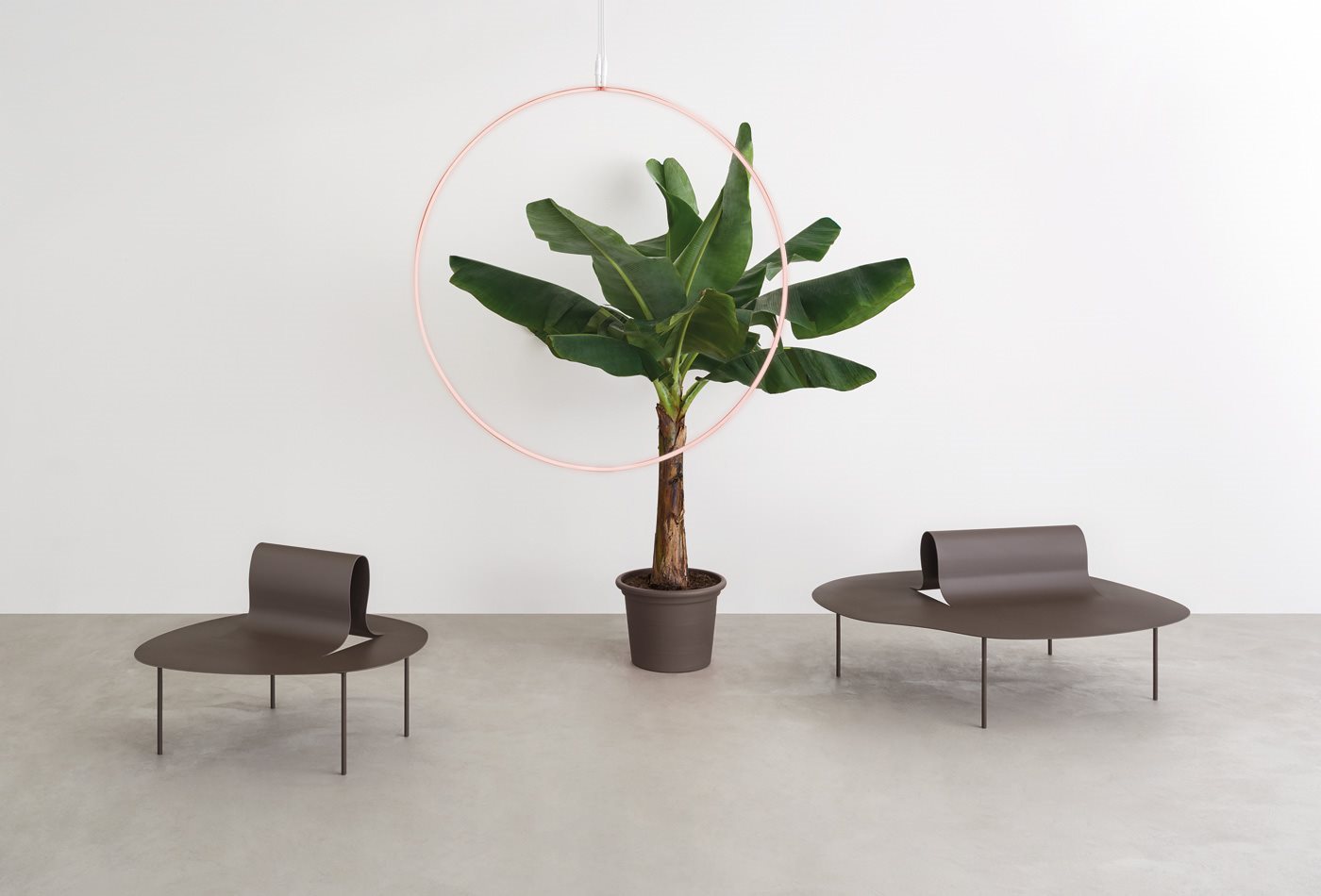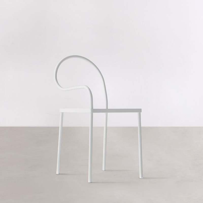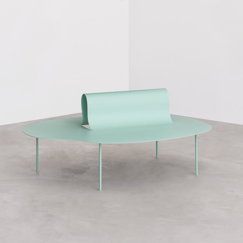 "A rigid metal sheet becomes light and flexible as if the metal were paper or fabric". Part of the surface lifts up and bends to create the chair's backrest.