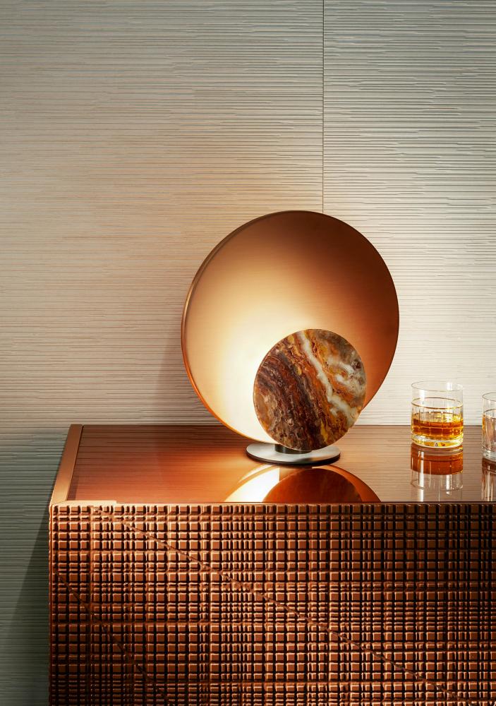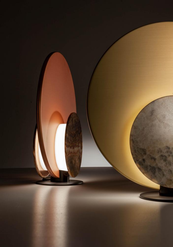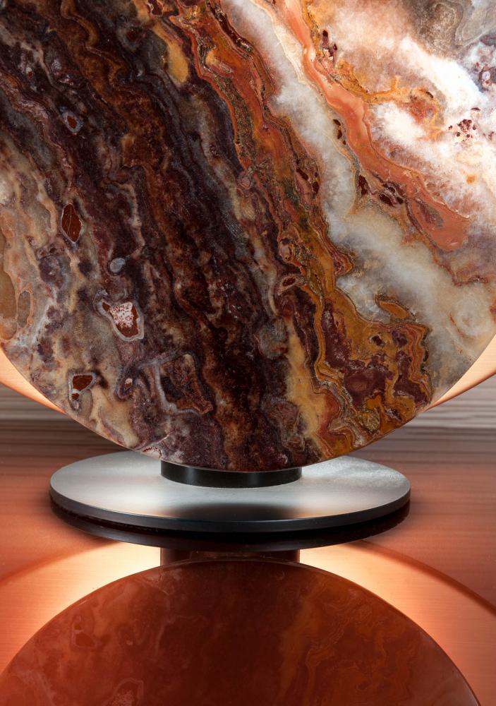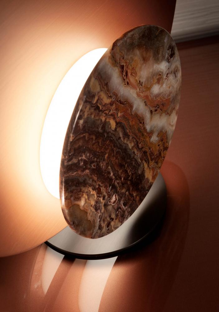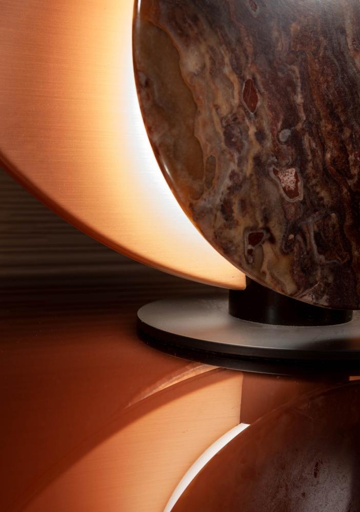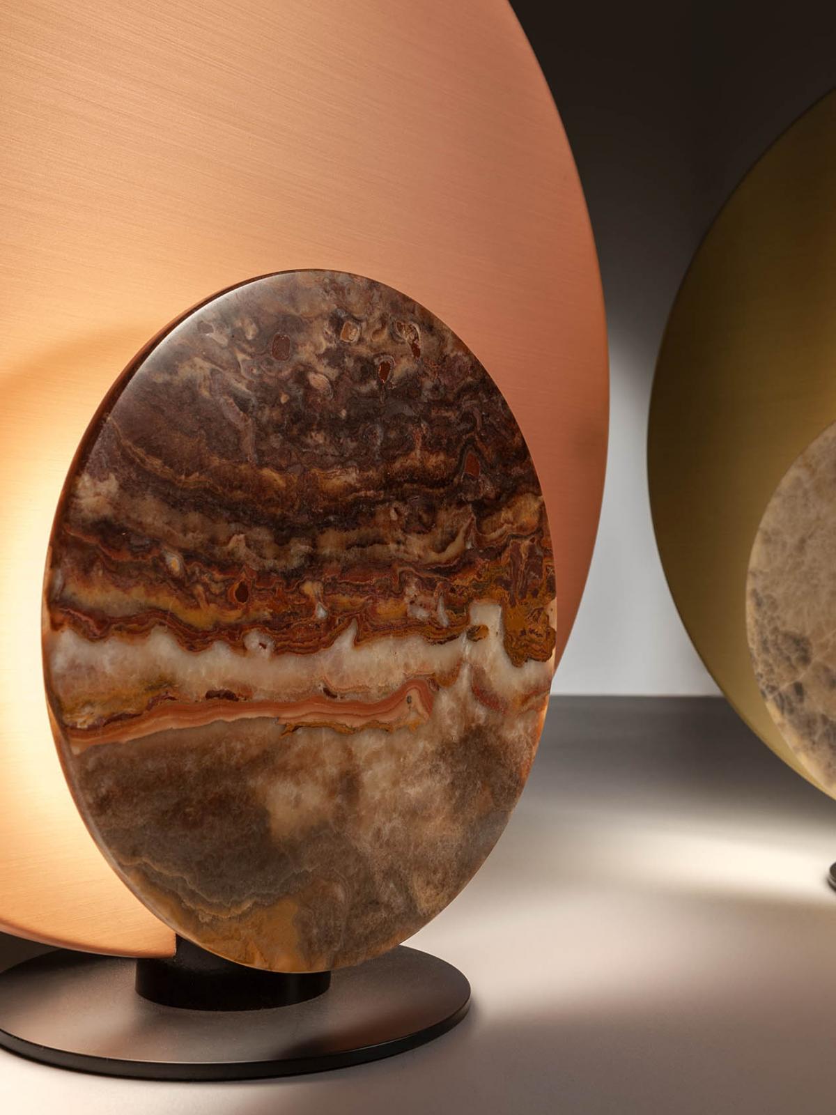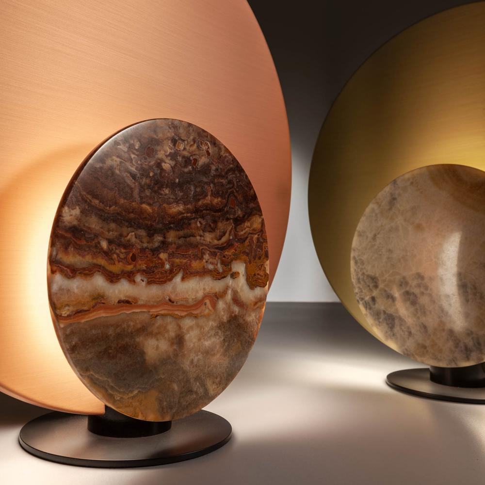 Designed to create a warm and pleasant atmosphere, it is equipped with a structure in satin brass or copper, and with interchangeable covers in precious polychrome marbles.