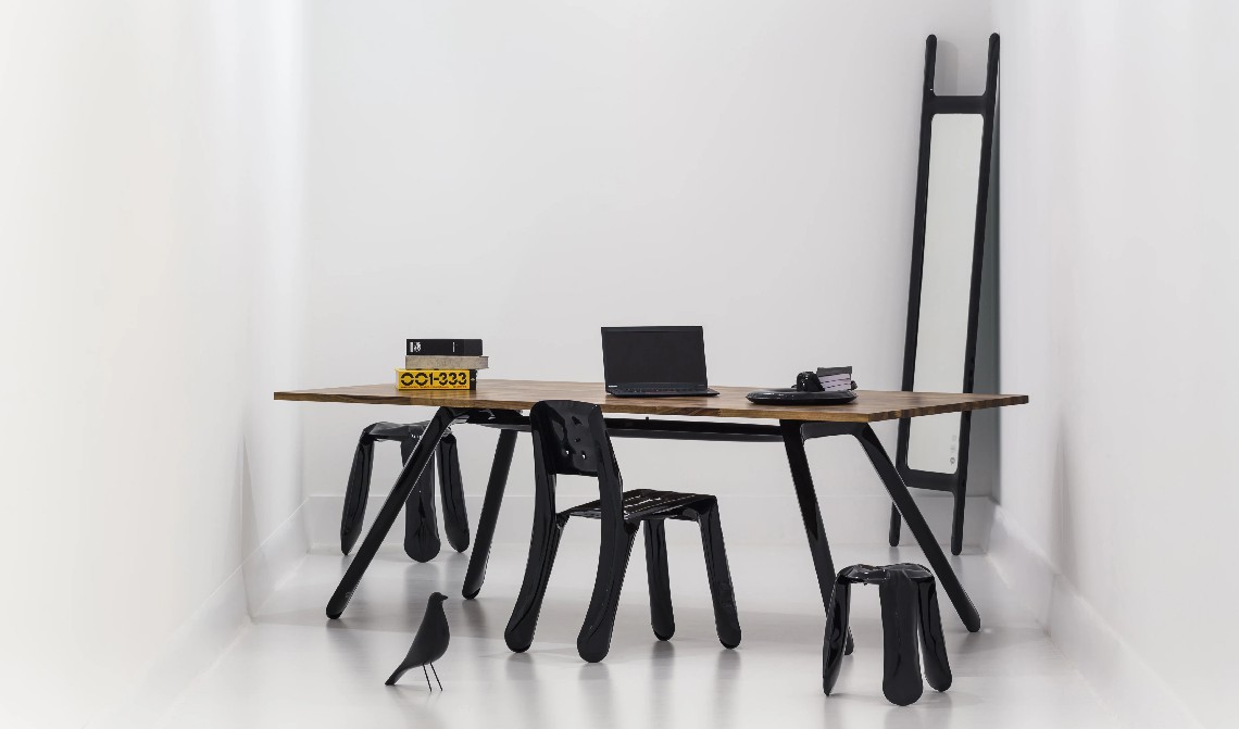 A development of the limited edition Chippensteel 0.5 chair – available in new colours. It still offers a unique material experience but the shape of the chair has been slightly redesigned to allow a mass-production. The chair has been uniquely processed and produced in FiDU technology using bending properties of steel sheets.
