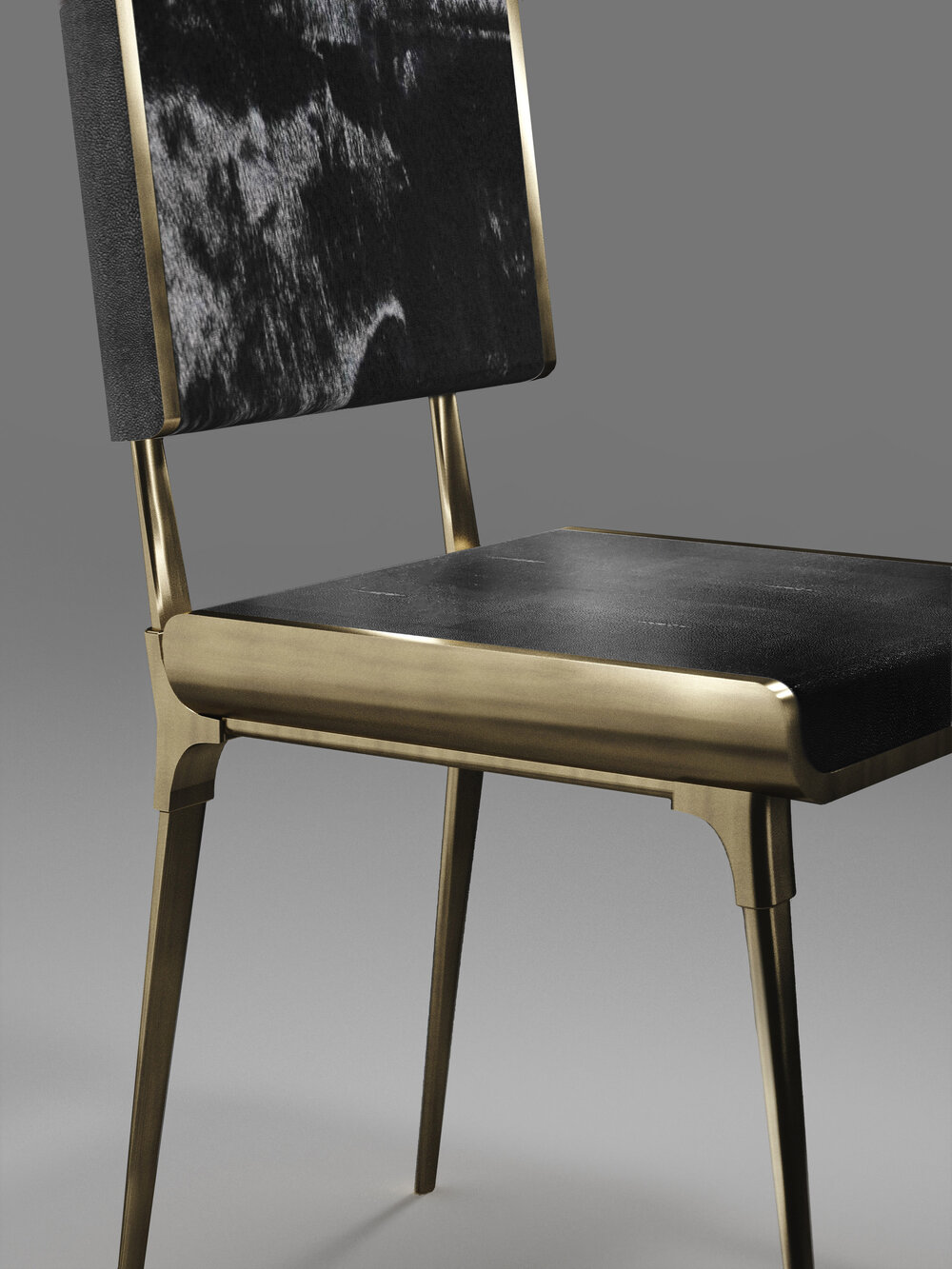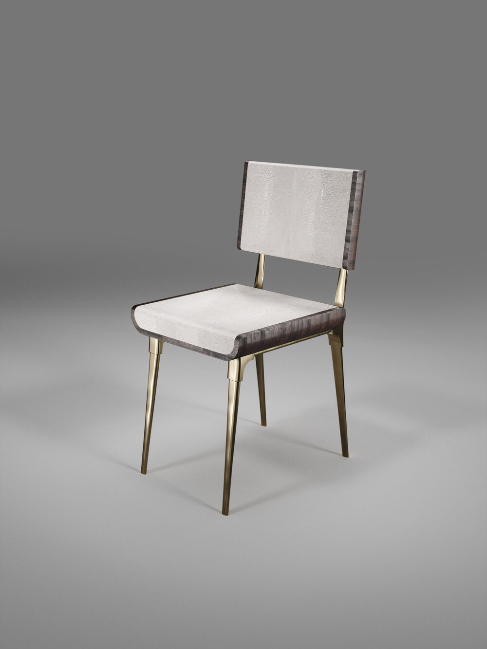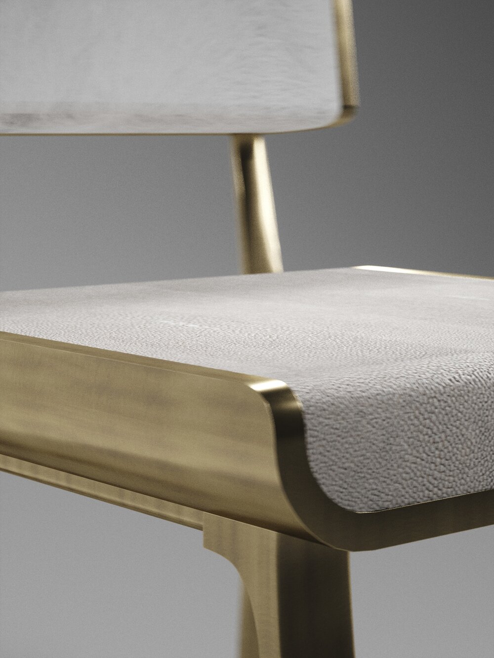 Inspired by the original Dandy Bench by KIFU PARIS, the Dandy II Chair is the ultimate luxury seating for a dining room or corner area. The seating area is inlaid in cream shagreen and the legs, frame and sides of the chair are inlaid in bronze-patina brass. The backrest is upholstered with white vachette. Other versions are also available as part of the Dandy II Capsule.