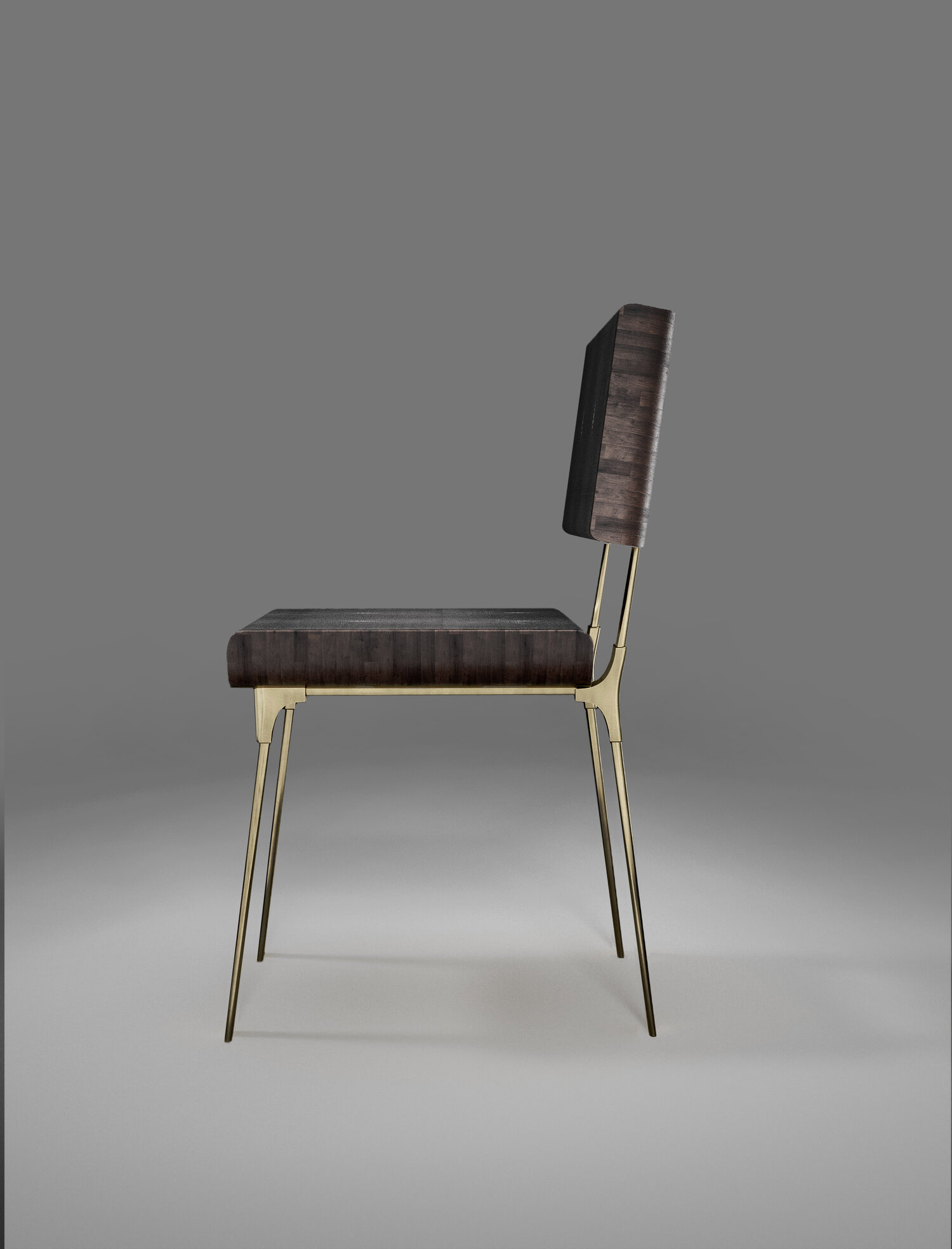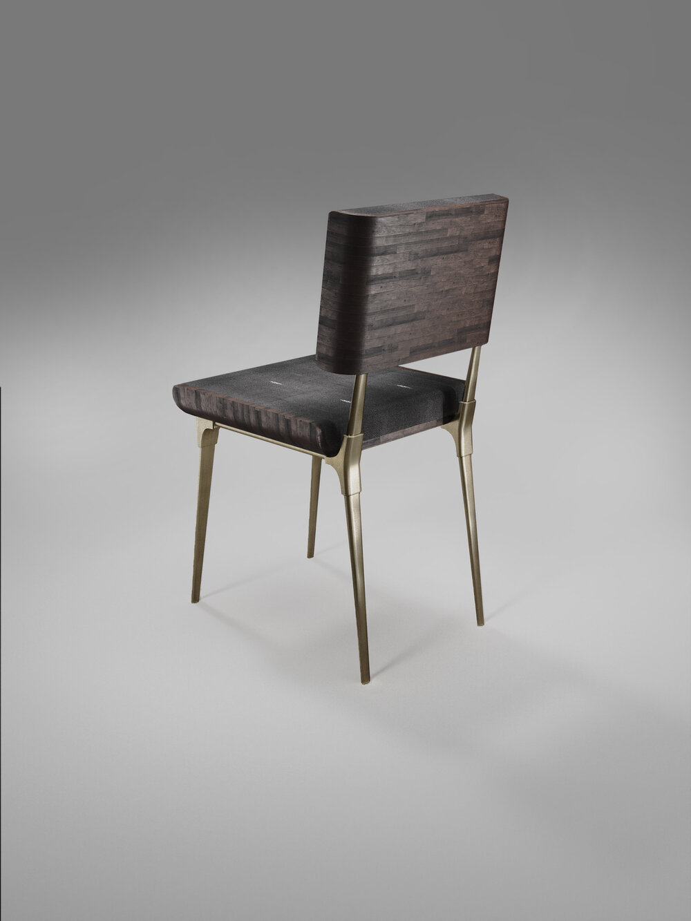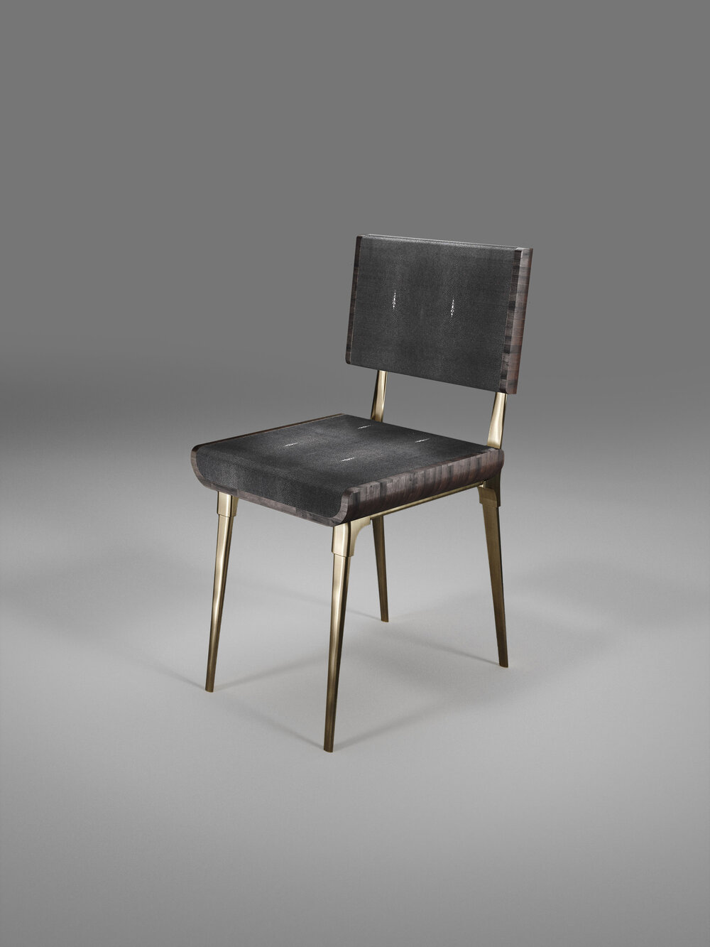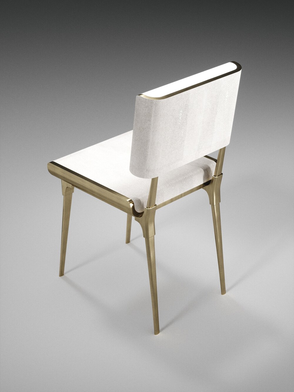 Inspired by the original Dandy Bench by KIFU PARIS, the Dandy II Chair is the ultimate luxury seating for a dining room or corner area. The seating area is inlaid in cream shagreen and the legs, frame and sides of the chair are inlaid in bronze-patina brass. The backrest is upholstered with white vachette. Other versions are also available as part of the Dandy II Capsule.