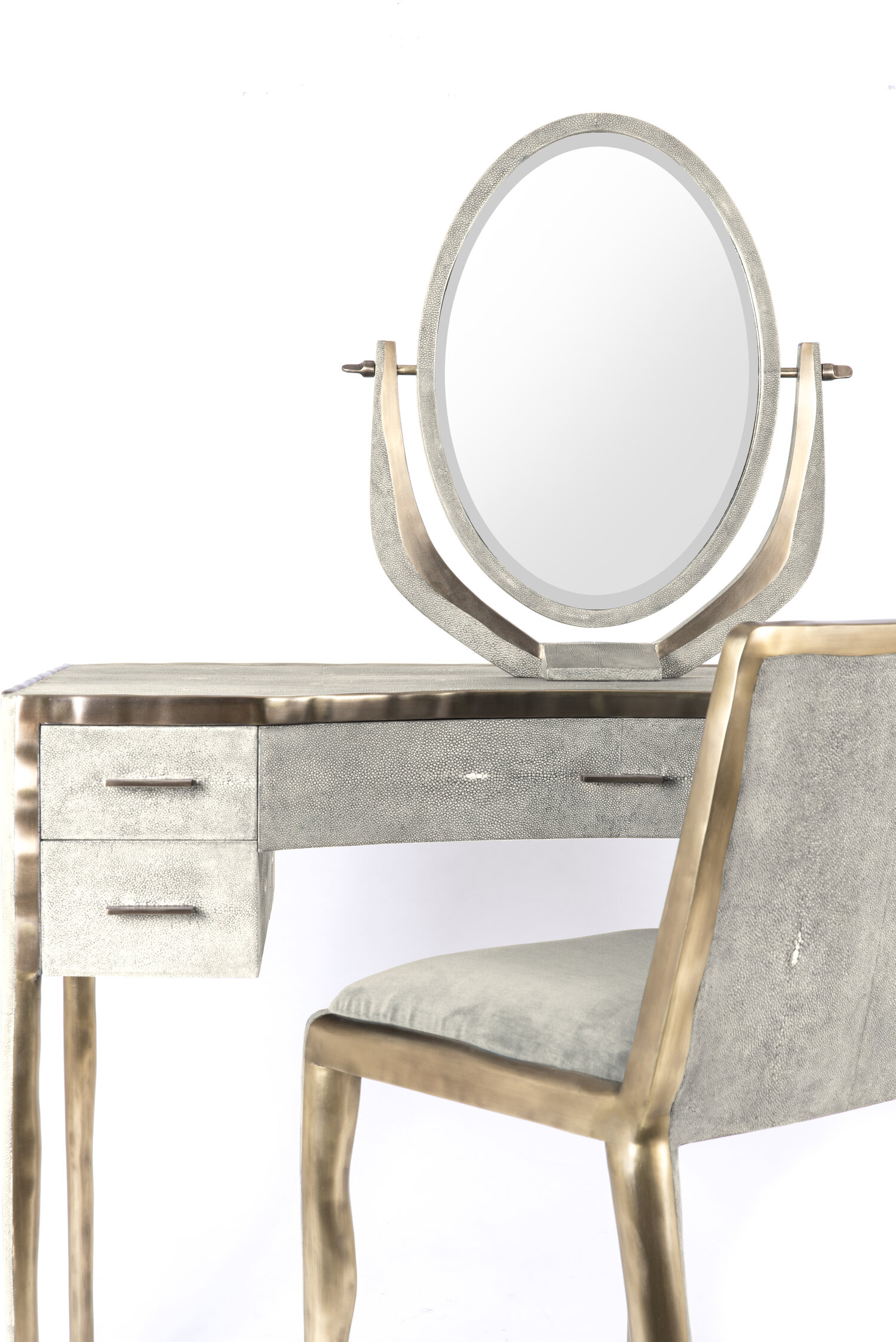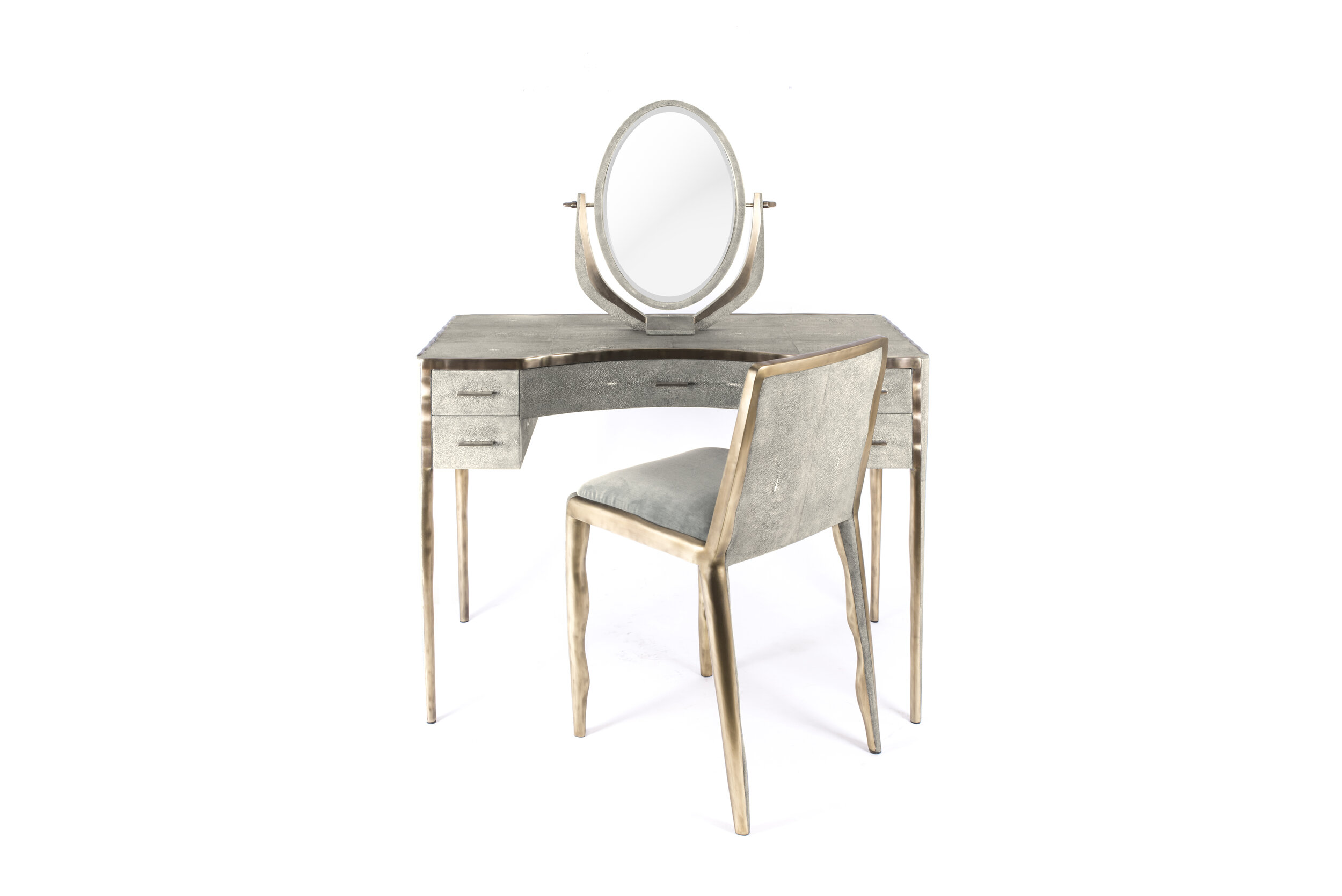 The melting vanity table's simple but elegant design, makes for an adaptable elegant piece of furniture. The cream shagreen inlaid surface is framed with an irregular surface bronze-patina brass that creates the "melting" effect against the shagreen inlay. This desk includes 5 drawers total with a discreet thin metal handle. Mirror included, chair sold separately. Available in blue shagreen see image sat end of slide, Custom color or sizing available on request.