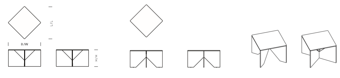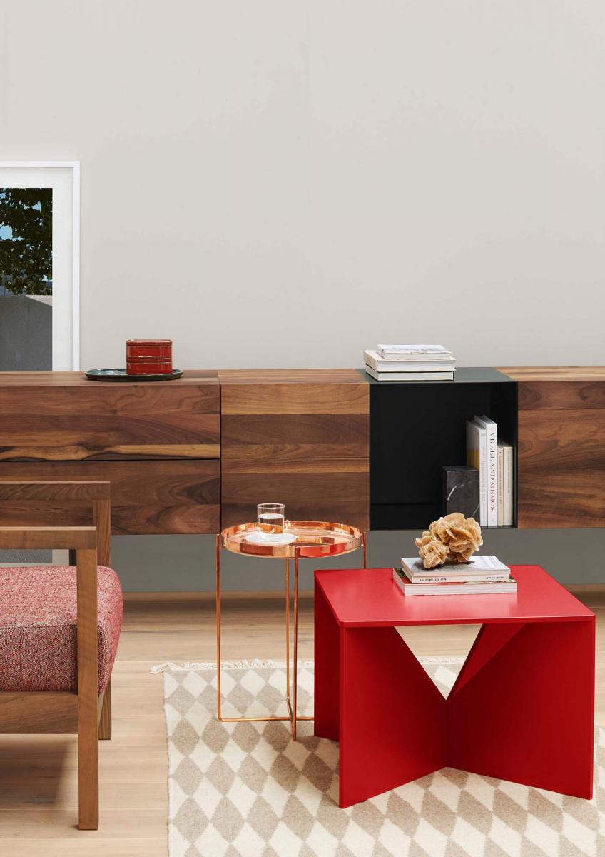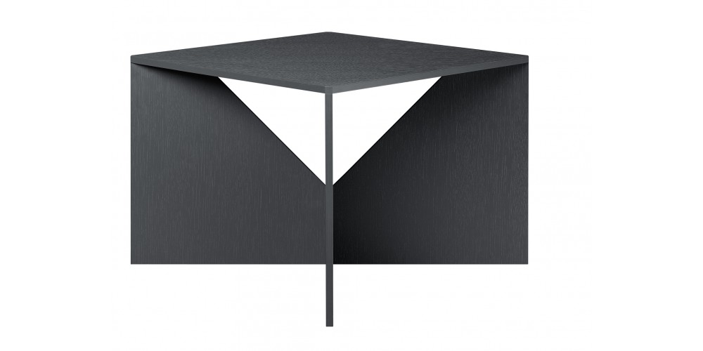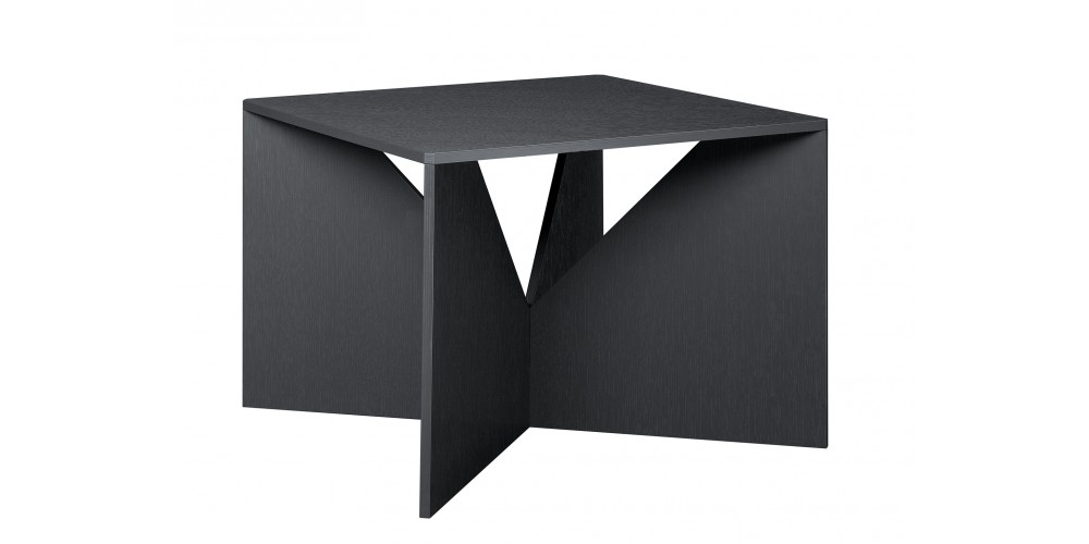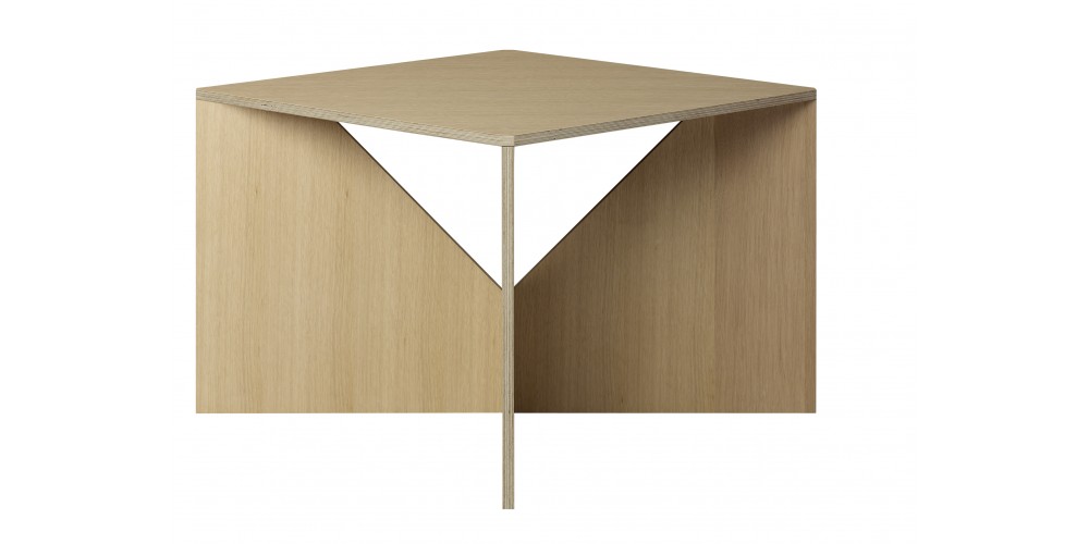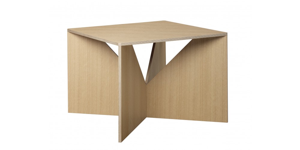 CALVERT is from a series of coffee tables, designed in 1951 by German functionalist architect Ferdinand Kramer? during his time in America. Part of his successful "Knock-Down" furniture series, the square CALVERT is an enduring and modern piece. The easily invertible and collapsible coffee table consists of a tabletop and two crossing invertible sheets serving as a base for the table. Similar to a clothing pattern, the components of the table are cut out of a single plywood sheet. The intrinsically simple cut out base of CALVERT reveals a sculptural quality to the table. Available in oak as well as coloured lacquer, CALVERT is ideally suited for diverse environments and complements the e15 collection.