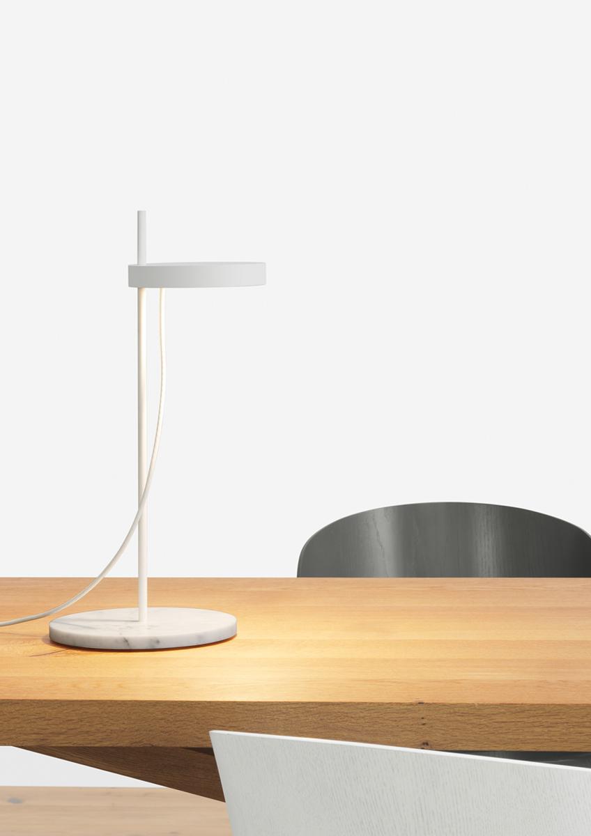 The table light PALO elegantly offers smart solutions for table or bed side reading. The visible cord lends a casual and dynamic edge to the precise form of the light. The solid oiled marble base in Bianco Carrara or Nero Marquina luxuriously enhances the purity of the defined forms of this light.
