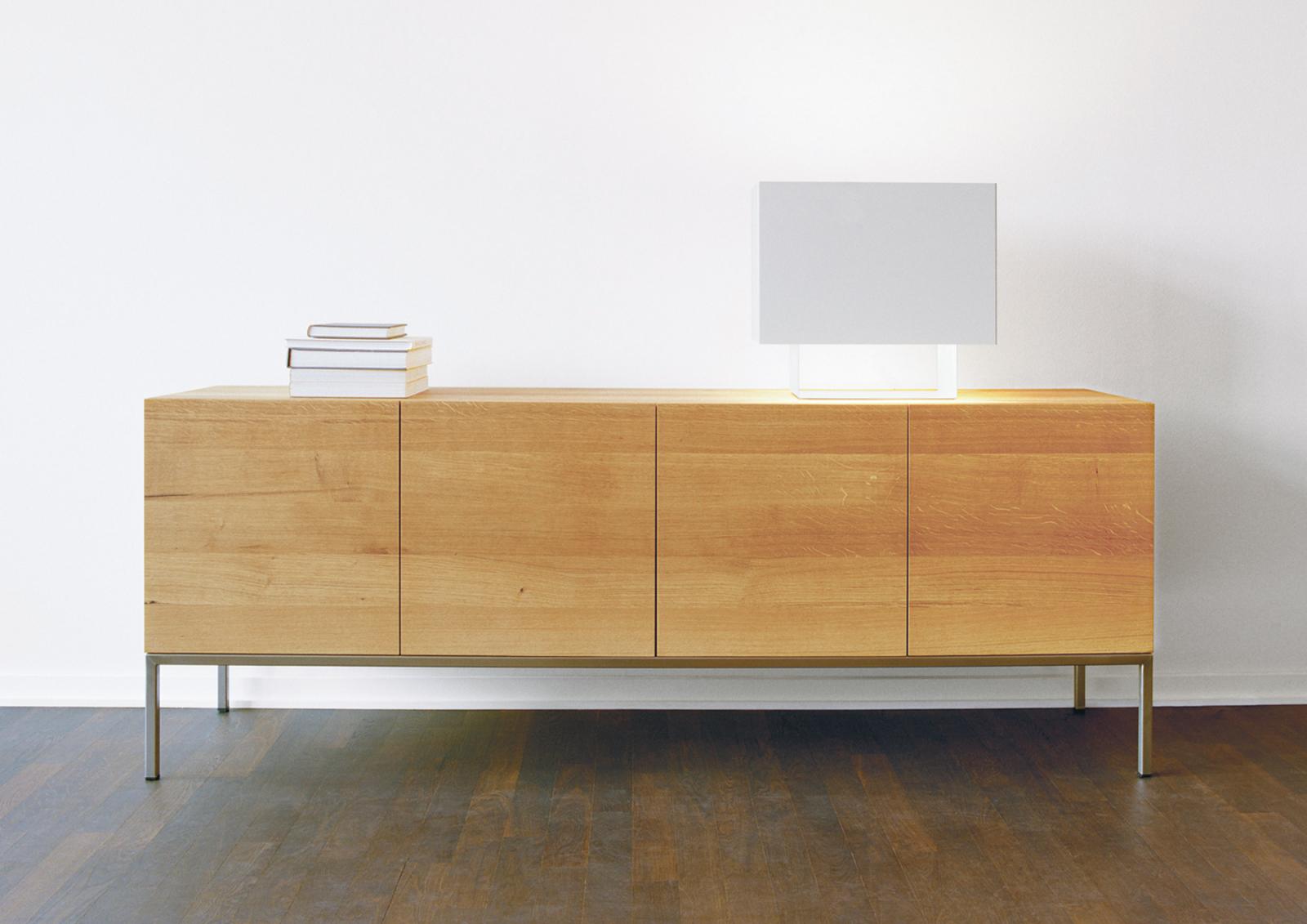 The sideboard FARAH is a refined storage solution. The horizontal display of the solid wood grain makes each sideboard unique and elegantly highlights the combination of solid wood and a seamless stainless steel frame. Aluminium strips inserted inside the door panels ensure further stability, enabling a solid wooden front structure without a visible supporting frame. The frame is also available in powder-coated steel.