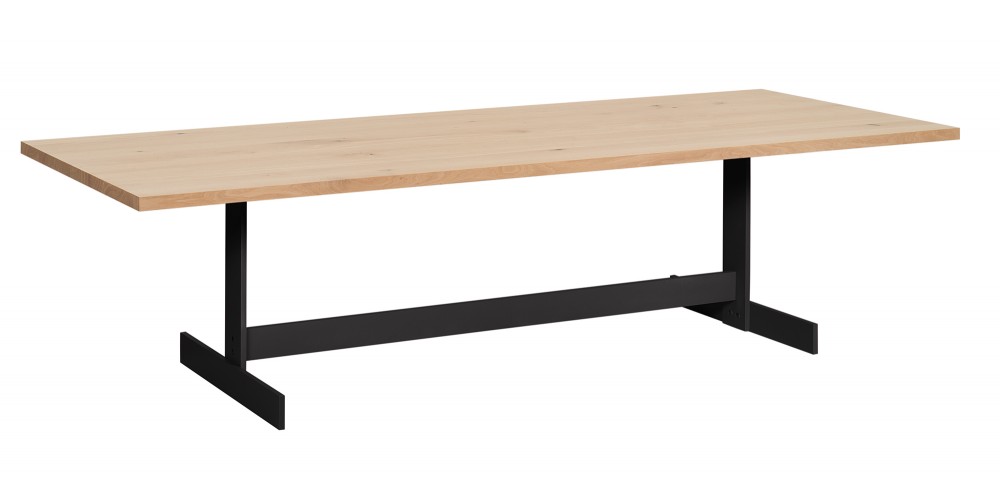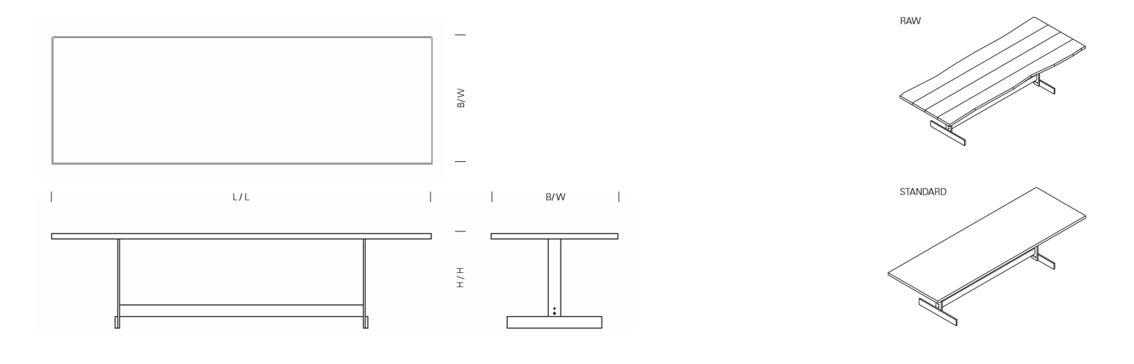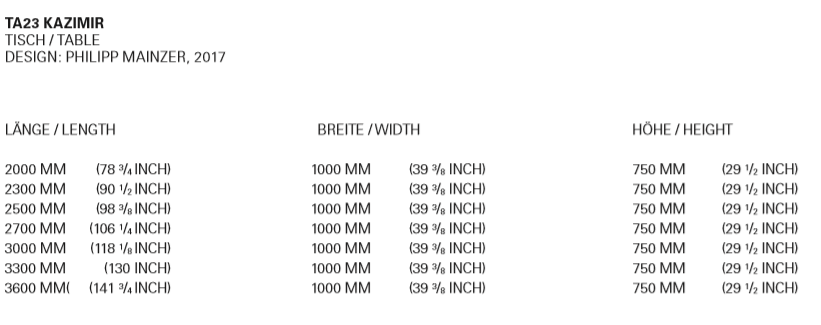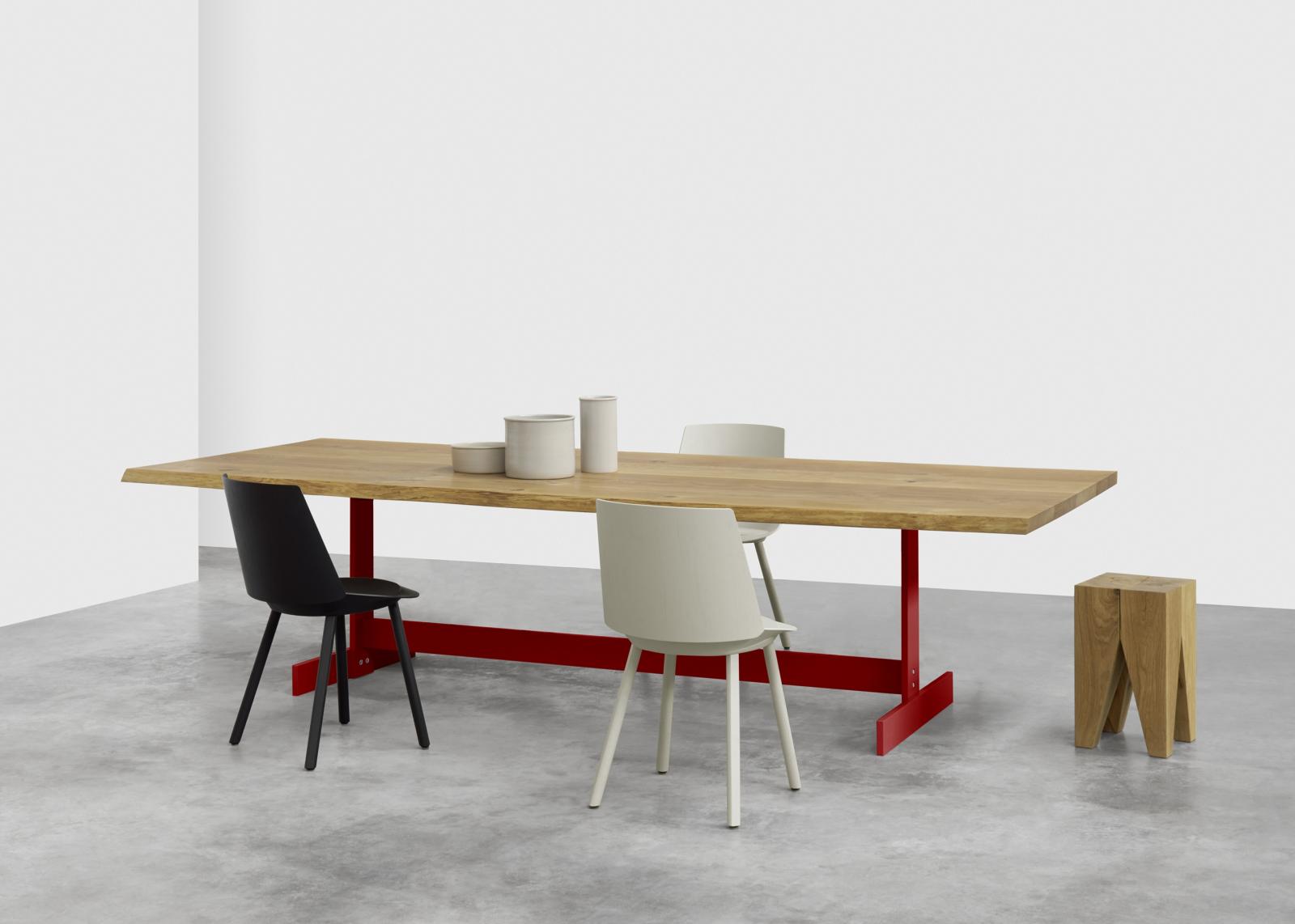 Inspired by Suprematist compositions, table KAZIMIR by Philipp Mainzer features a bold mix of geometric forms and materials. Focussing on a distinct construction, the tabletop made from solid European oak or walnut rests on a metal centre base, allowing for various interpretations in private and public spaces. Available in a range of standard and custom colours as well as exclusive materials such as galvanised zinc, blackened steel and brushed brass, the frame features a characteristic refectory table construction, which provides stability for tables up to 3600 MM (141 3/4 INCH) and generous seating at the table ends. KAZIMIR is also available in a ‘RAW’ version, featuring solid wood boards with a width of up to 250 MM (9 7/8 INCH) exposing the brushed natural edges of the tree.