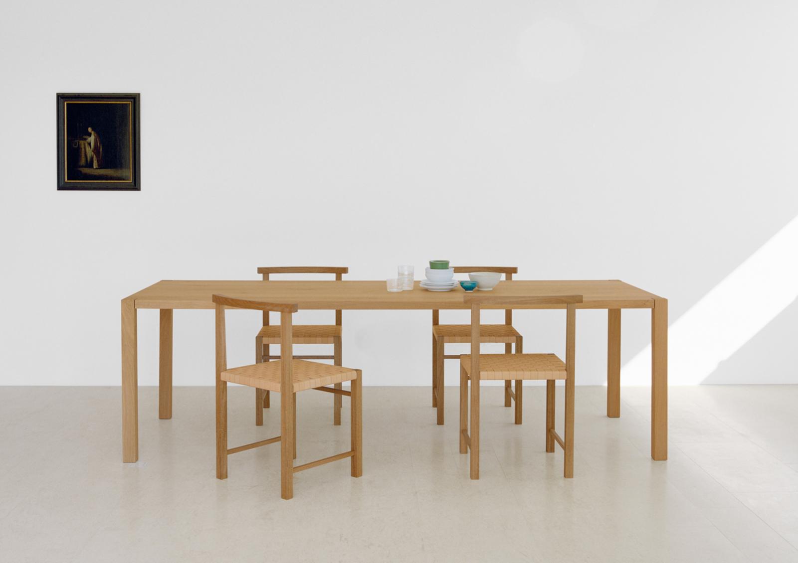 The table SLOANE is a lean and elegant solid wood dining table. Characteristic of iconic e15 solid wood tables, the square legs of SLOANE intersect with the slim 40 MM (1 5/8 INCH) tabletop with the supporting structure incorporated into the tabletop. Its slim silhouette is further emphasised with a new wood finish that is offered for SLOANE, white pigmented waxed, which exudes lightness and elegance. Available from a length of L 1400 MM (55 1/8 INCH), SLOANE is a dining table ideal also for smaller spaces. The clearance underneath the table top measures 710 MM (28 INCH). The table can be disassembled into five parts.