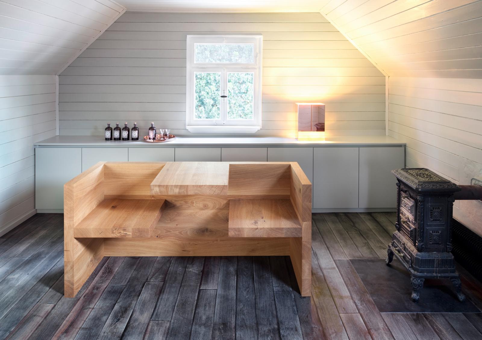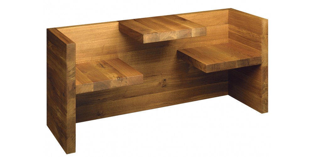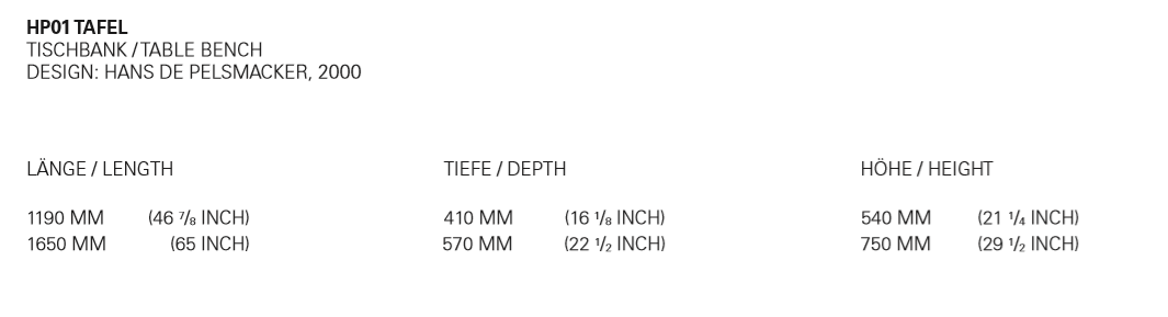 The tablebench TAFEL draws special interest with its sculptural, functional appeal. TAFEL is included in various museum collections. The combination of table and bench creates a unique sitting experience. In equal proportions, but smaller measurements, TAFEL is in its oak version also available for children in 1190 MM (46 7/8 INCH) length.