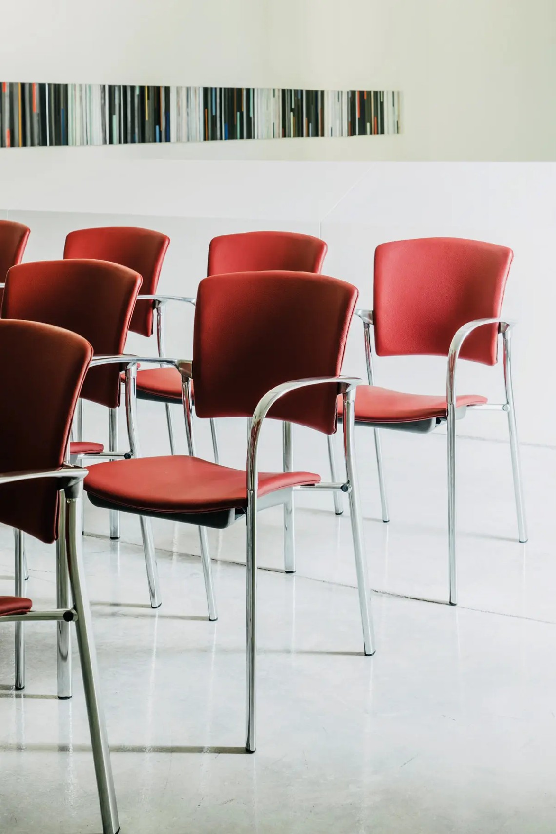 The 4-legged steel structure and the aluminium armrests of Eina chair are offered in chrome/polish or lacquered in any of our colours, and the seat and backrest are produced in polypropylene and can be upholstered in a broad range of fabrics. The sturdiness of this model means it easy blends into high-traffic spaces like waiting rooms, hospitals, and the public and contract sector.