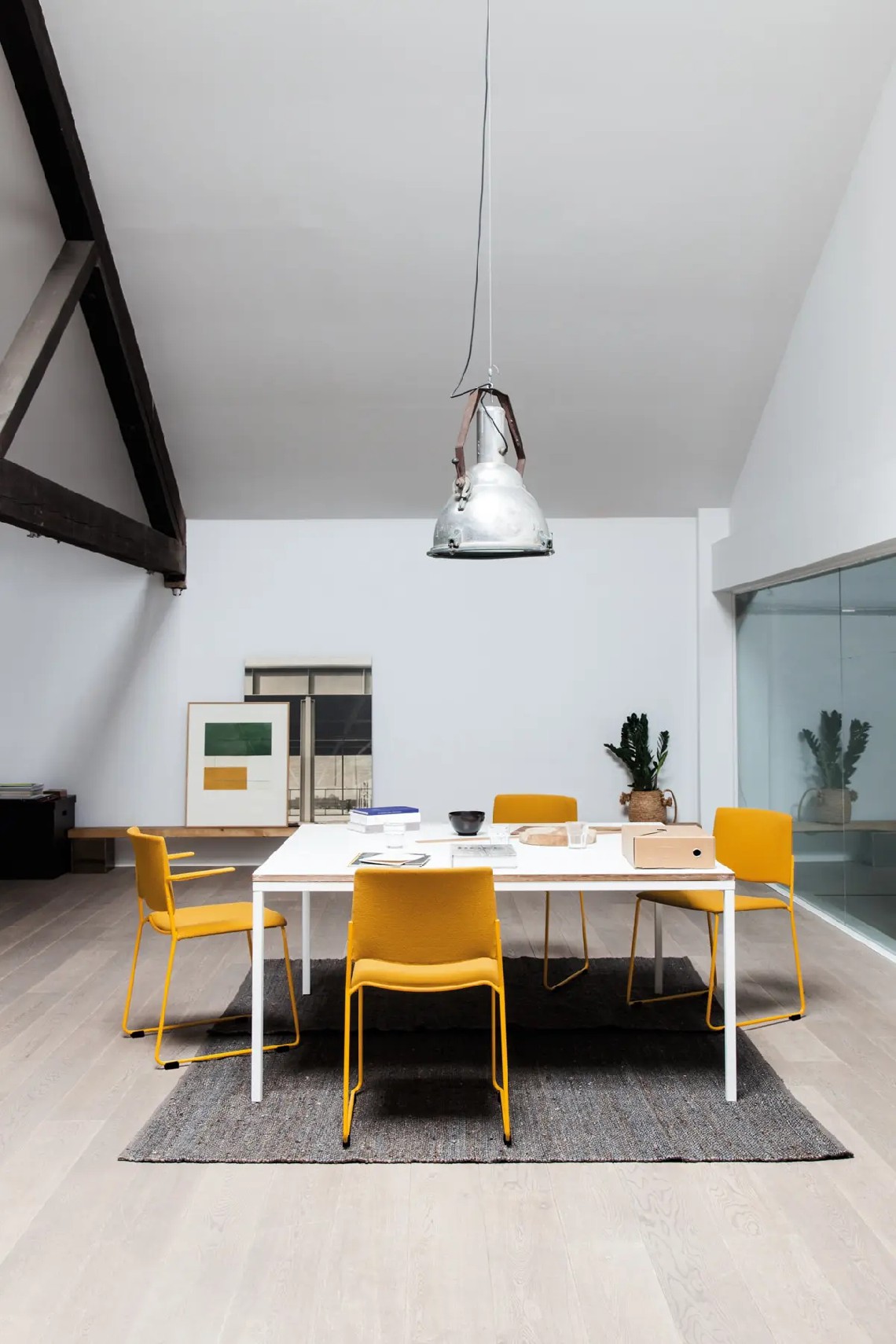 Ema chair with open backrest and arms is strong and lightweight and that allows to stack up to 45 units, which makes it perfect for all kind of spaces, in special for contract sector. The sledge steel structure and the aluminium arms can be chromed/polished or lacquered in any of our colours and the seat and backrest are available in polypropylene or upholstered. Besides, it has an upholstered seat pad available, which is very useful for multipurpose or crowded spaces, improving stacking by causing less friction than the full upholstery version. In this case, the stackability reaches up to 20 units on the trolley and 15 units on the floor.