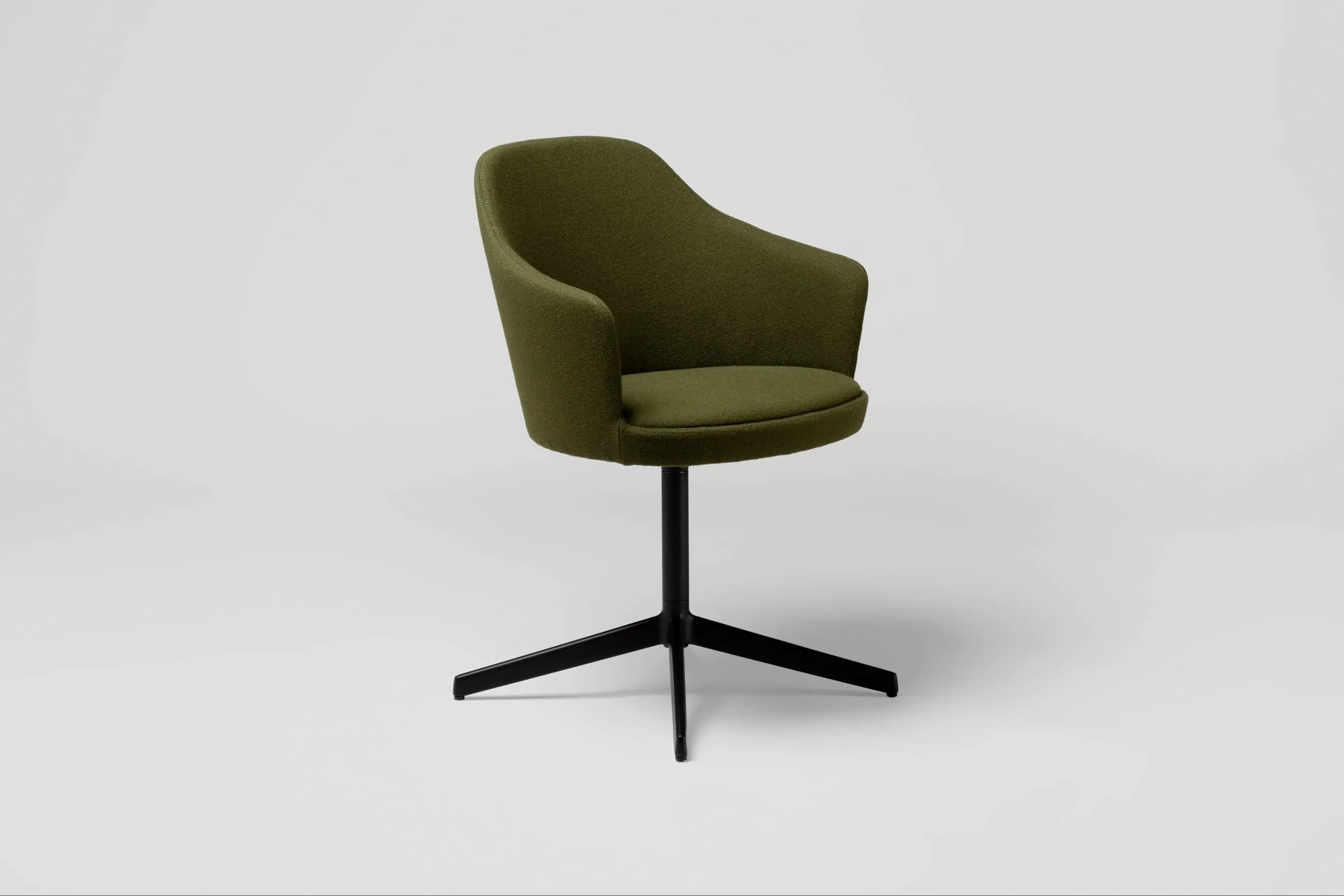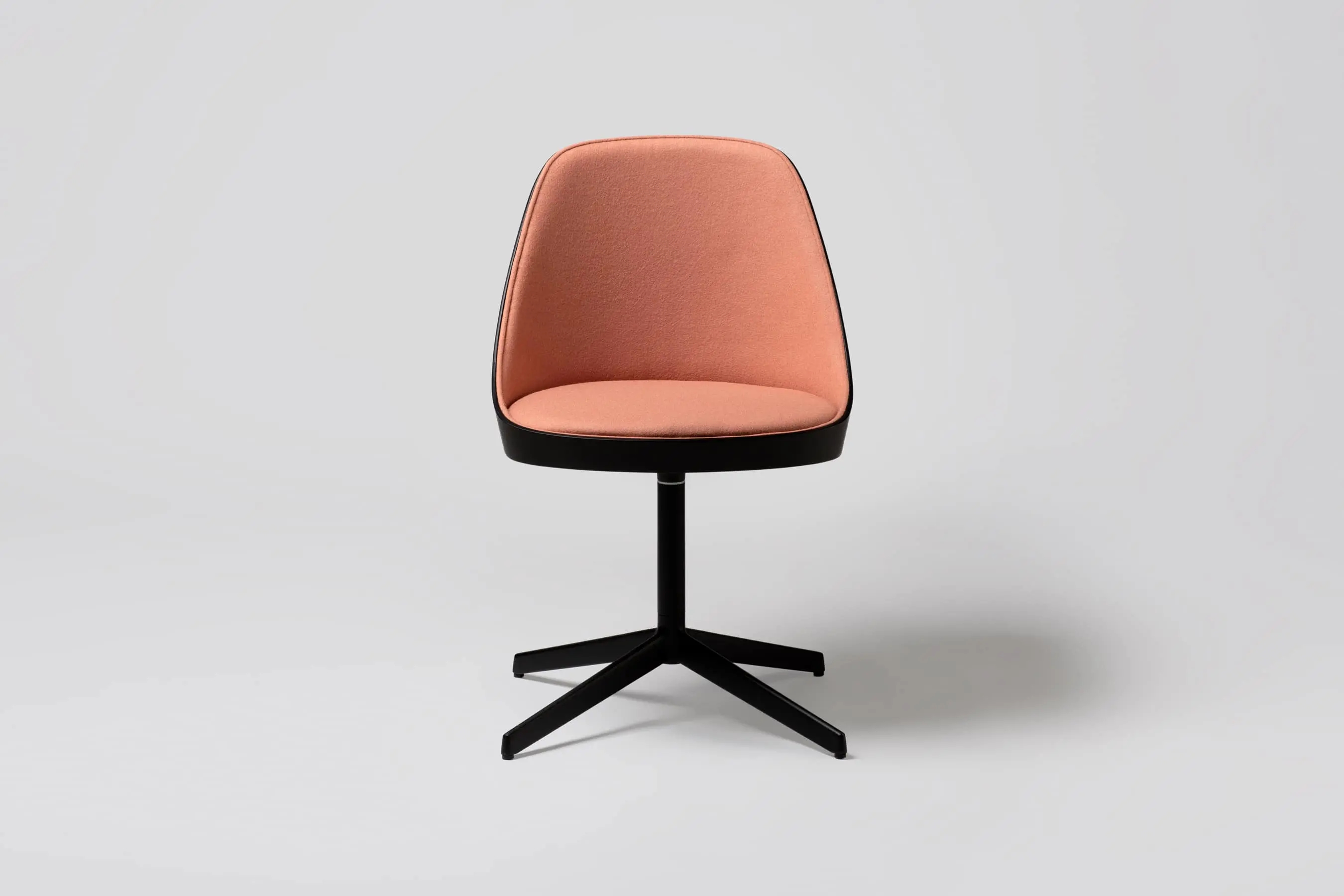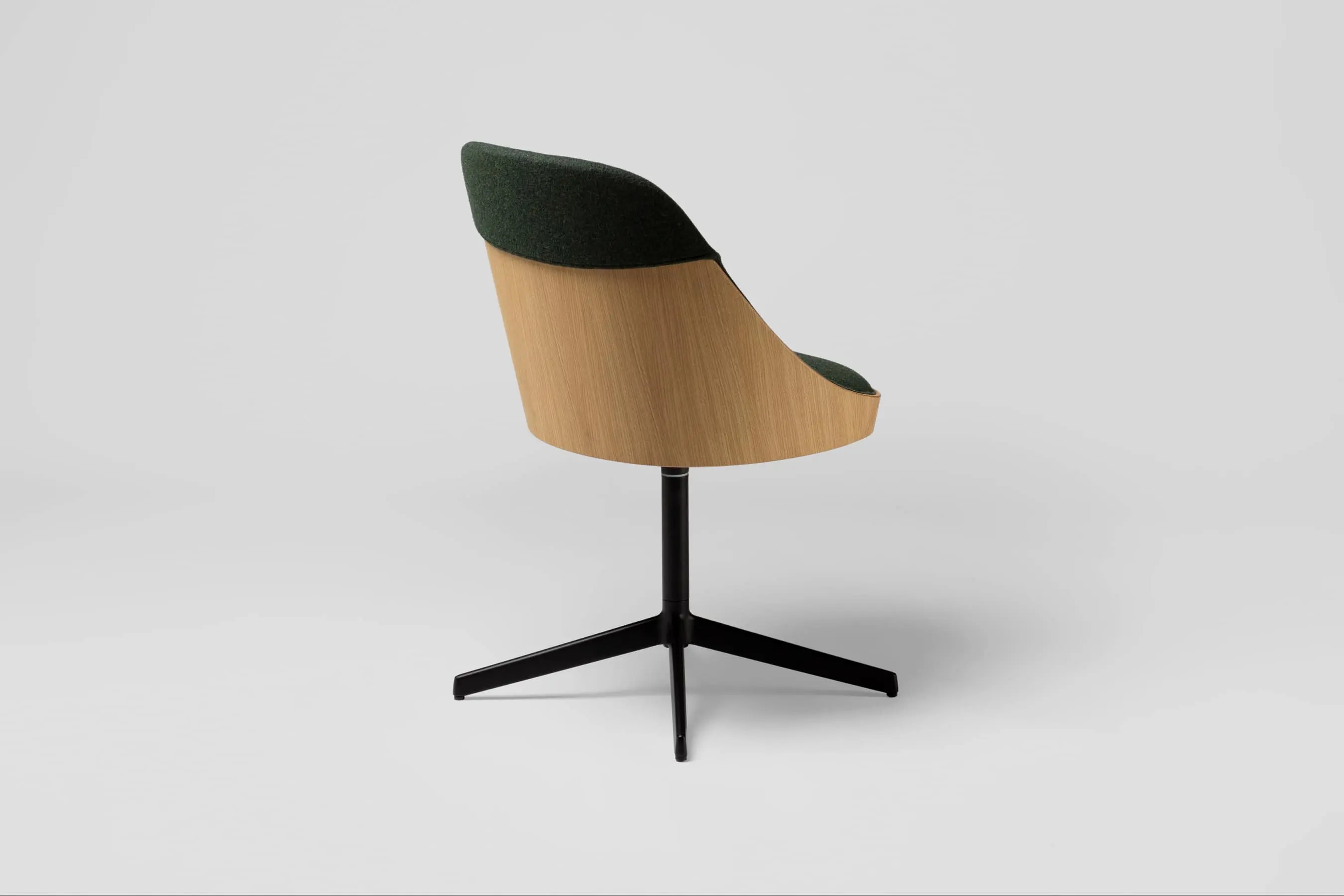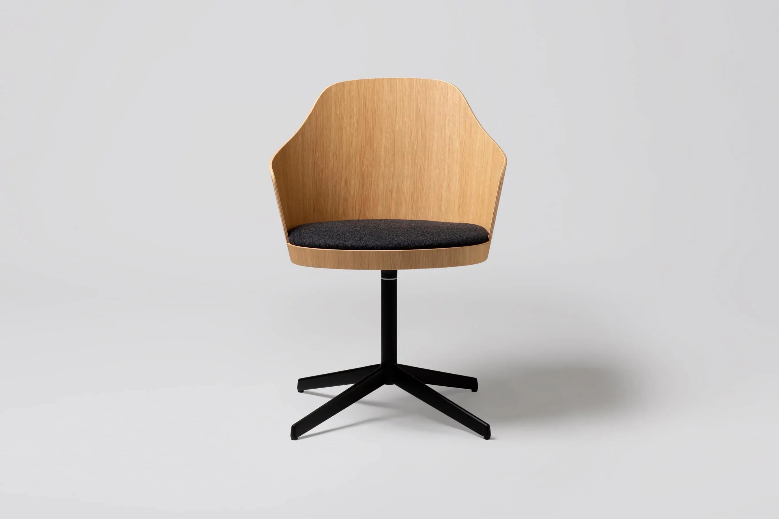 The shell of Kaiak confident chair, available with or without arms, is made of natural or stained oak wood and it has a broad range of upholstery options available: fully upholstered, upholstered seat, three quarters upholstered and inside upholstery. Its 4-star swivel structure can be lacquered in any of our colours.