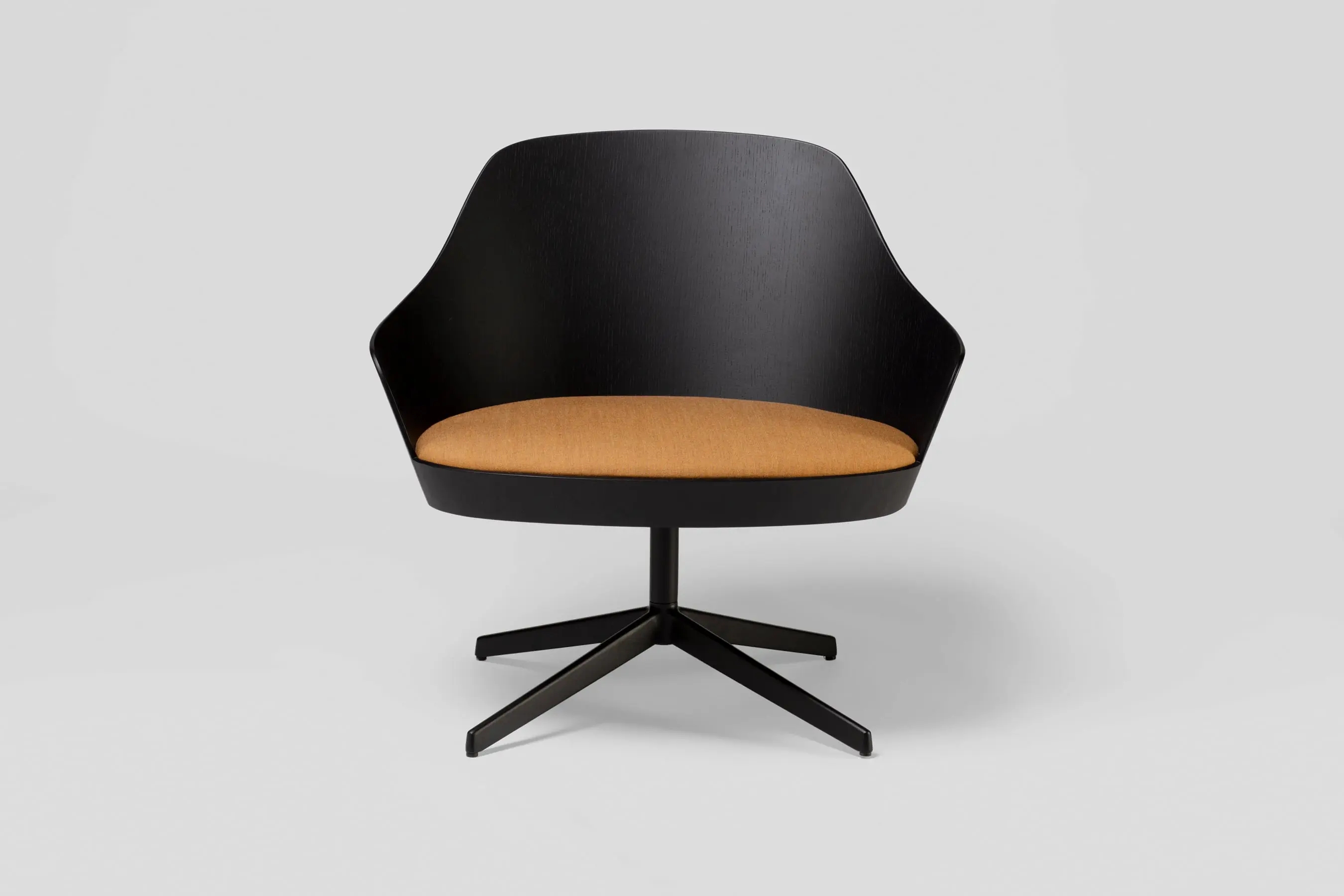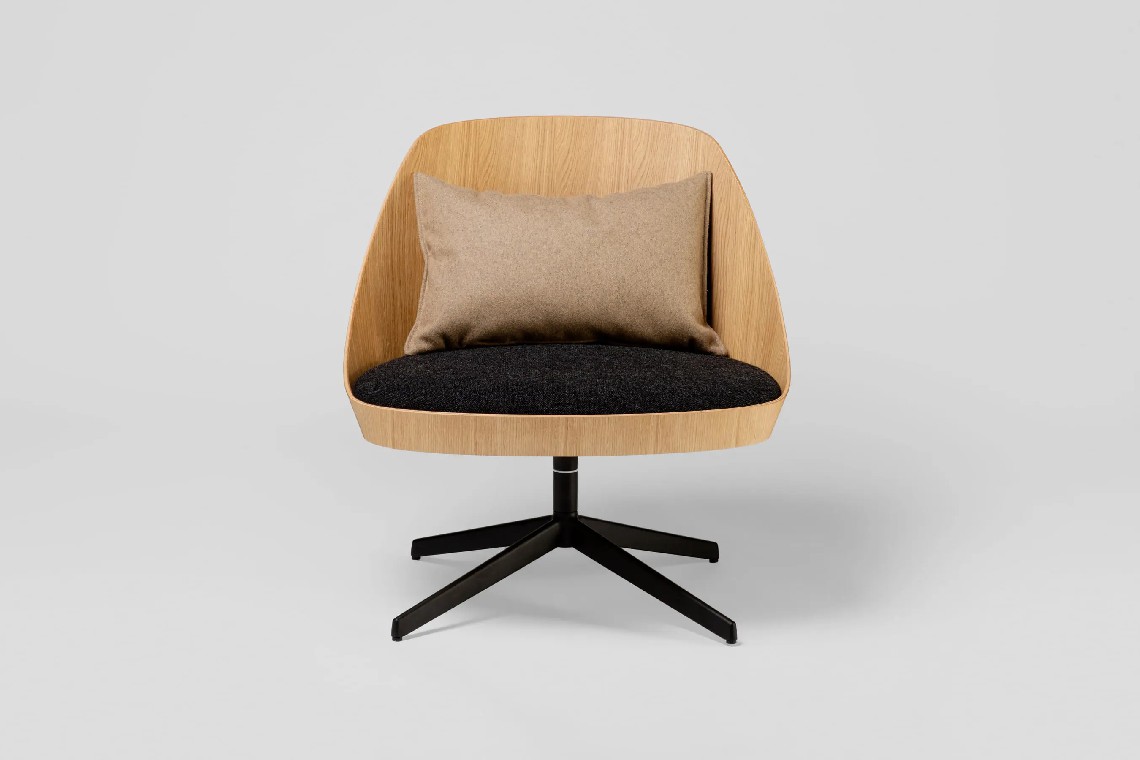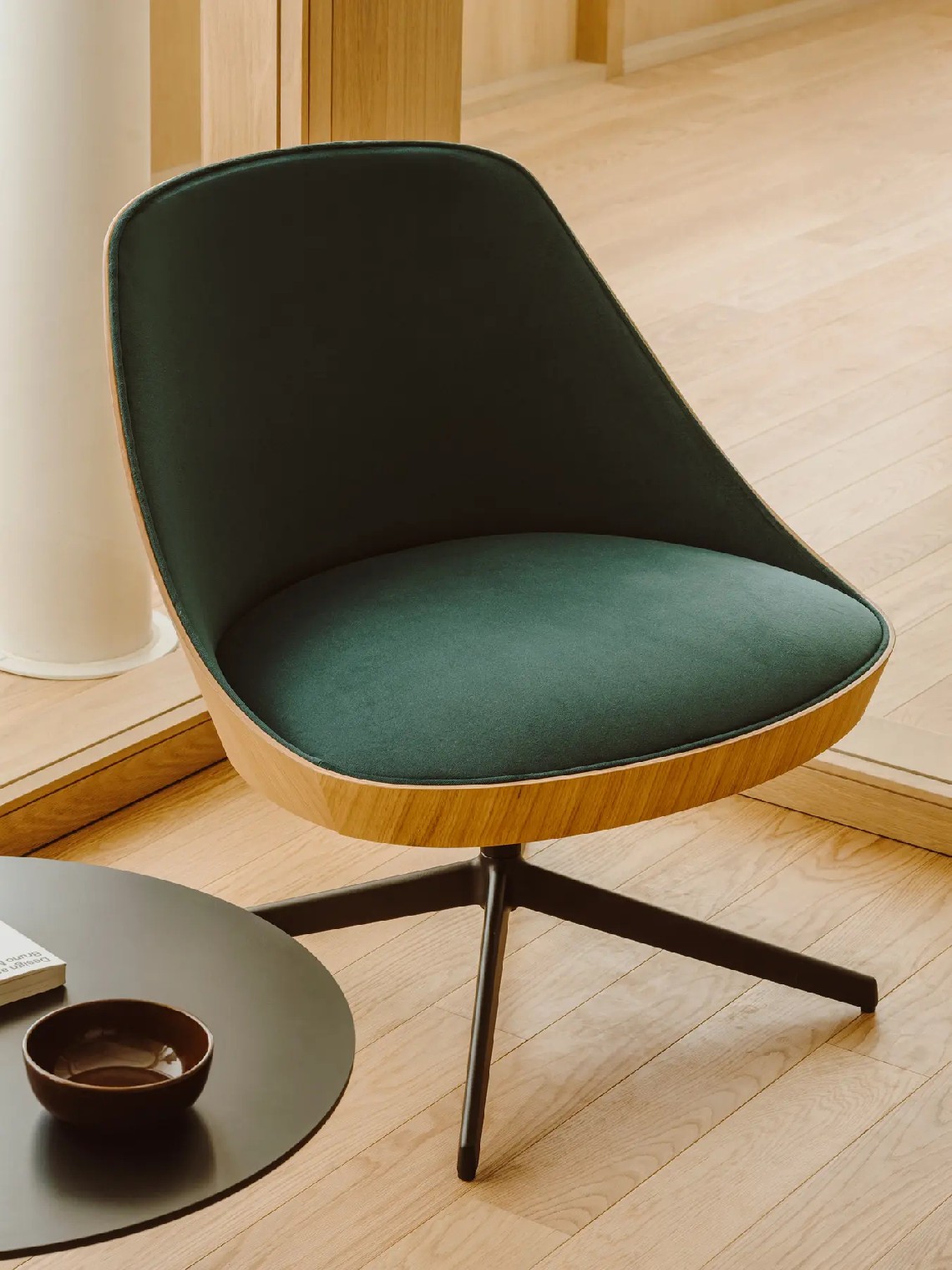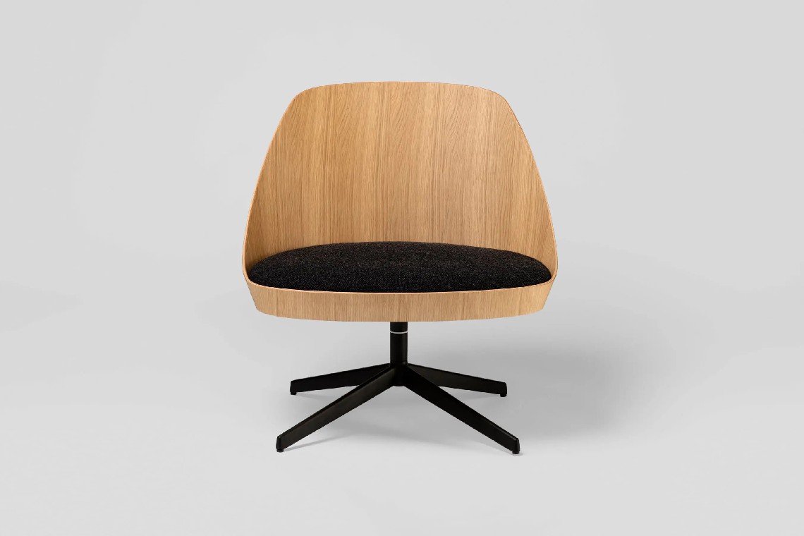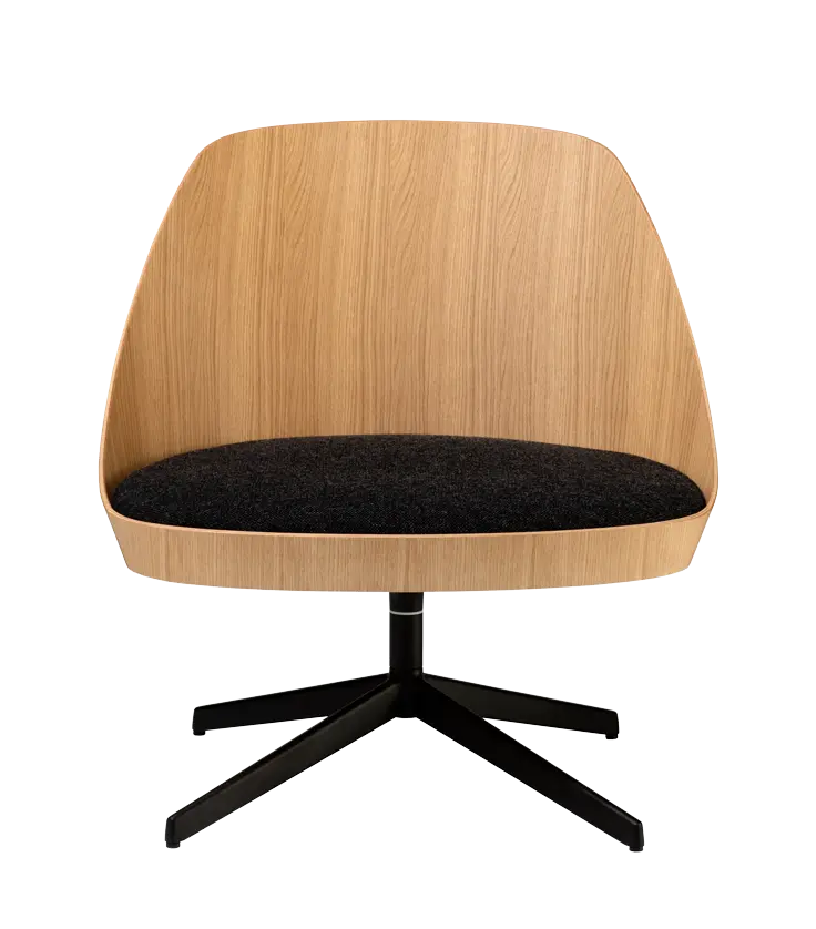 The shell of 4-star structure Kaiak lounge, available with or without arms, is made of natural or stained oak wood and has a broad range of upholstery options available: fully upholstered, upholstered seat and inside upholstery. Its swivel structure can be lacquered in any of our colours.