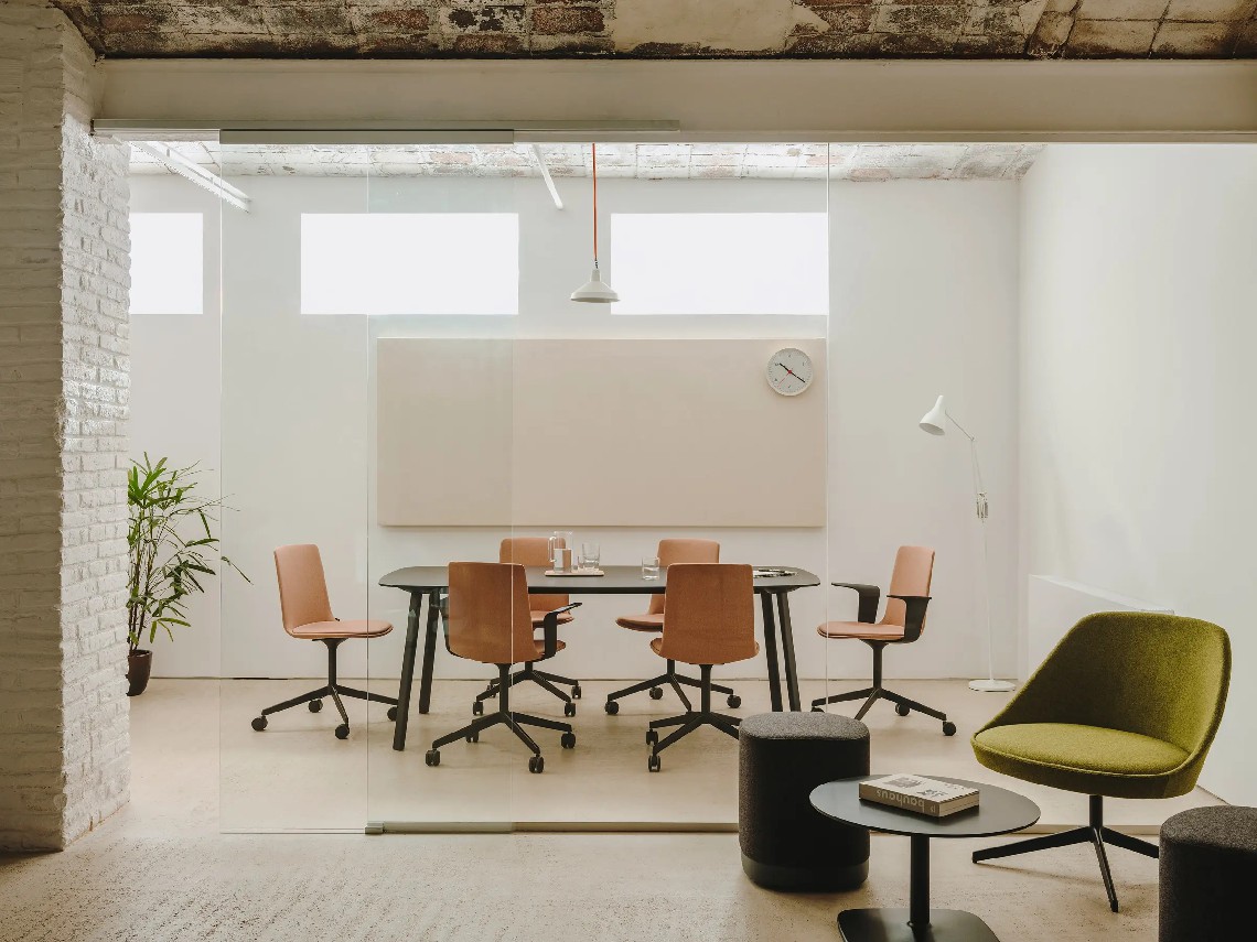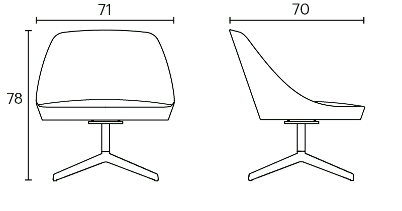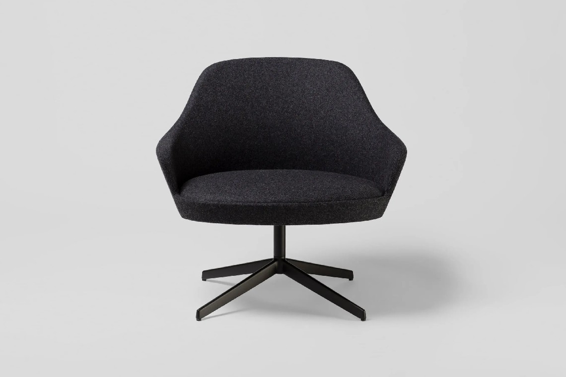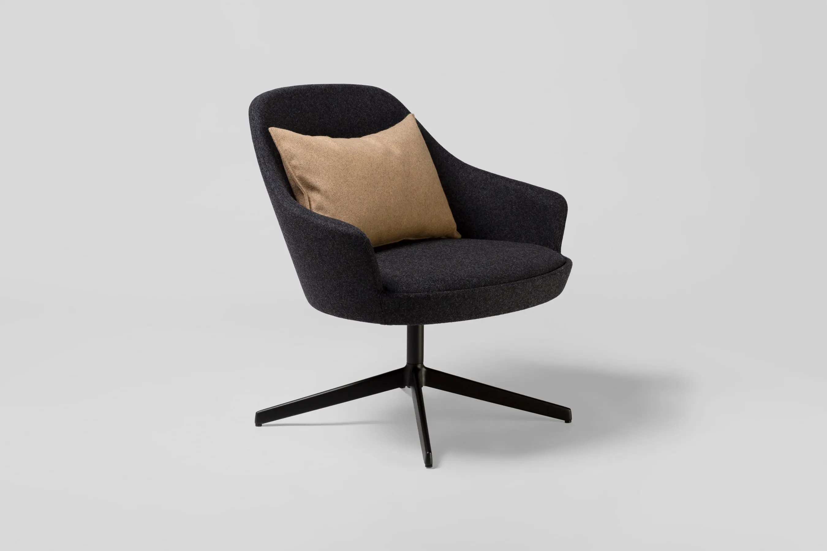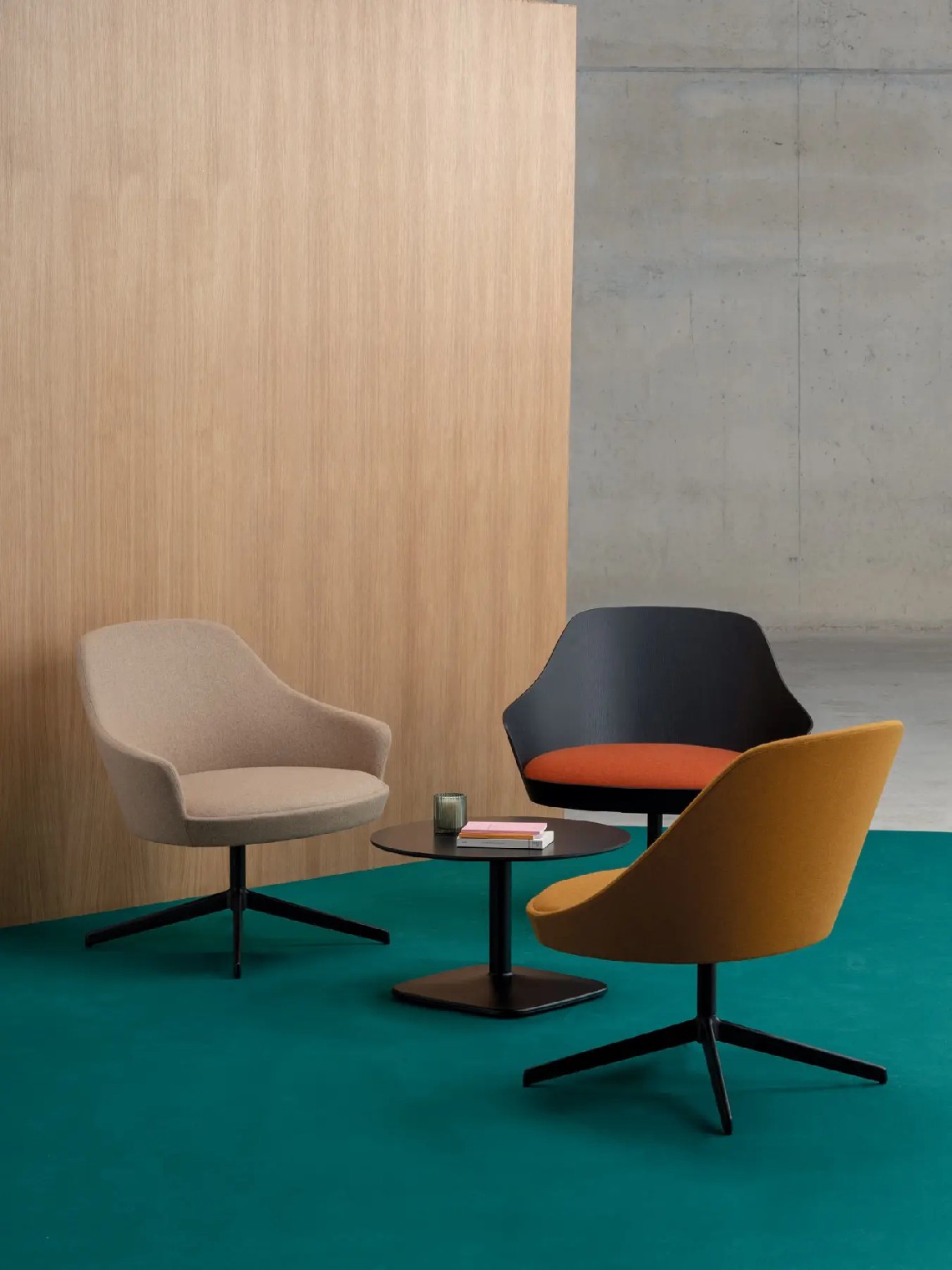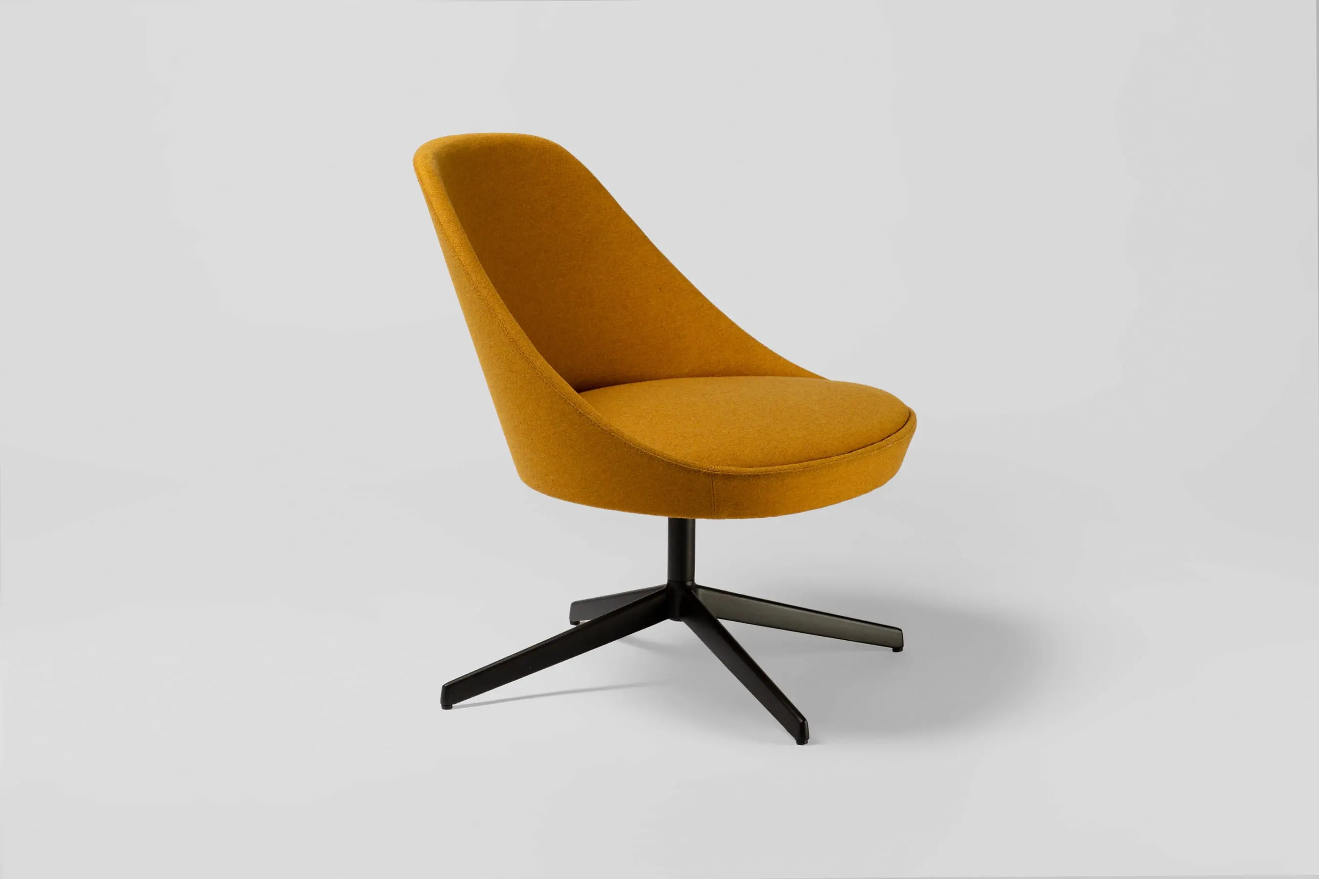 The shell of 4-star structure Kaiak lounge, available with or without arms, is made of natural or stained oak wood and has a broad range of upholstery options available: fully upholstered, upholstered seat and inside upholstery. Its swivel structure can be lacquered in any of our colours.