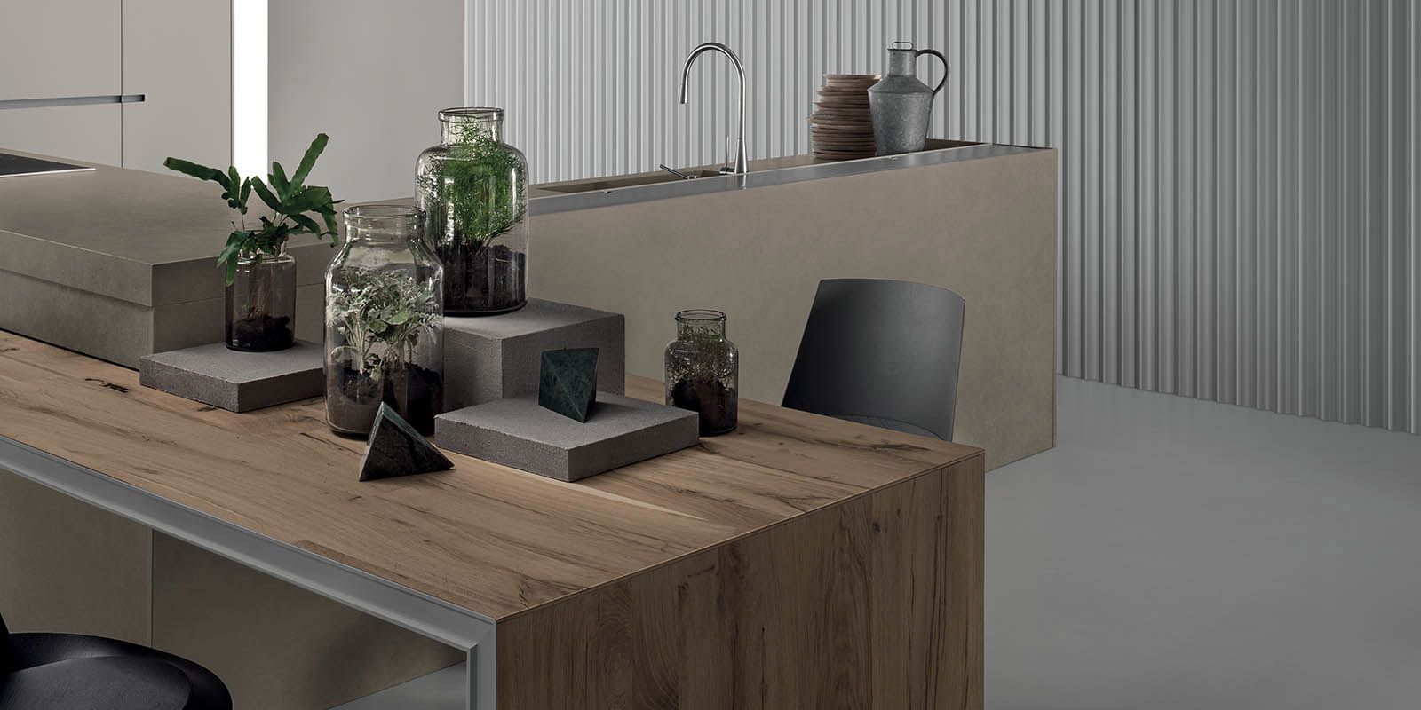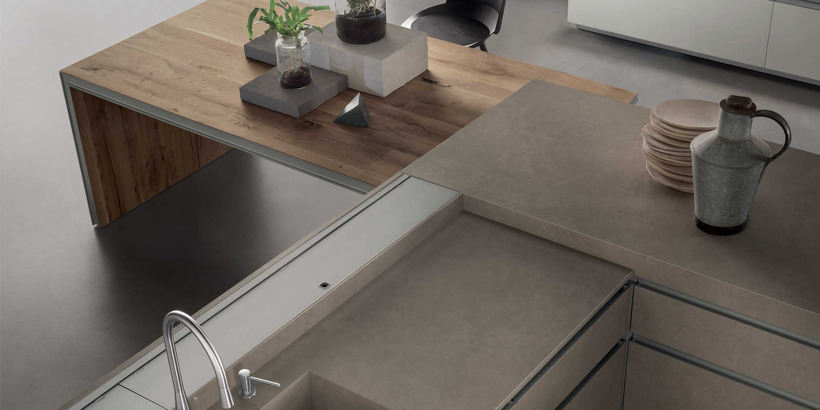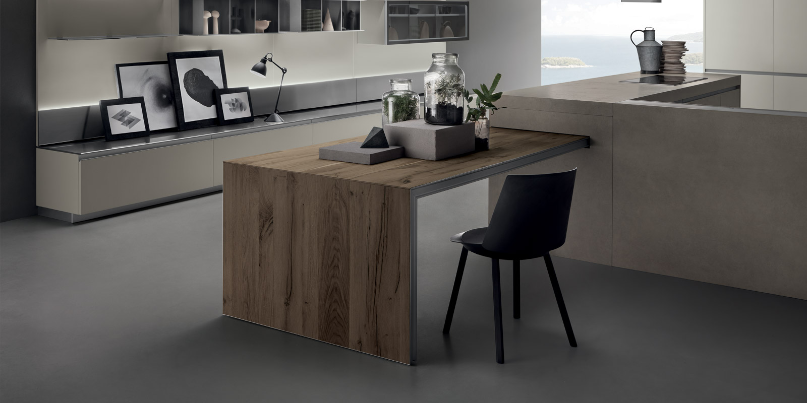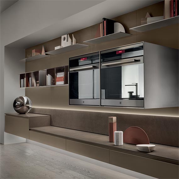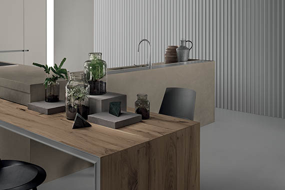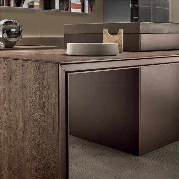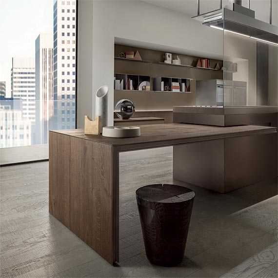 滑動(dòng)島臺(tái)采用多節(jié)的橡木飾面,鋁漆結(jié)構(gòu)呈現(xiàn)棕色金屬效果。