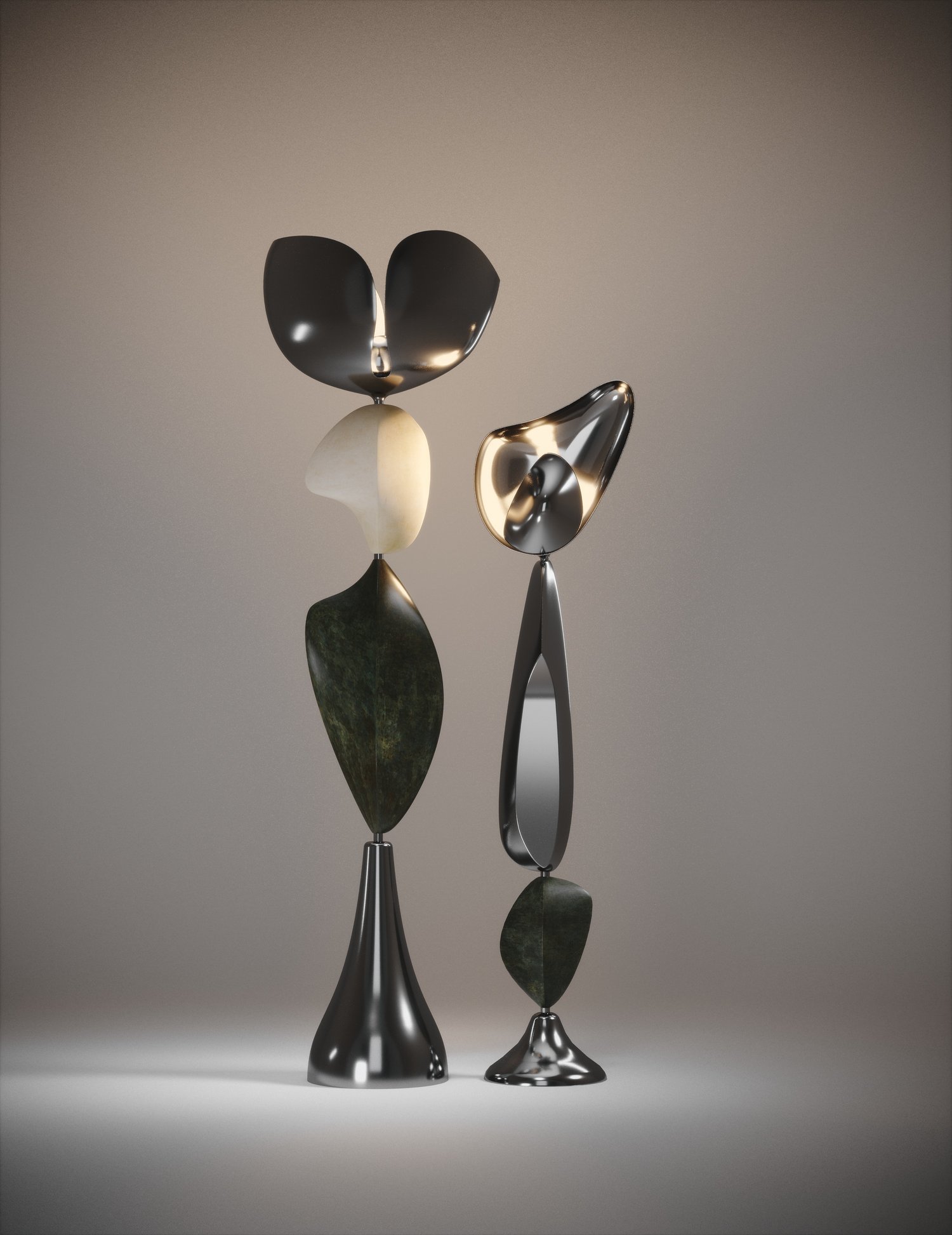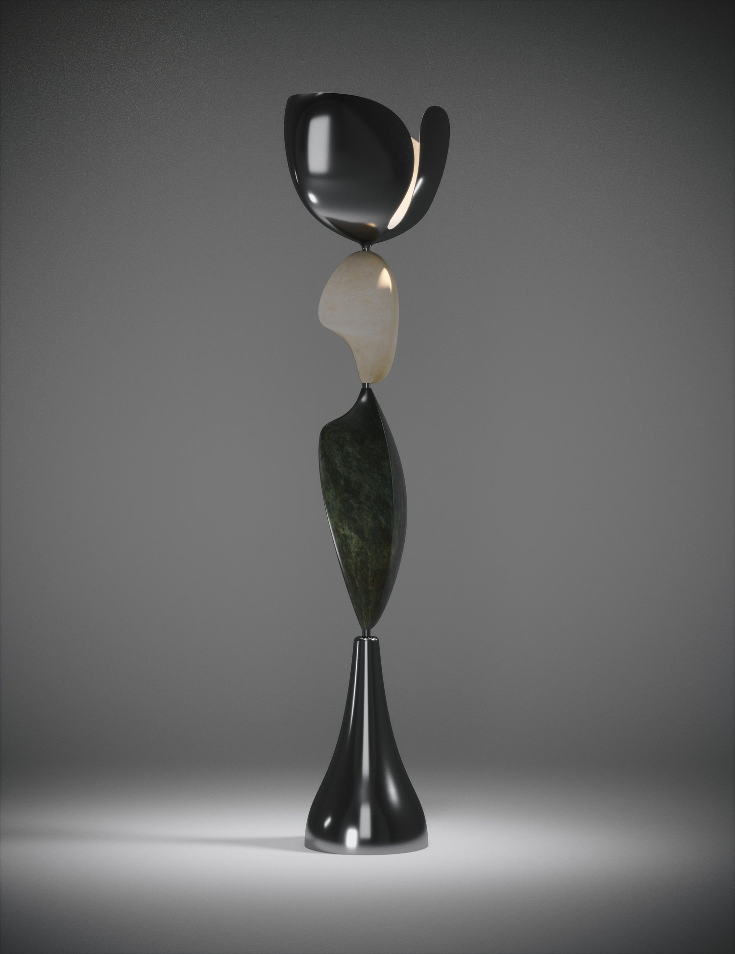 The Cosmo Sky and Cosmo Moon floor lamps by Kifu Paris are whimsical and sculptural pieces, inlaid in bronze-patina brass and each with a beautiful parchment or shell inlaid piece. The amorphous shapes are an abstract and poetic reinterpretation of a star-filled cosmic sky. This piece is a part of the Cosmo II Capsule, see images at end of slide. This piece is designed by Kifu Augousti, the daughter of Ria and Yiouri Augousti.