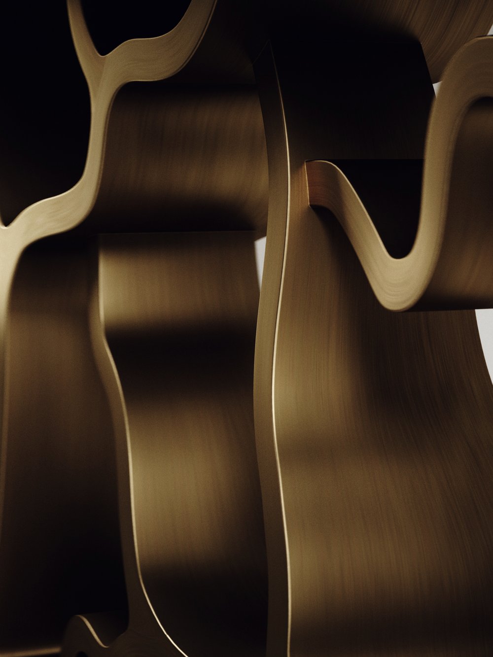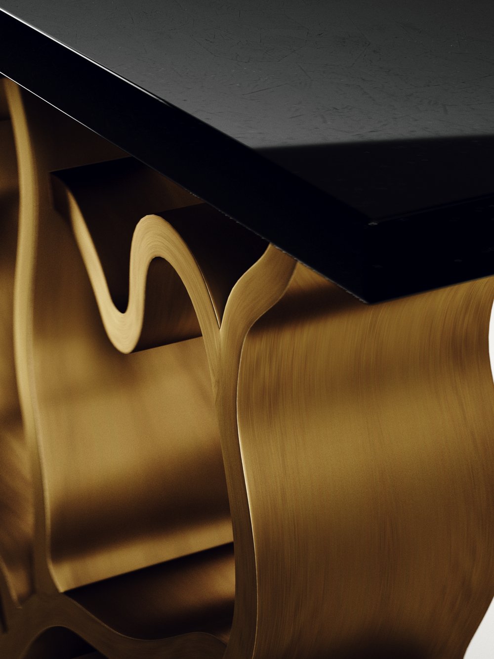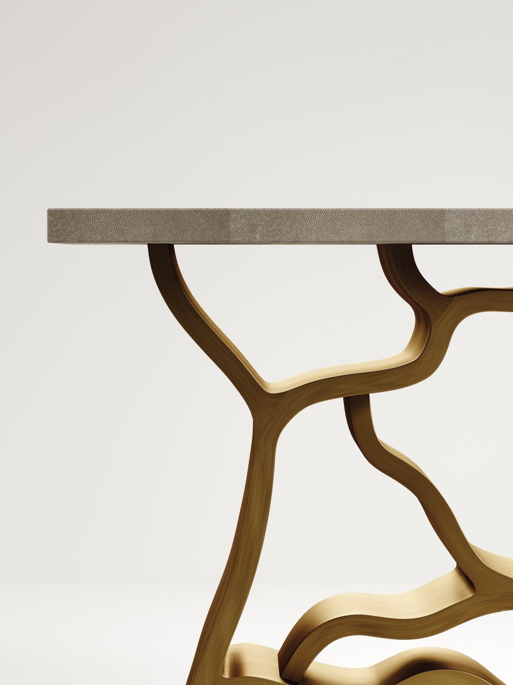 The Leaf Console Table by Kifu Paris is a dramatic and organic piece. The cream shagreen inlaid rectangle top sits on a striking bronze-patina brass base that emulates intertwining branches. This piece is designed by Kifu Augousti the daughter of Ria and Yiouri Augousti. Available in other finishes.