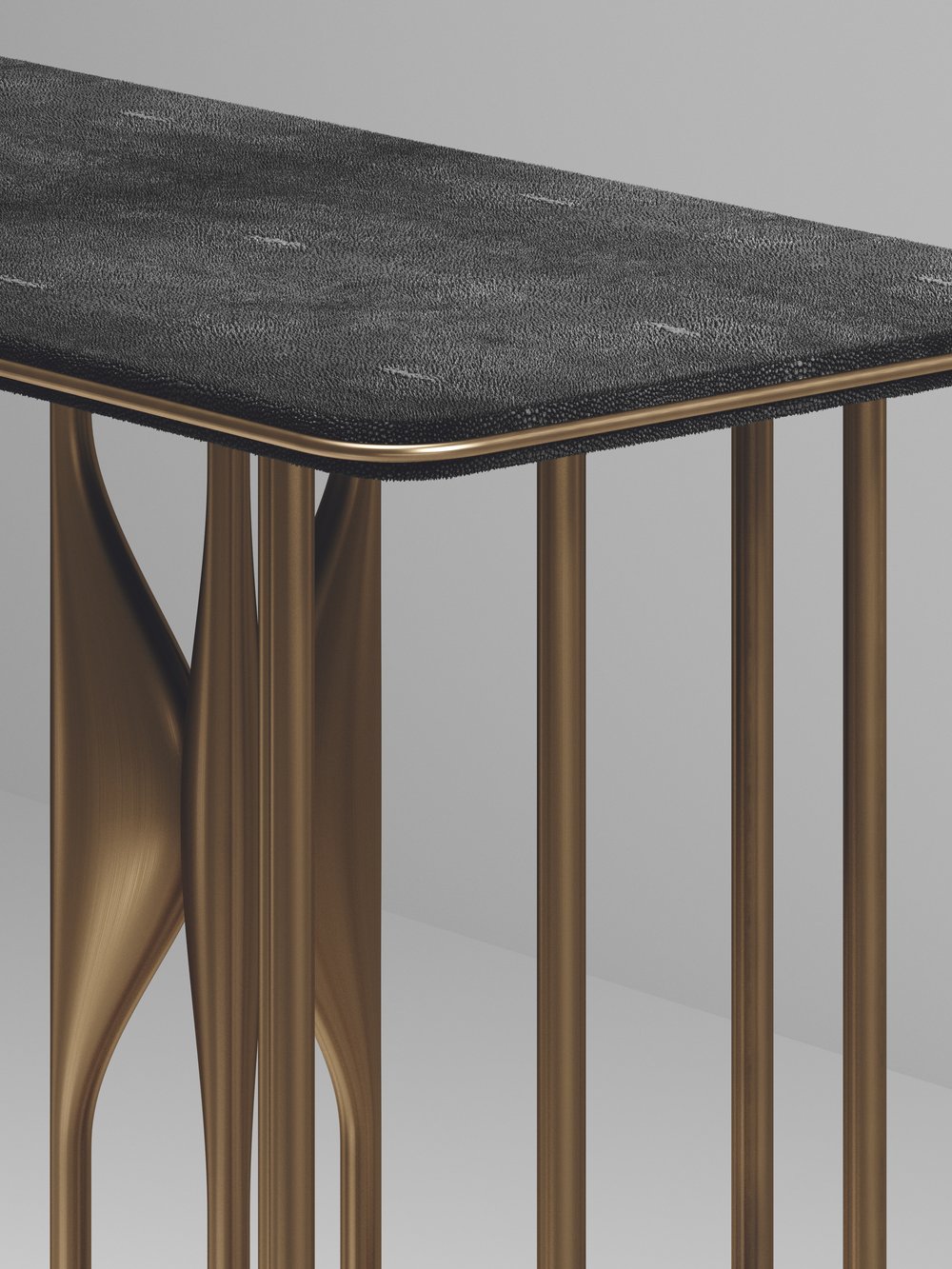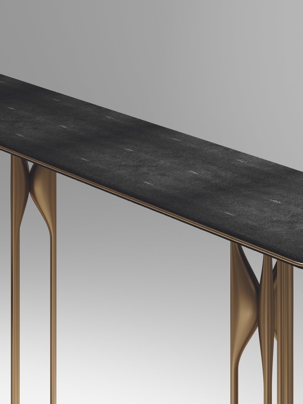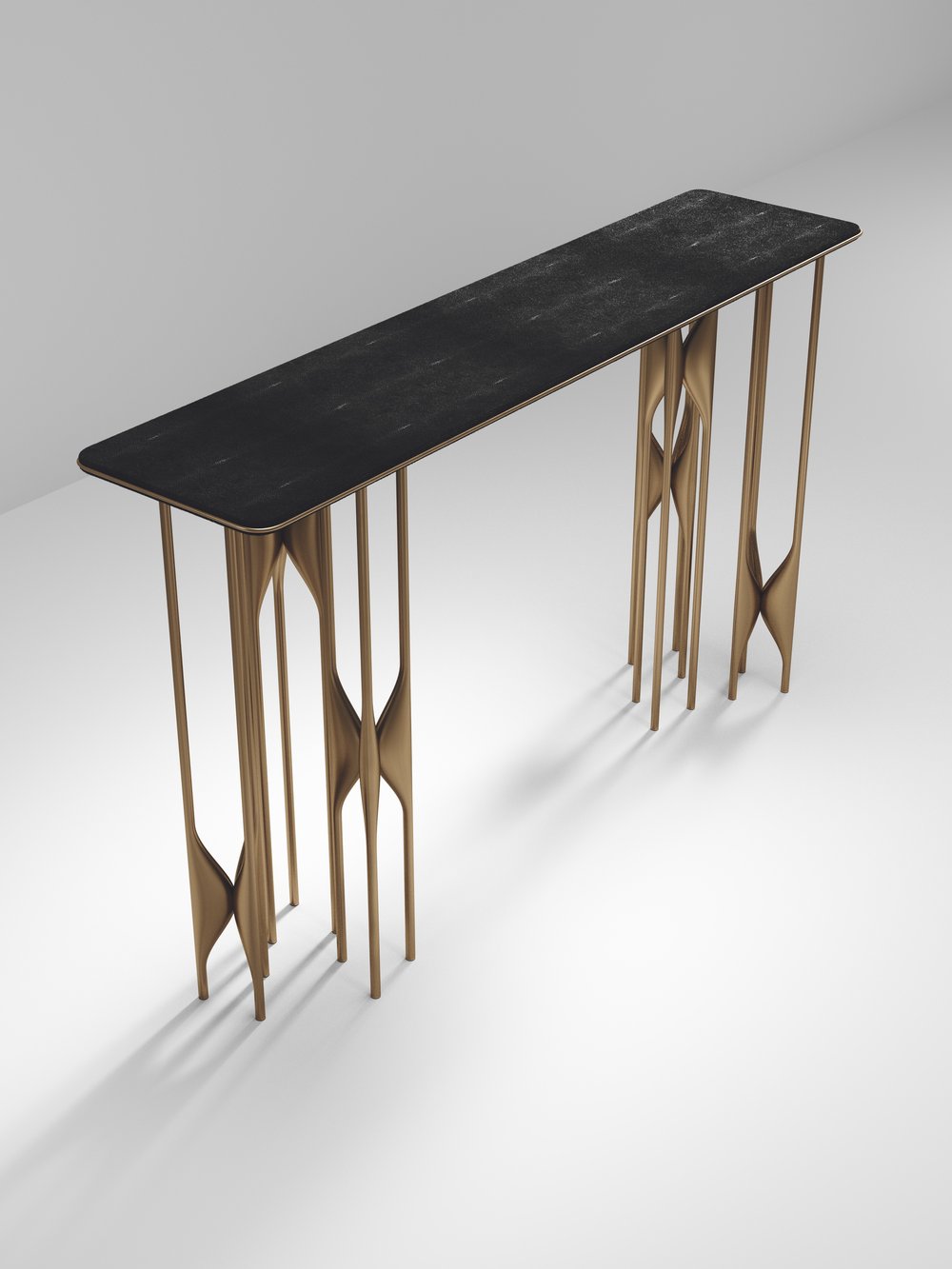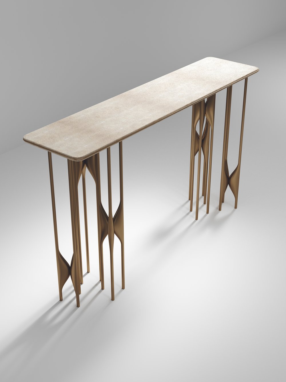 The Plumeria Console by Kifu Paris is a dramatic and sculptural piece. The cream shagreen inlaid top sits on clusters of bronze-patina brass legs that are conceptually inspired by bird feathers floating on top of a lake. The border of the top is accentuated by a subtle and elegant bronze-patina brass indentation detail. This piece is designed by Kifu Augousti the daughter of Ria and Yiouri Augousti. Available in other finishes. Part of the Plumeria Capsule.