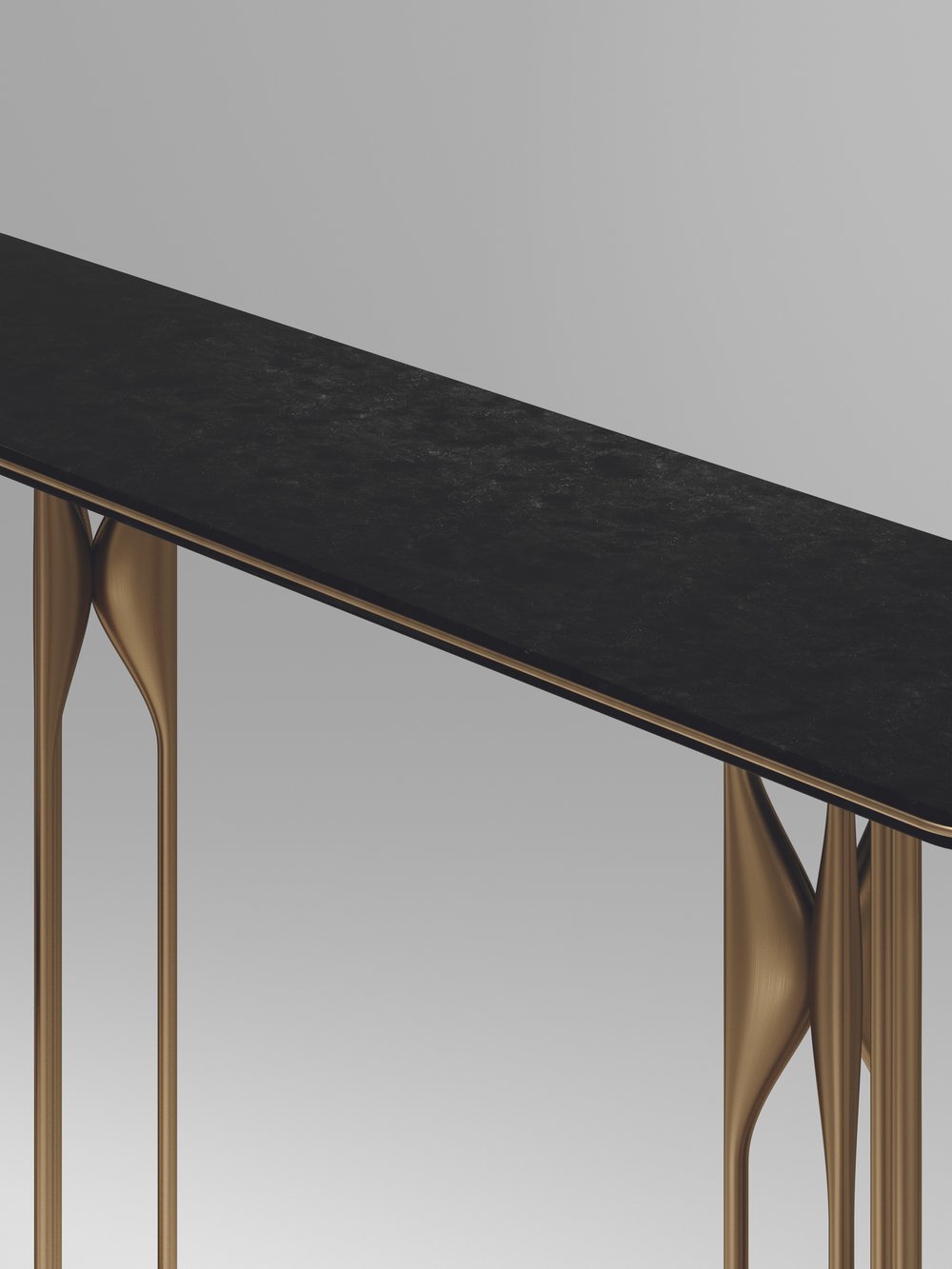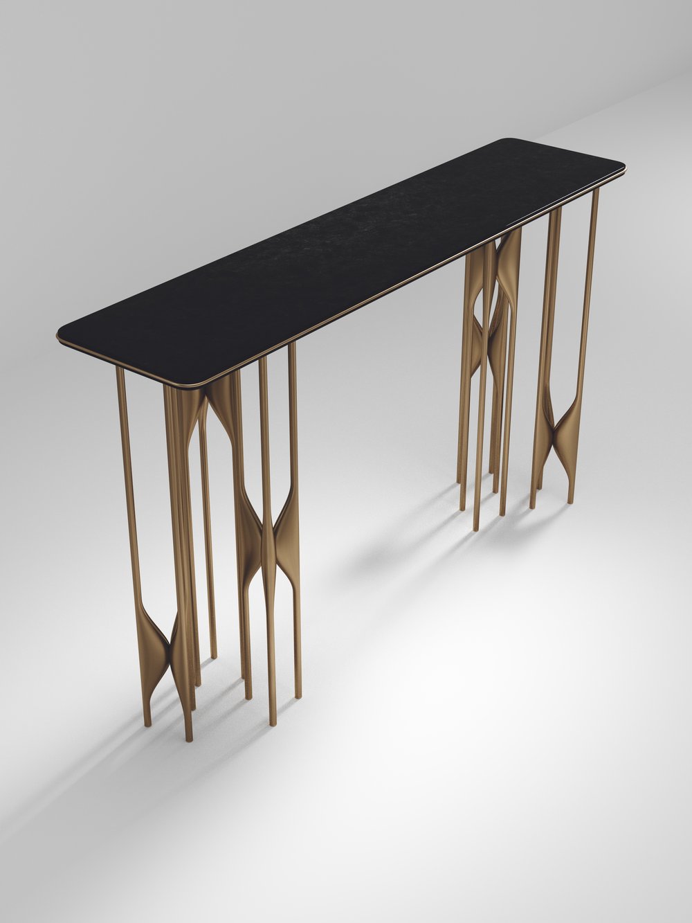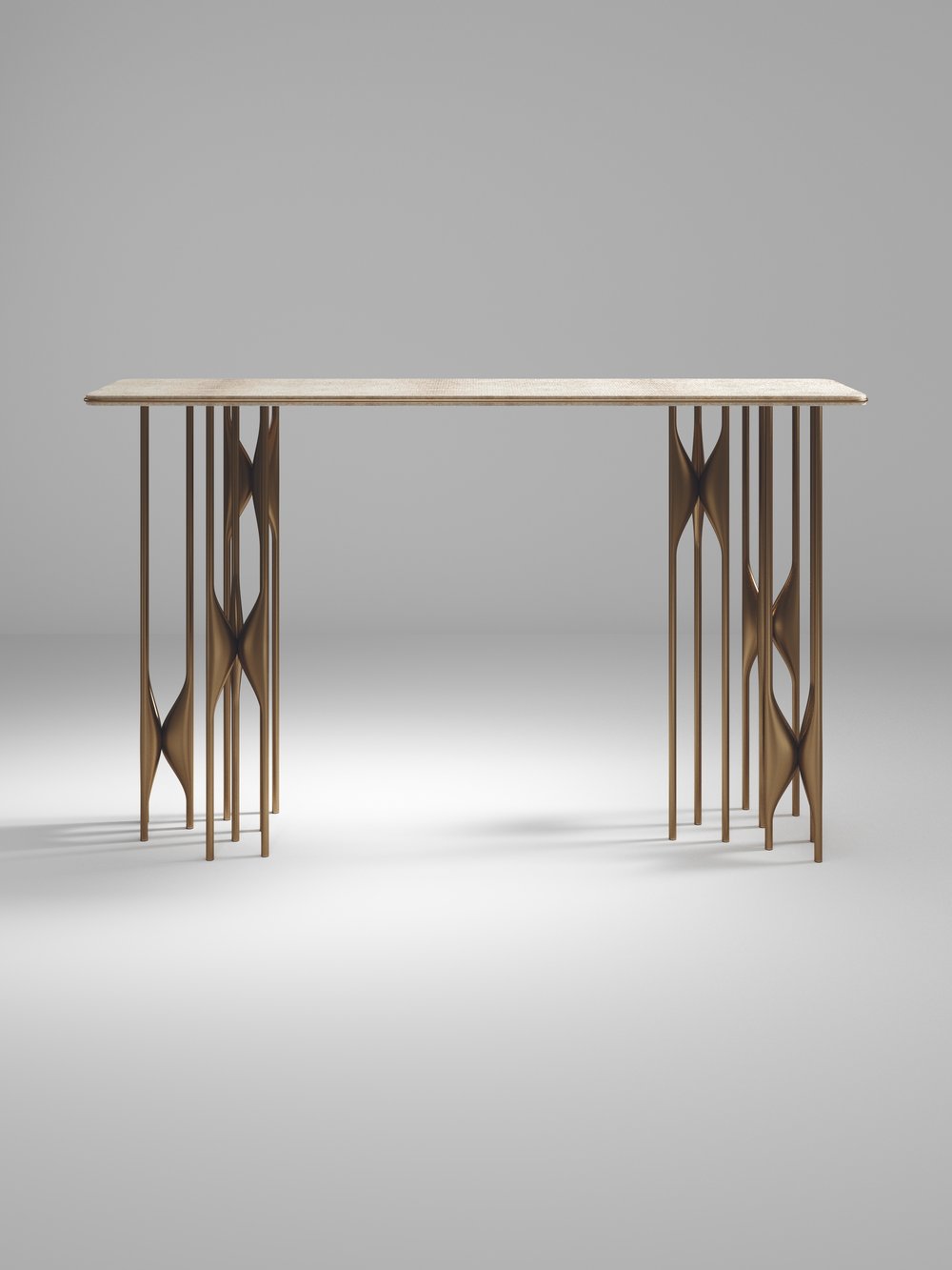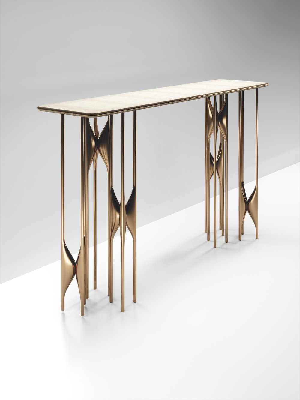 The Plumeria Console by Kifu Paris is a dramatic and sculptural piece. The cream shagreen inlaid top sits on clusters of bronze-patina brass legs that are conceptually inspired by bird feathers floating on top of a lake. The border of the top is accentuated by a subtle and elegant bronze-patina brass indentation detail. This piece is designed by Kifu Augousti the daughter of Ria and Yiouri Augousti. Available in other finishes. Part of the Plumeria Capsule.