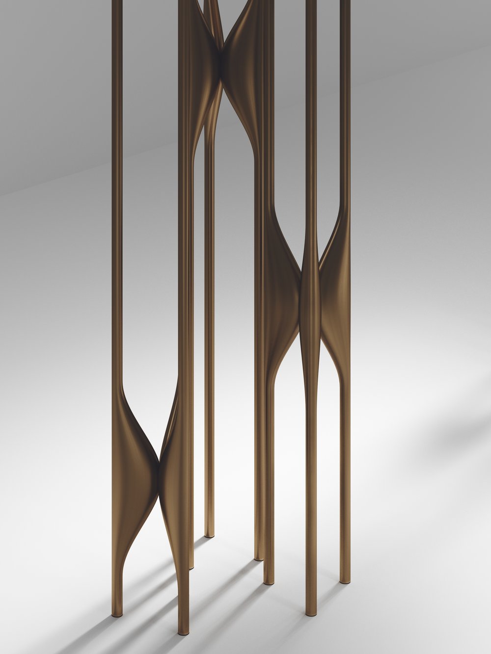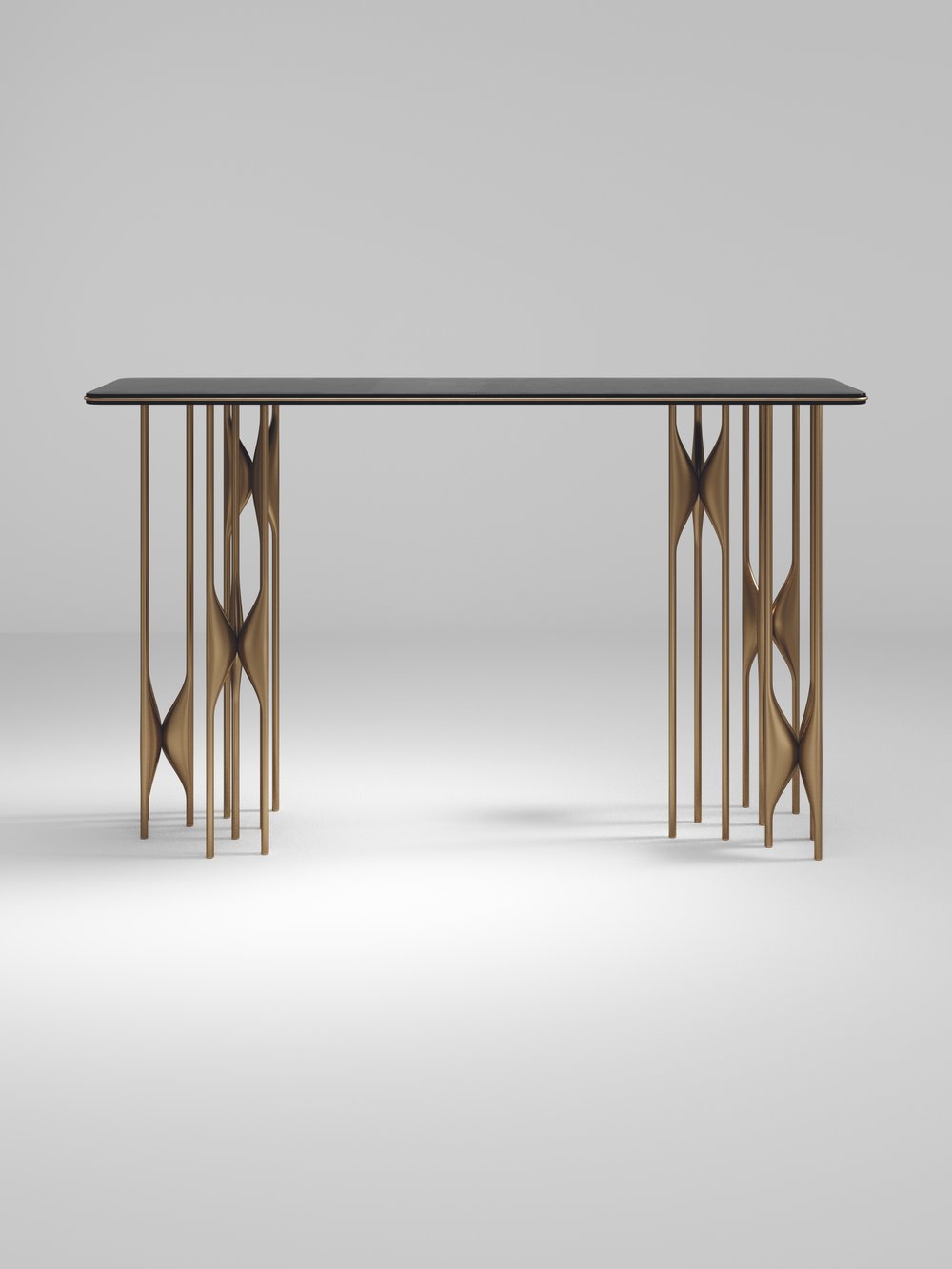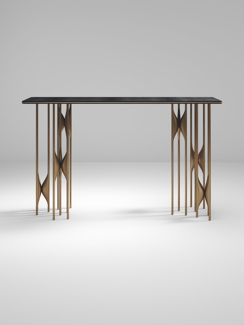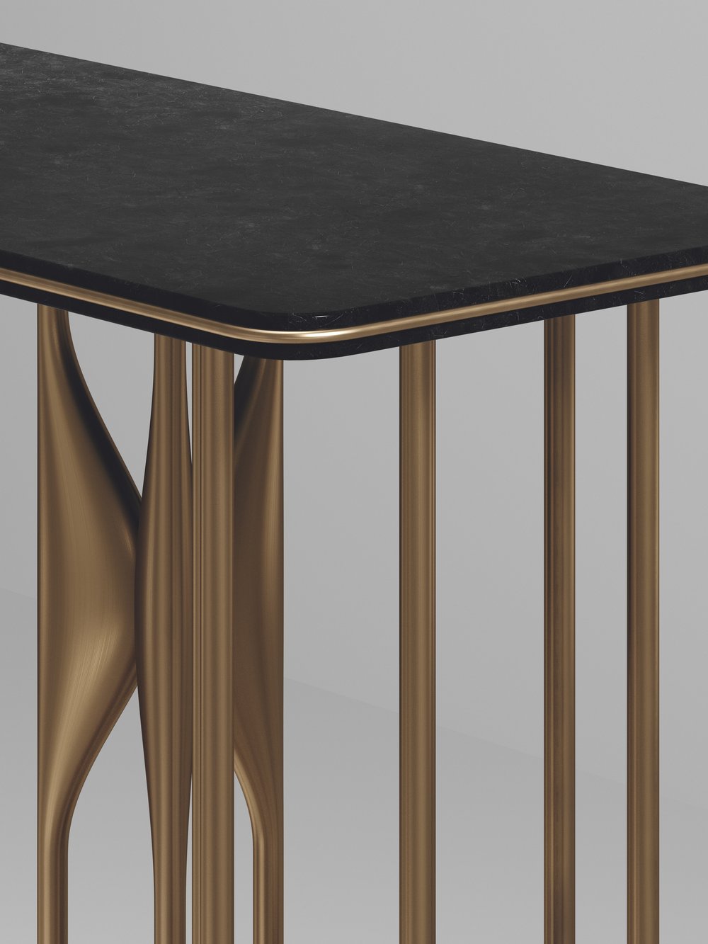 The Plumeria Console by Kifu Paris is a dramatic and sculptural piece. The cream shagreen inlaid top sits on clusters of bronze-patina brass legs that are conceptually inspired by bird feathers floating on top of a lake. The border of the top is accentuated by a subtle and elegant bronze-patina brass indentation detail. This piece is designed by Kifu Augousti the daughter of Ria and Yiouri Augousti. Available in other finishes. Part of the Plumeria Capsule.