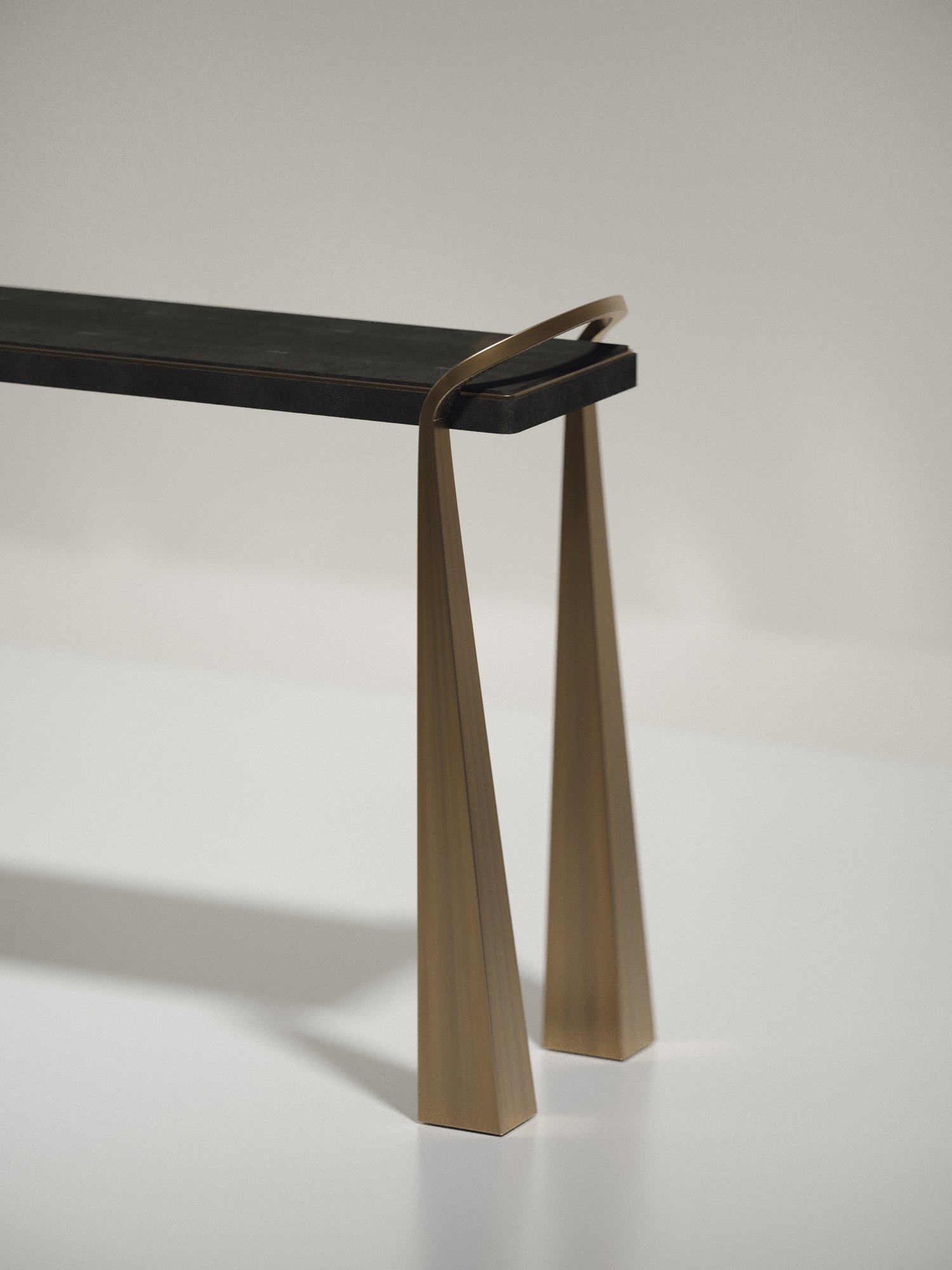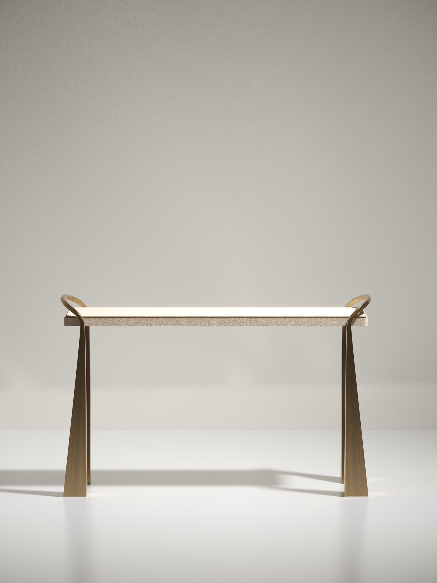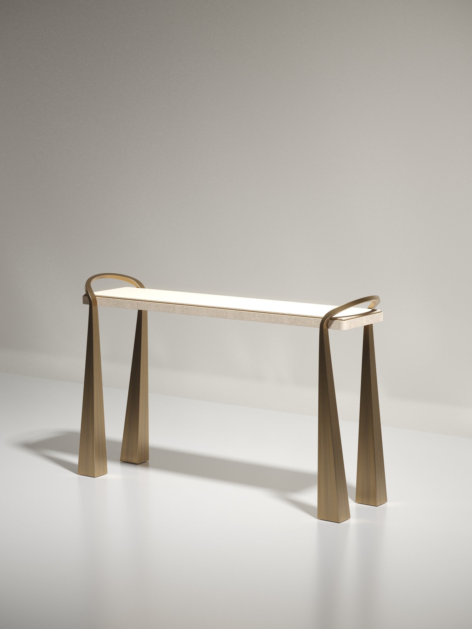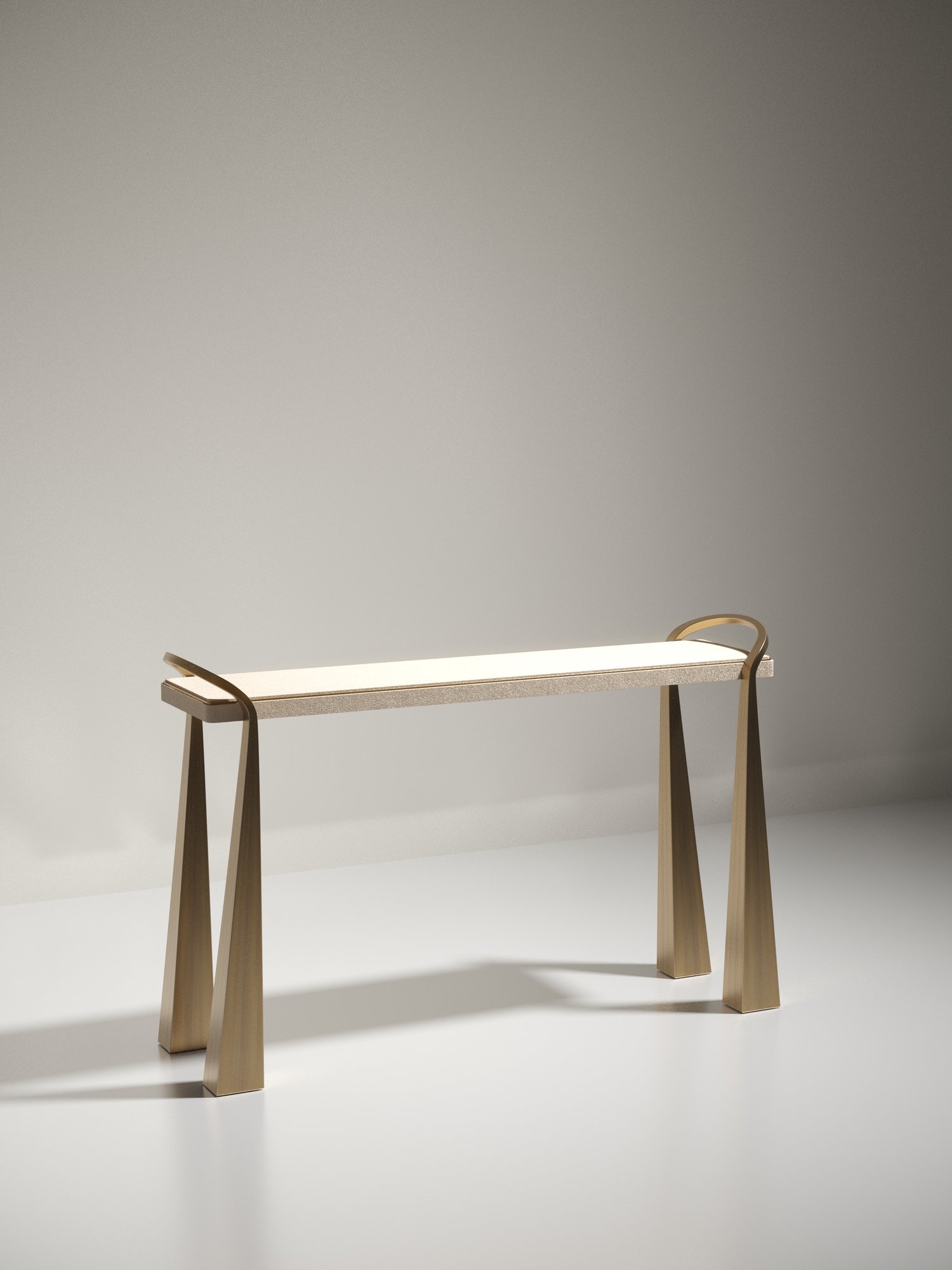 The Arche Console table by R&Y Augousti is a stunning piece, a statement in any space. The cream shagreen inlaid top is nestled in between a pair of bronze-patina brass sculptural cutout "arched" legs. This design also exists on a side table, breakfast table and game table version, see images at end of slide.