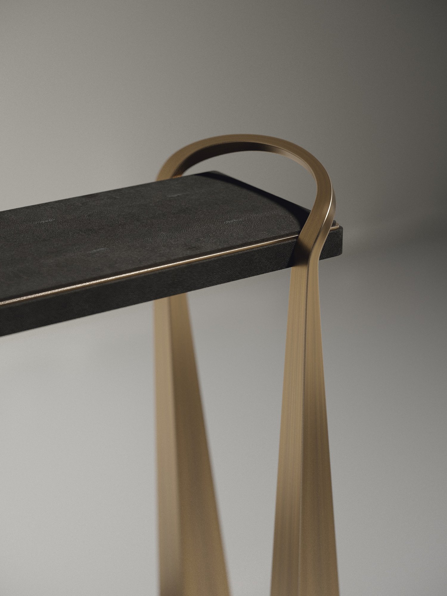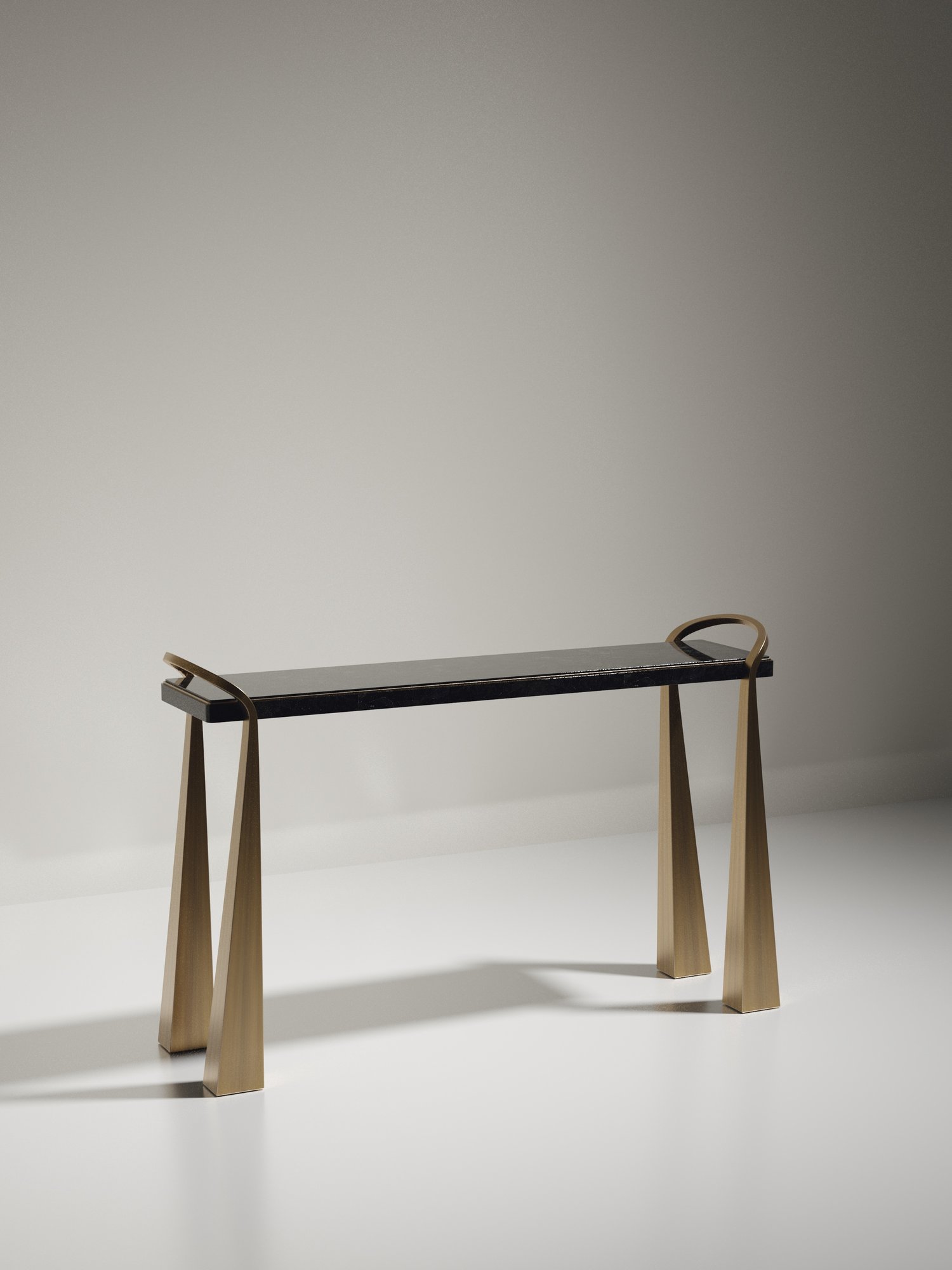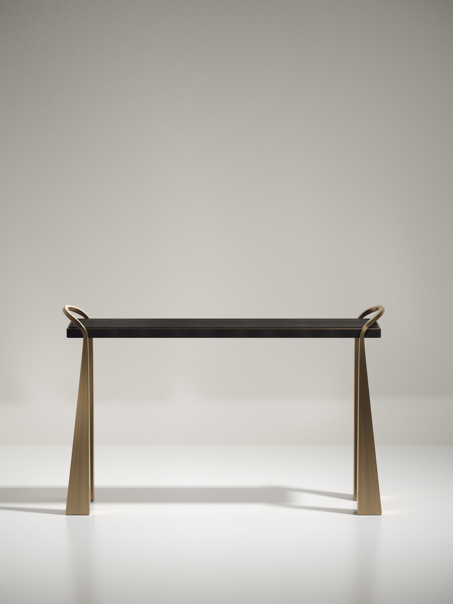 The Arche Console table by R&Y Augousti is a stunning piece, a statement in any space. The cream shagreen inlaid top is nestled in between a pair of bronze-patina brass sculptural cutout "arched" legs. This design also exists on a side table, breakfast table and game table version, see images at end of slide.