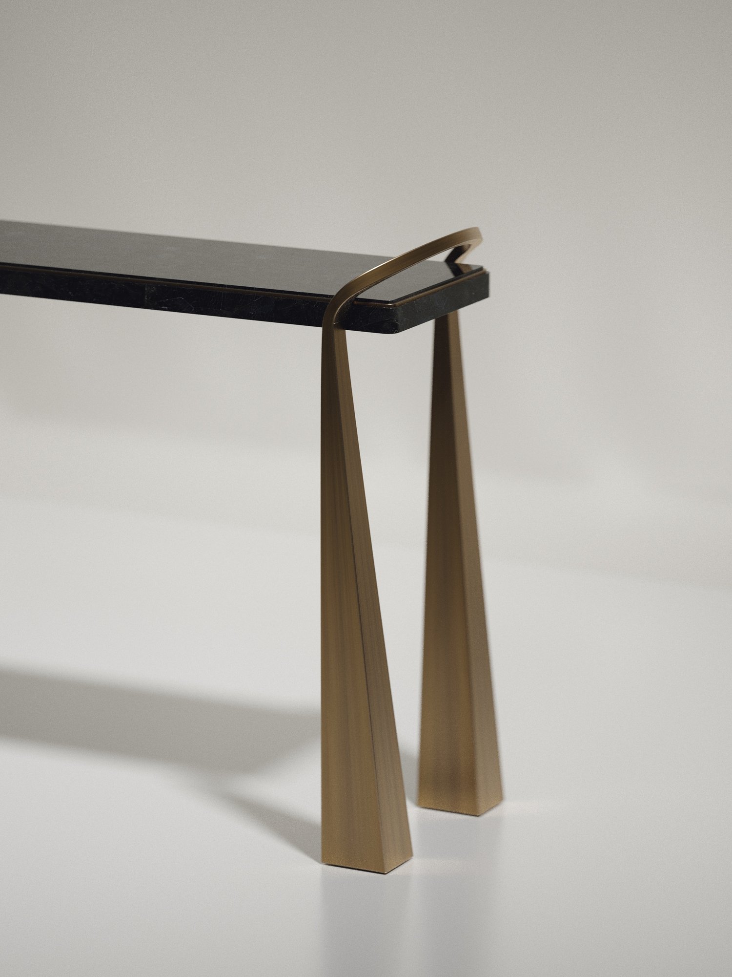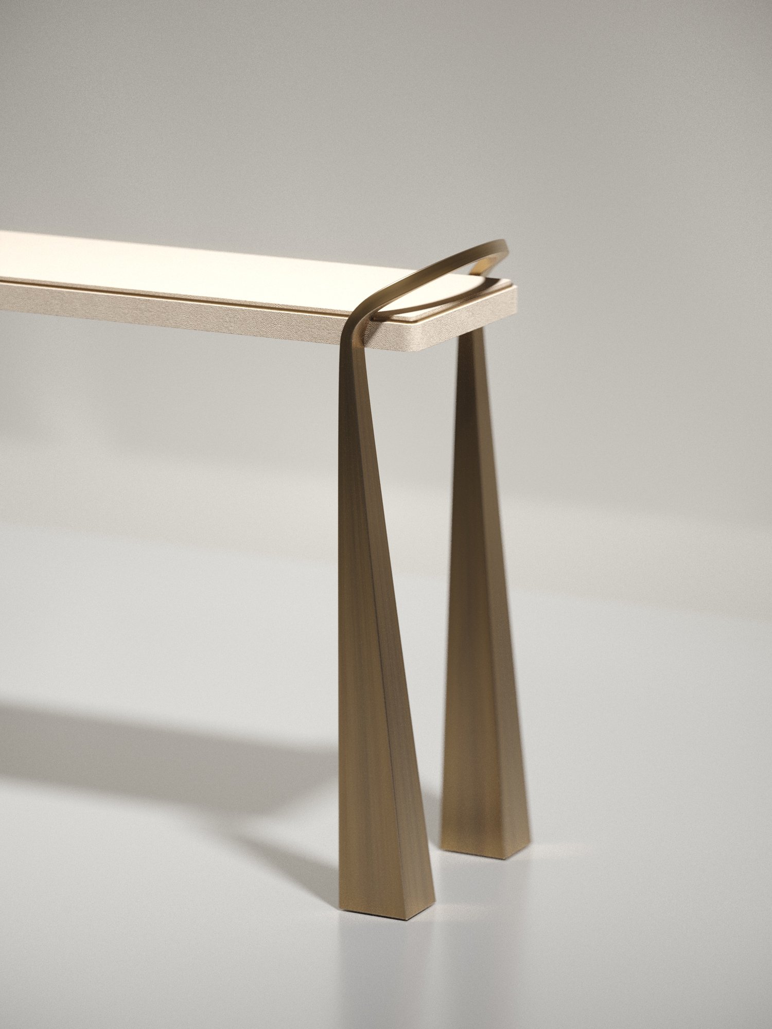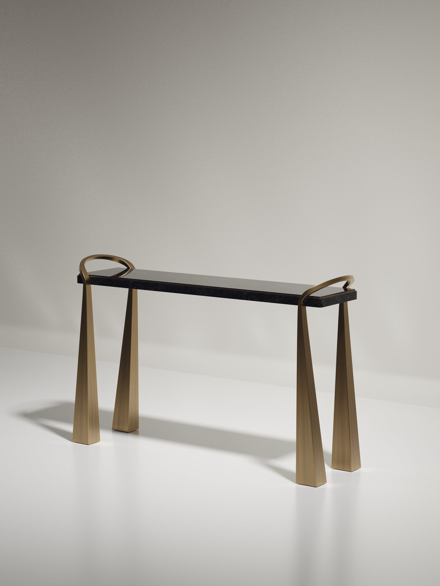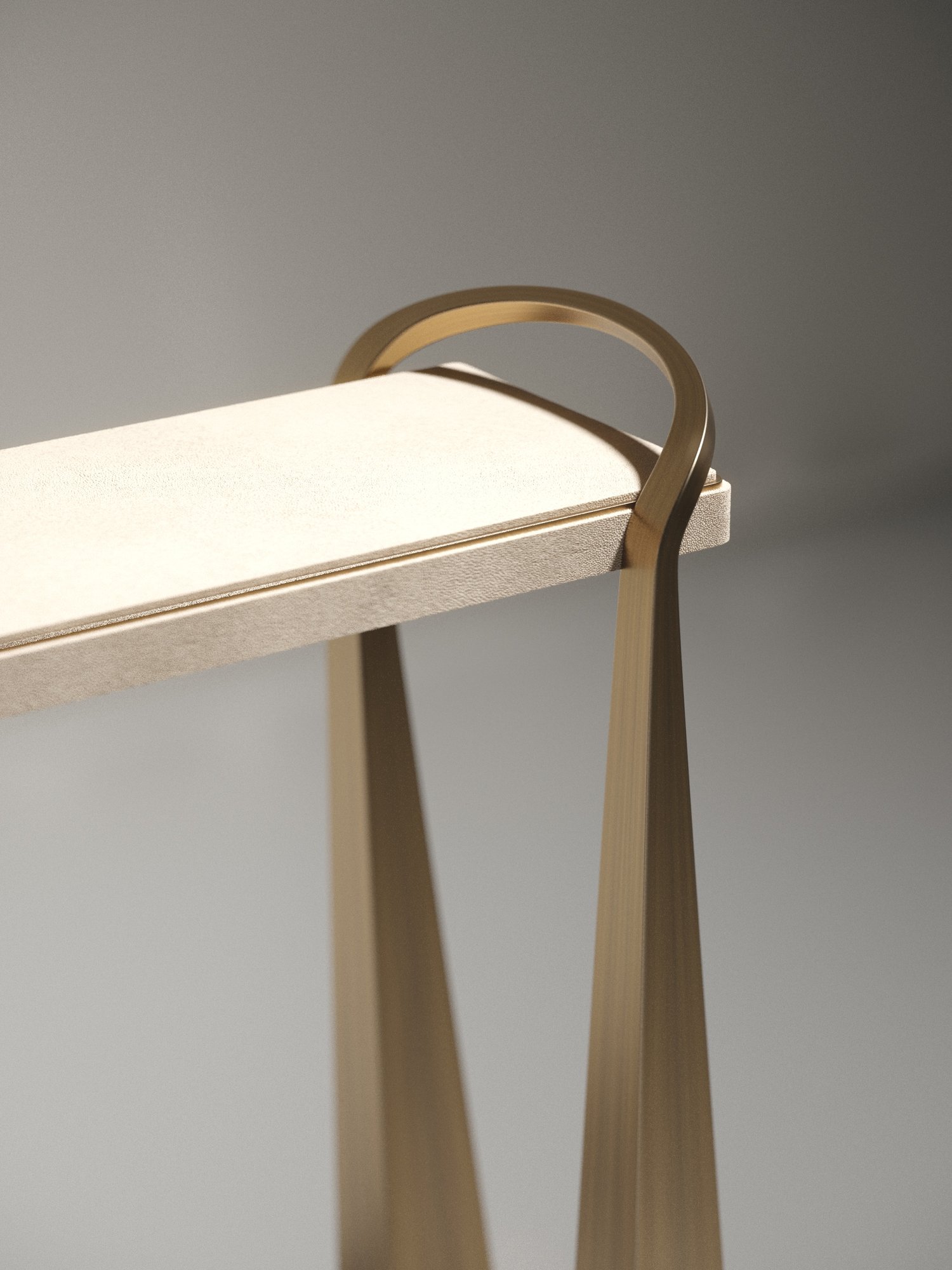 The Arche Console table by R&Y Augousti is a stunning piece, a statement in any space. The cream shagreen inlaid top is nestled in between a pair of bronze-patina brass sculptural cutout "arched" legs. This design also exists on a side table, breakfast table and game table version, see images at end of slide.