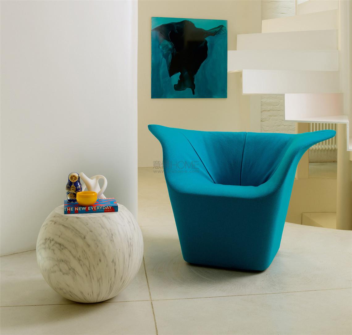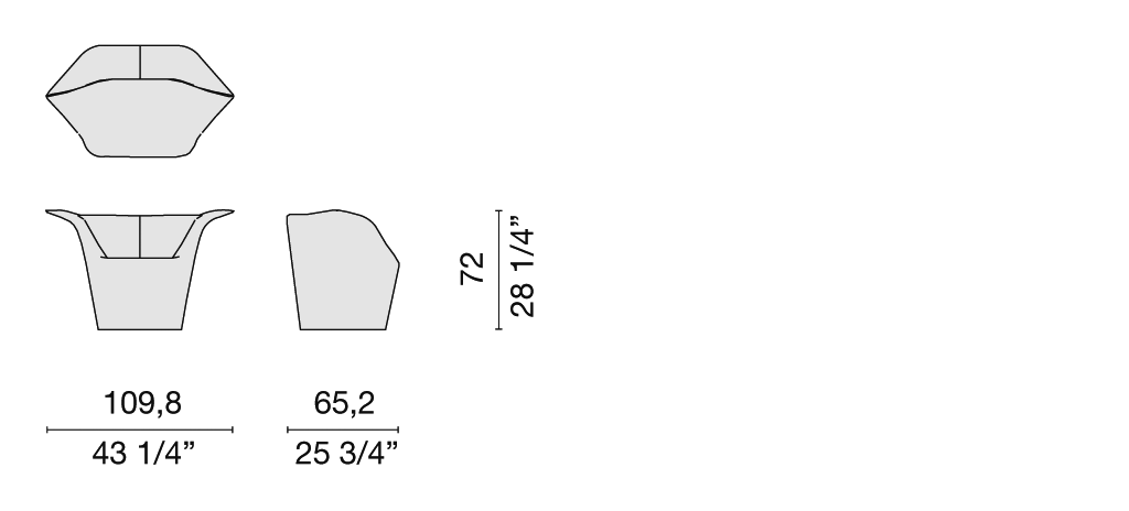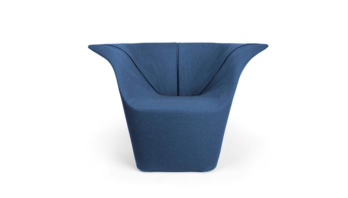 For this seat, a single piece of material is folded and sewn around the geometric form in polyurethane foam: this construction makes curves the ultimate protagonist of the armchair, likening its appeal to that of a sartorial creation.