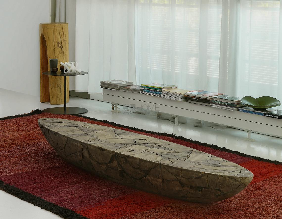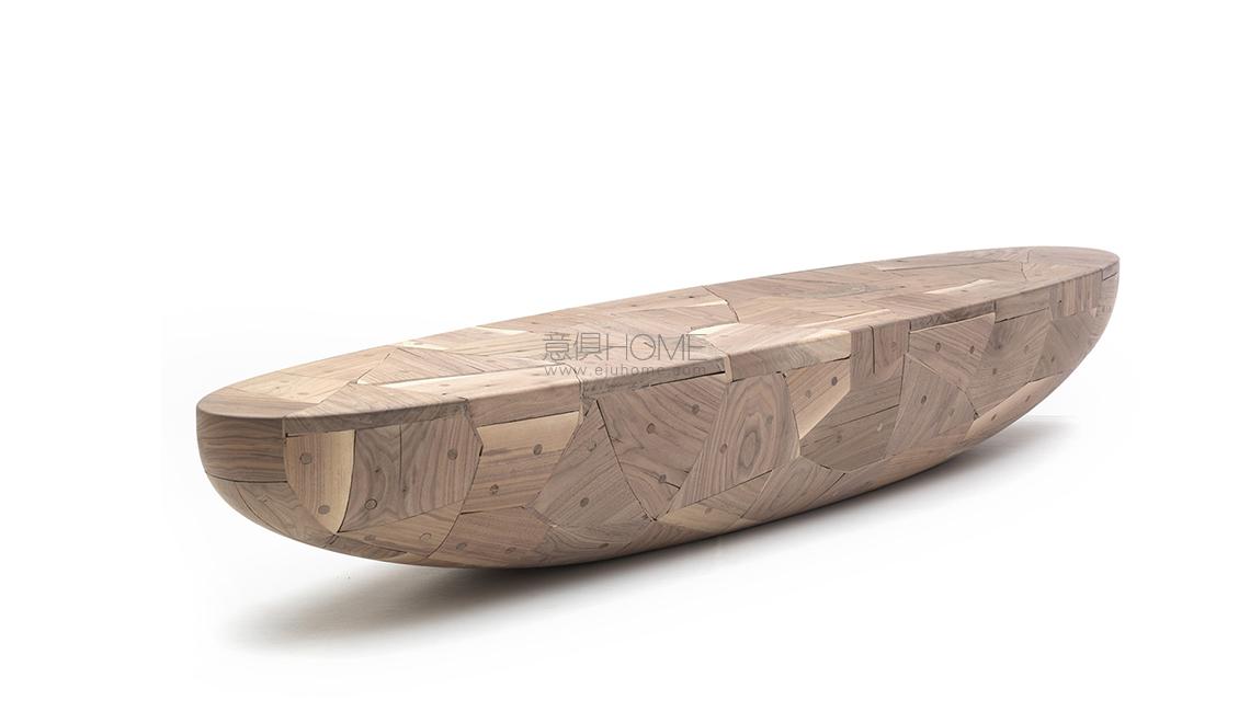 The Poh bench, designed by Raphael Navot, can also be used as a low table and consists of a patchwork of wooden pieces covered with solid natural American walnut.
