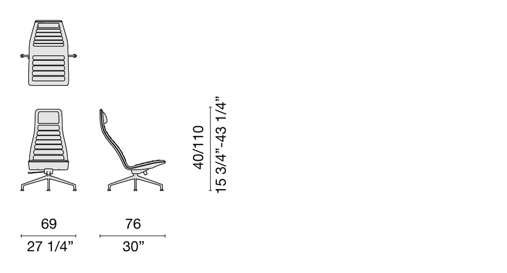 Both swivelling and tilting, the structure of the Lotus (Attesa) is made of beech plywood, with polyurethane foam padding. The base has four spokes and is made of die-cast aluminium with either a polished chrome finish or matte lacquered in white, mud or anthracite.