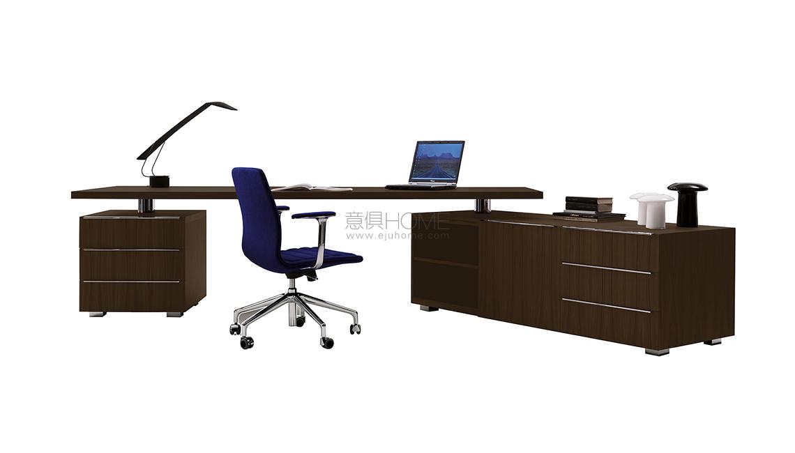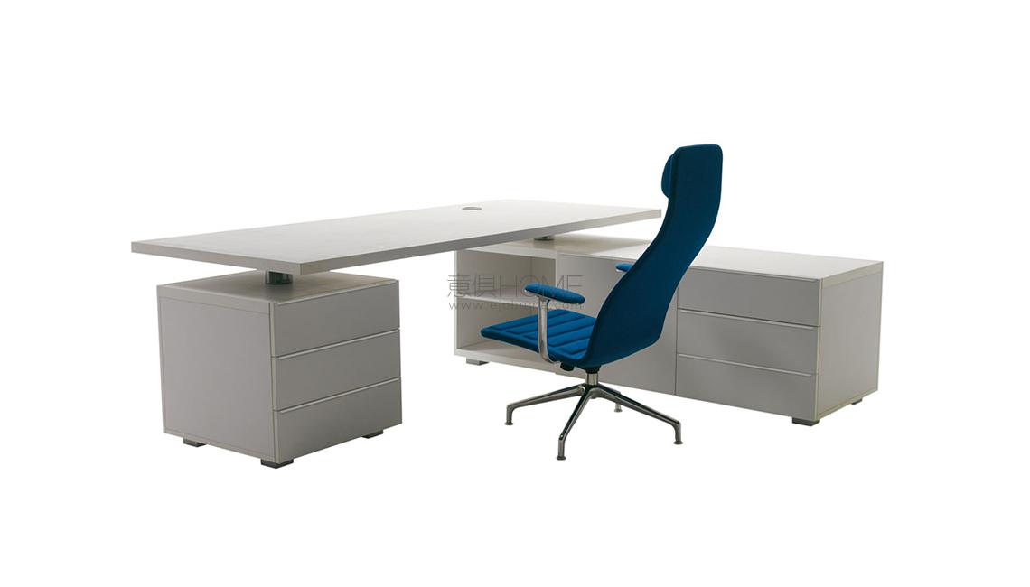 Senior desk by Giulio Cappellini has a thick top with several fixed units, such as cabinets, drawers and elongated tops, all internally equipped with a rotating chrome mechanism.