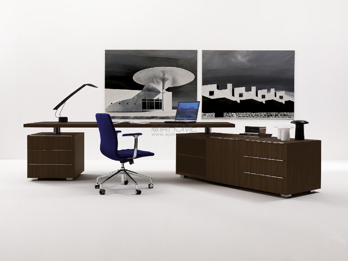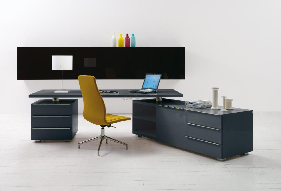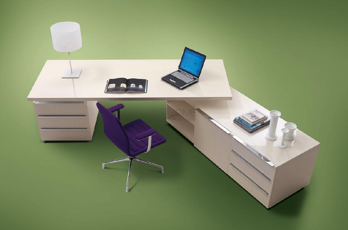Available in a matte or glossy lacquer finish or oak with a natural or wengé stain, the Senior desk has adjustable chrome legs, paired with polished metal handles.