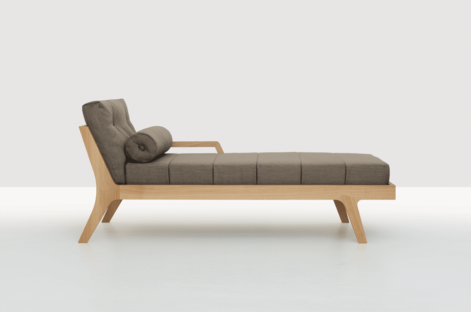 MELLOW DAYBED is a daybed and seating opportunity all at once and also doubles up as chaise longue that invites you to spend time. Its soft back pillow and upholstered roll offer comfort for sitting or reclining alike. Slim material profiles, fine lines, a delicate frame and soft upholstery materials as well as a nifty bend leather cording in the back part are the hallmarks of this daybed.