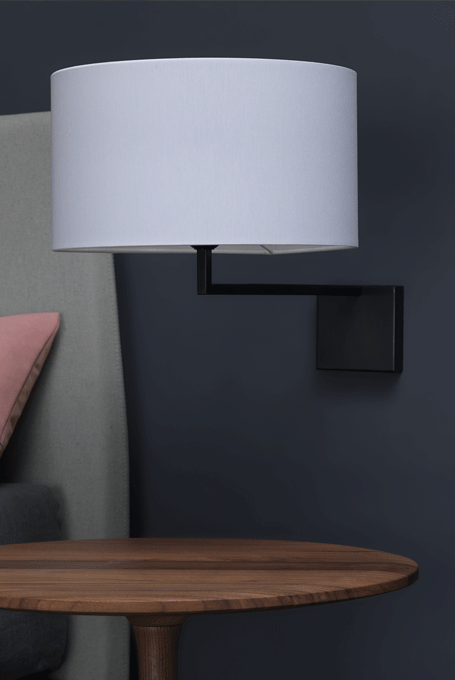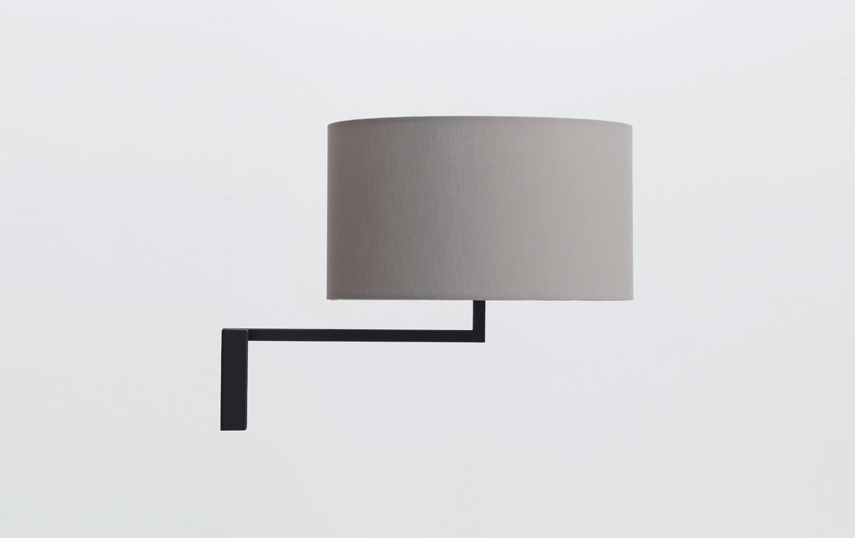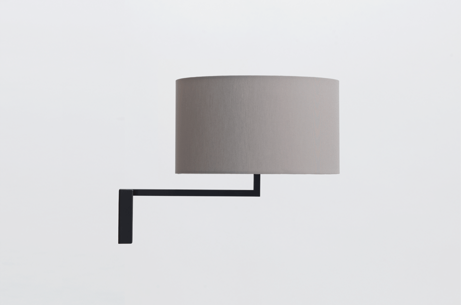 The wall mounted lamp WALL NOON is an ideal complement for the collection NOON. With the same size of the lampshade, it is the wall mounted version of NEAT NOON. The NOON range of lamps is rigidly constructed, the textile lampshades give a soft light. The matt black or matt white powder coated finish gives the iron a soft and warm appearance. The intrinsic value of the lamps is a product of material and hand-crafted details.