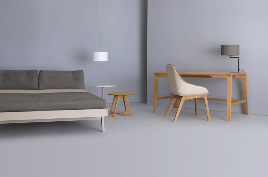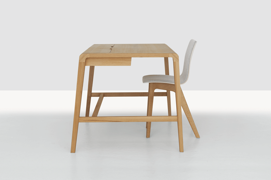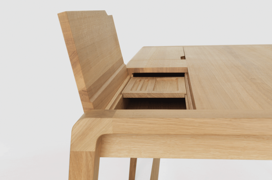 The secretary desk SECRET takes its cue from the familiar image of traditional school desks. Its appearance breathes self reliance, elegance and value. Although its cross sections are finely measured the secretary desks stretched out legs stabilize the desk. The two upfolding compartment covers conceal the integrated stowage compartment for writing utensils and a small laptop or tablet plus power cord.