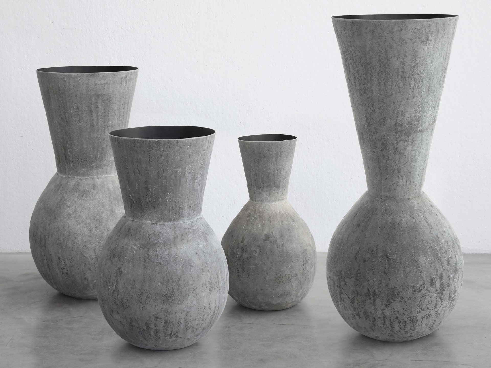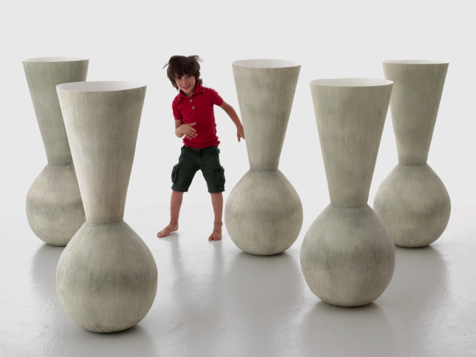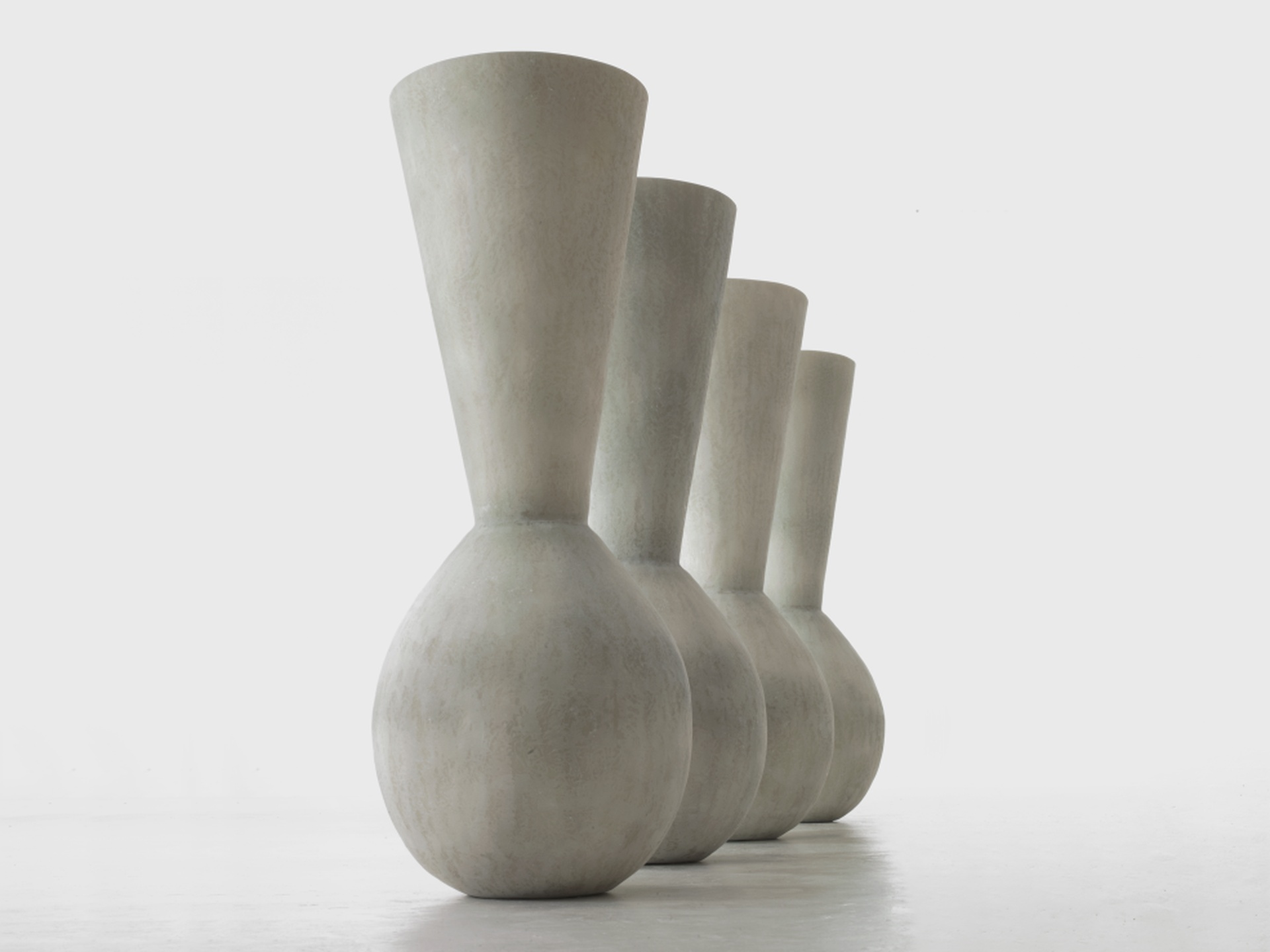 Una famiglia di vasi dalle silhouette armoniose, in cui volumi generosi e geometrie si fondono in un unico disegno, simmetrico e giocoso.