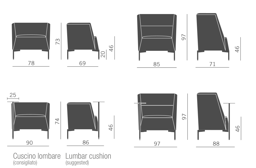 Armchairs and 2-seater sofas on painted steel legs and with one-color or bi-color upholsteries.
