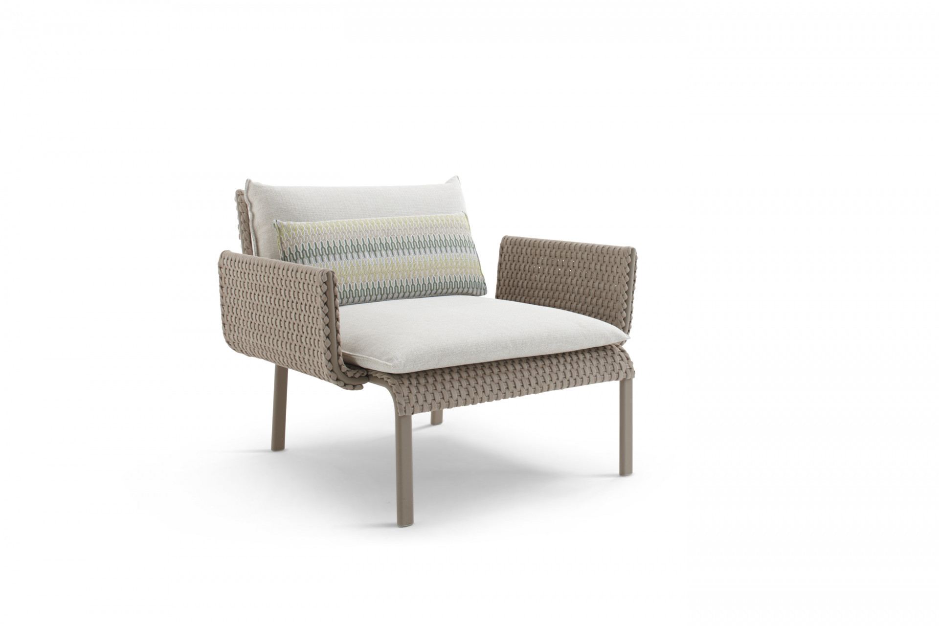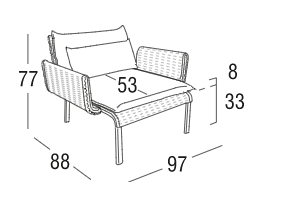 Sedia con braccioli in alluminio con trattamento a polveri, intrecciata con sunrope. L'essenzialità delle forme viene arricchita dal bracciolo finemente lavorato, gli intrecci in sunrope, invece, le conferiscono forza e resistenza. Ideale per l’arredamento contract è pratica da gestire in quanto può essere facilmente impilata. Sedia per esterno, perfetta per ristoranti.