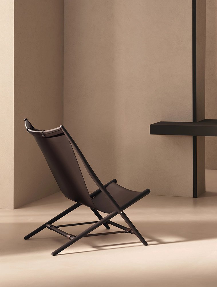 The narrative power of D’Antan tells an iconic story, seamlessly transitioning between the intricate details of matter and clean-cut lines. With impressive dimensions and a spacious seat, this armchair is supported by a solid dark ash frame upholstered in dark-brown leather, featuring a generous backrest that widens at the shoulders and a small leather cushion to support the head. The two curved crosspieces at the head and under the leg recesses offer an additional element of comfort, underscored by the footrest in the same finishes. Its light frame makes it easy to fold, facilitating its transport at will. The perfect synthesis of comfort.
