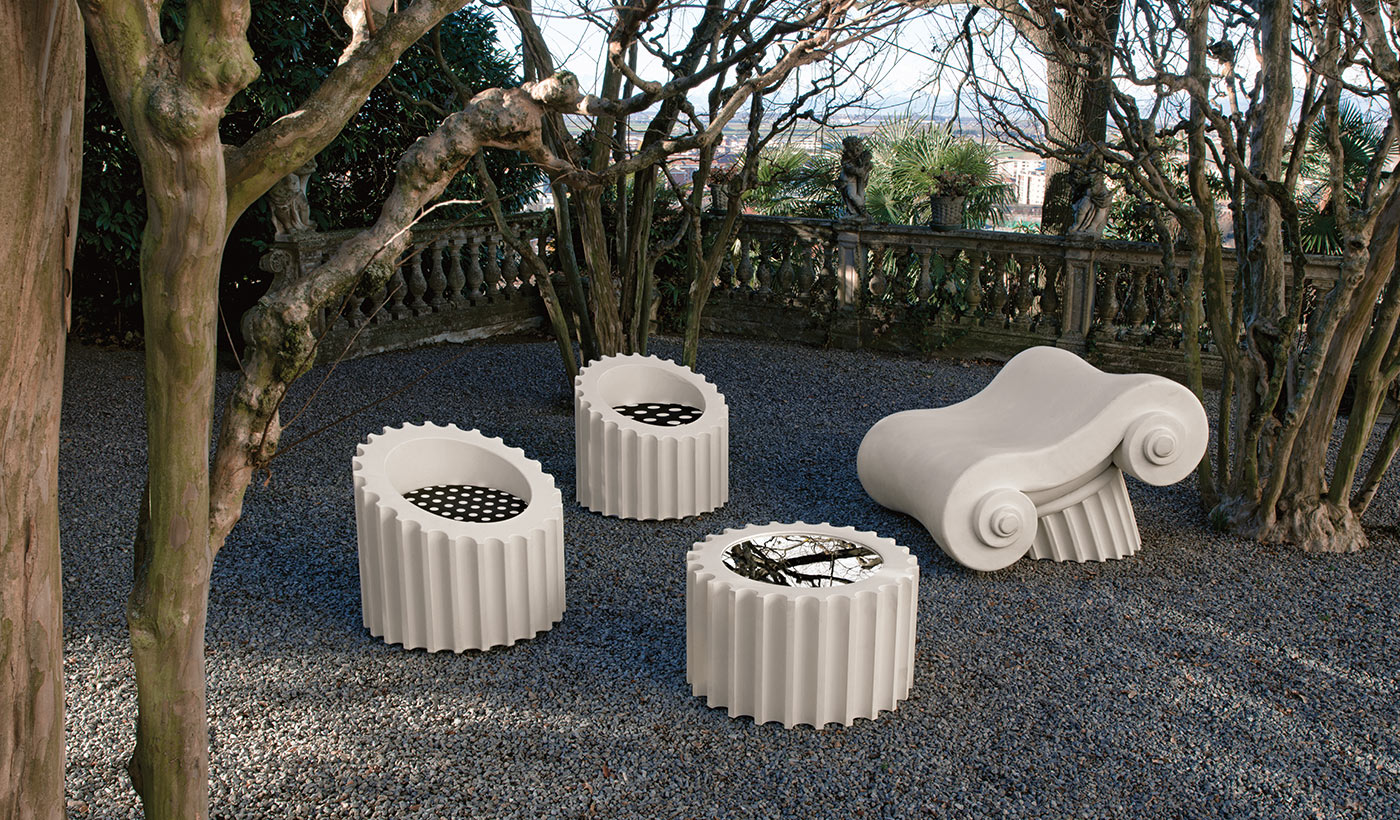 La seduta CAPITELLO, la poltroncina ATTICA e il tavolino ATTICATL, progettati da Studio 65, nascono dalla "decostruzione" di unatradizionale colonna grecd, dando vita a una serie unica cheemula le varie parti della stessa. Ciascun pezzo vieneartigianalmente realizzato in morbido poliuretano e finito conGuflac? Utra, consentendo un utilizzo sia per interni sia peresterni, conferendo l'aspetto del marmo dal quale trae ispirazione.La tensione tra aspettative e realt?? crea un senso di meraviglia,poiché la morbidezza degli arredi contrasta con la durezza dellapietra.Questa iconica serie pop è stata esposta in prestigiosimusei, tra cui il Louvre e il Metropolitan Museum di New York, erappresenta un interessante esempio di rinascita dalle rovine.