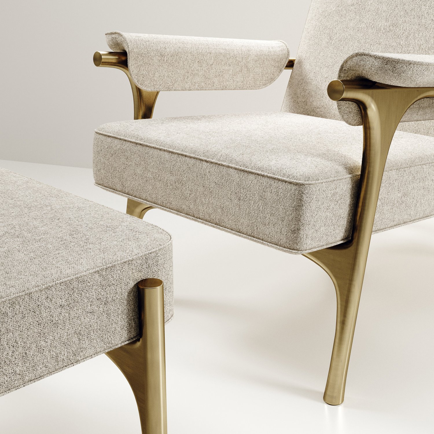 The Ramo armchair by R & Y Augousti is an elegant and versatile piece. The upholstered piece in Pierre Frey fabrics provide comfort while retaining a unique aesthetic with the bronze-patina brass frame and details. Part of the Ramo Seating Series.