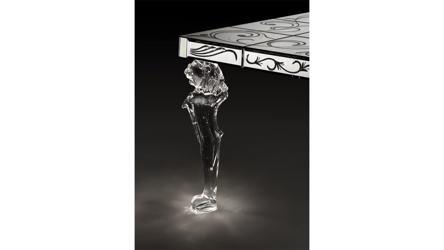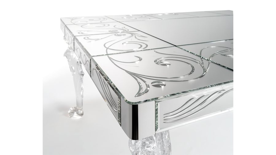 Tavolo pranzo con base composta da gambe in vetro di Murano massiccio trasparente con illuminazione Led. Piano rivestito da formelle in vetro extrachiaro a specchio con incisioni artistiche.
