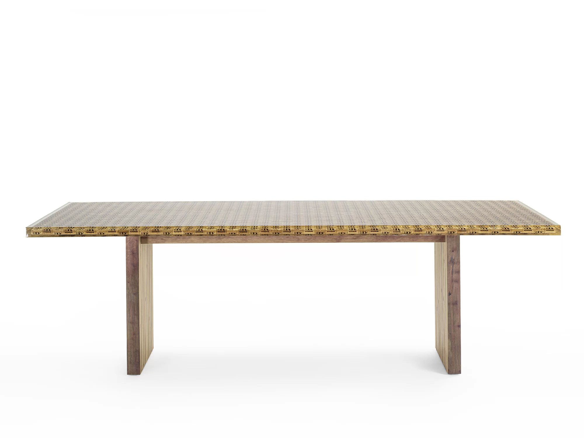 Tavolo con basamento in rovere proveniente dalle Barrique e top realizzato con tappi di bottiglia in sughero immersi nella resina.
