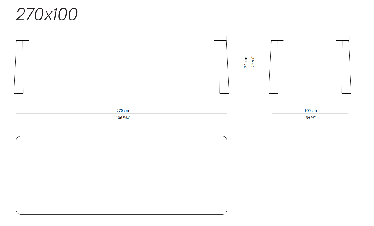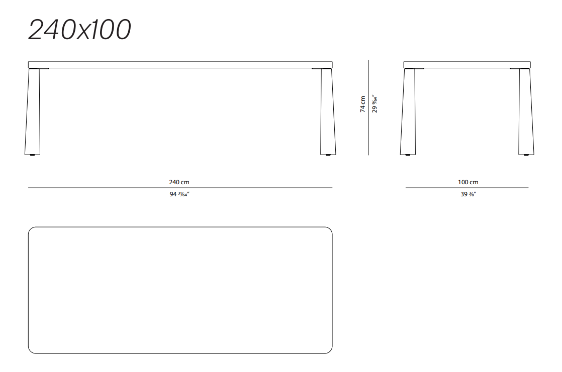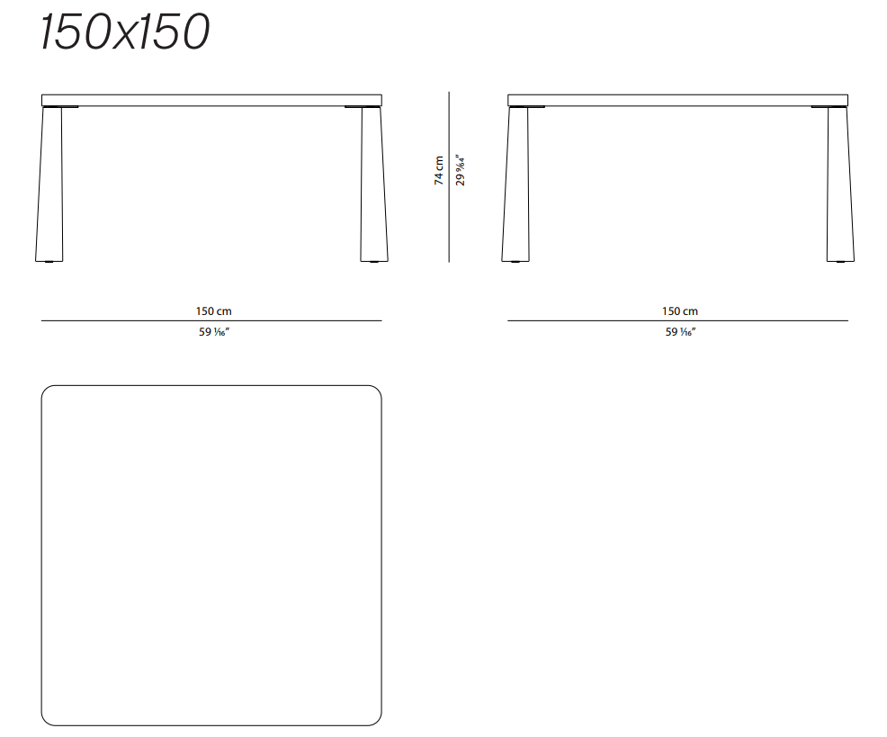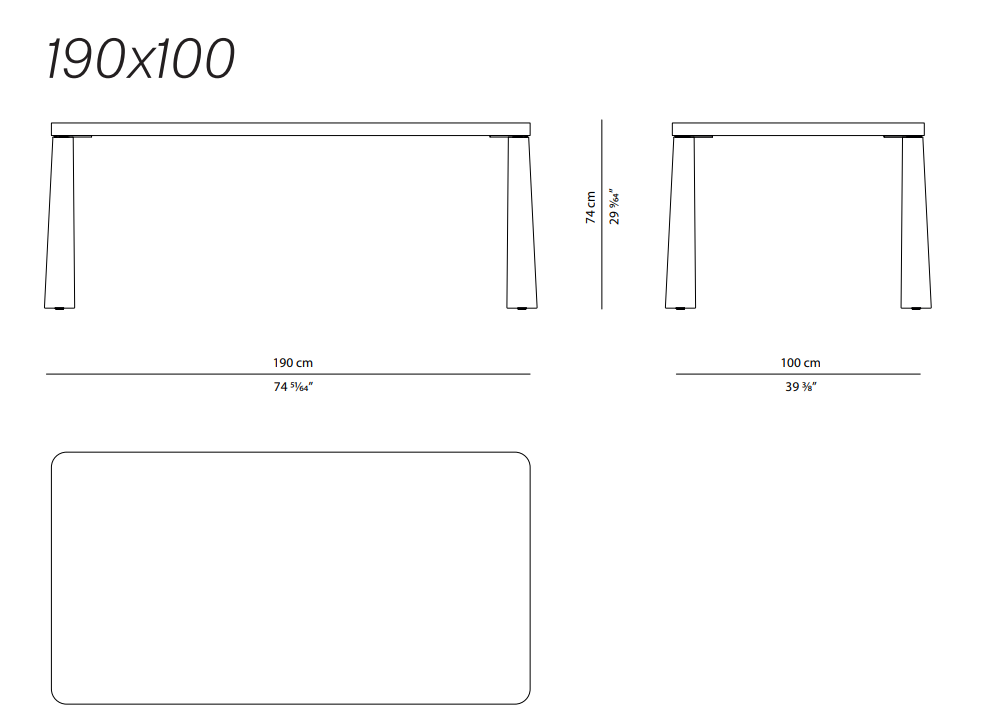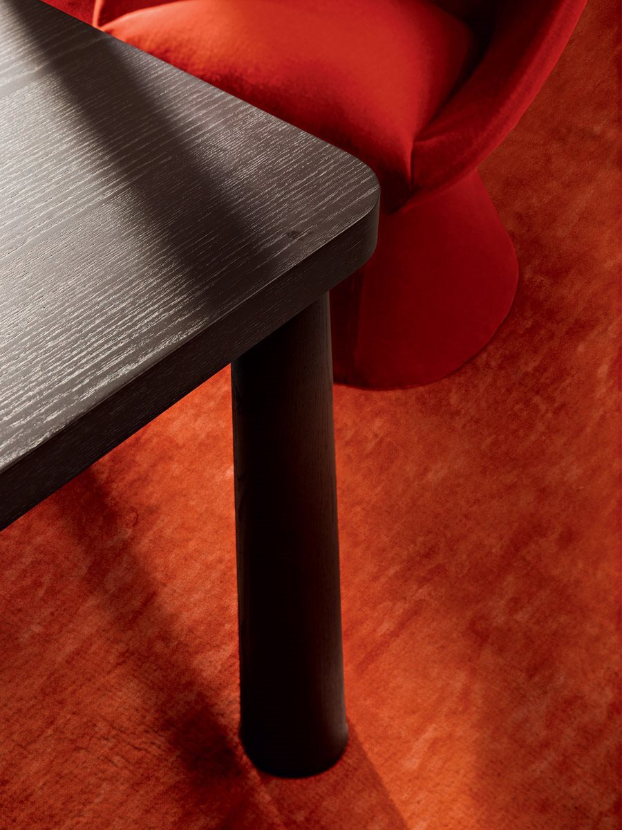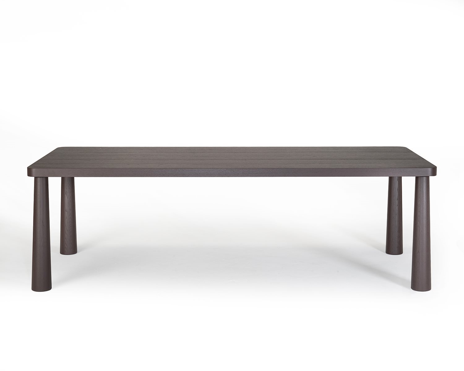 Honeycomb wood top, with aluminium honeycomb core, veneered with open pore stained ash in the colours algae, amaranth, espresso or black or in oak stained ash. Legs made of solid stained ash in the same colours as the top. We offer the possibility to position the legs either flush with the top or slightly back.An innovative feature of the Tidone table is the possibility of mounting the legs in two different positions: at the ends of the top or slightly set back. This flexibility allows the table to be adapted to different aesthetic and functional contexts.