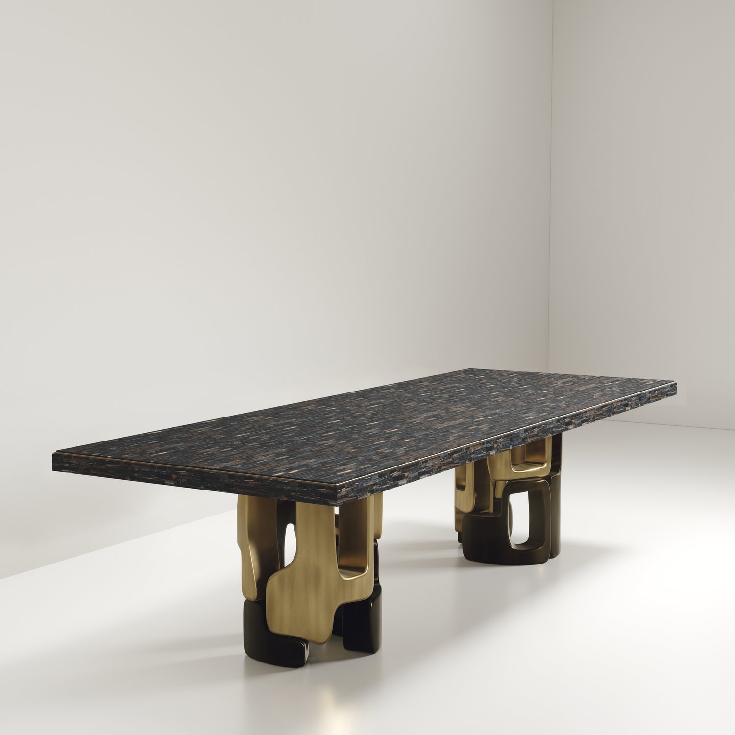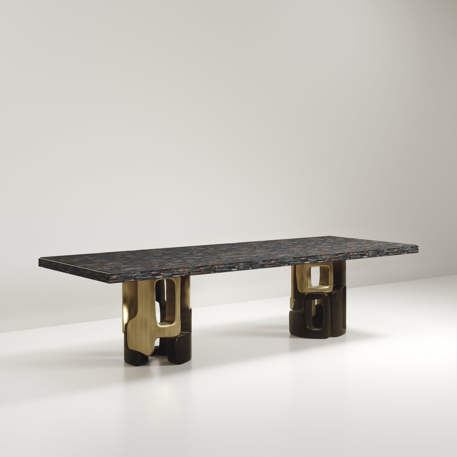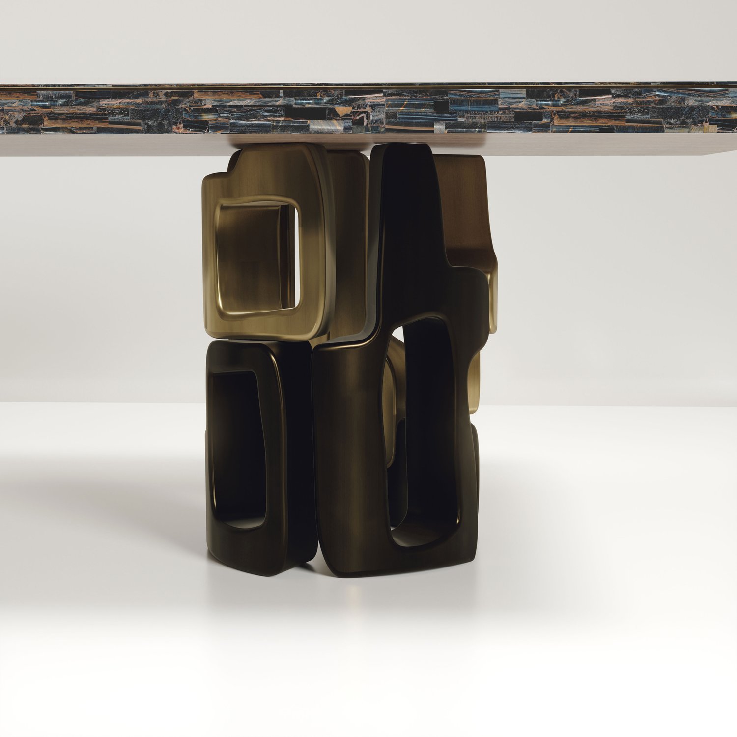 The Apoli I Dining table by Kifu Paris is both dramatic and organic in its unique design. The stunning semi-precious Tiger Eye Blue top sits on a pair of geometric and sculptural bronze-patina brass bases. This piece is designed by Kifu Augousti the daughter of Ria and Yiouri Augousti. Part of the Apoli Capsule Series, see images of collection at end of slide.