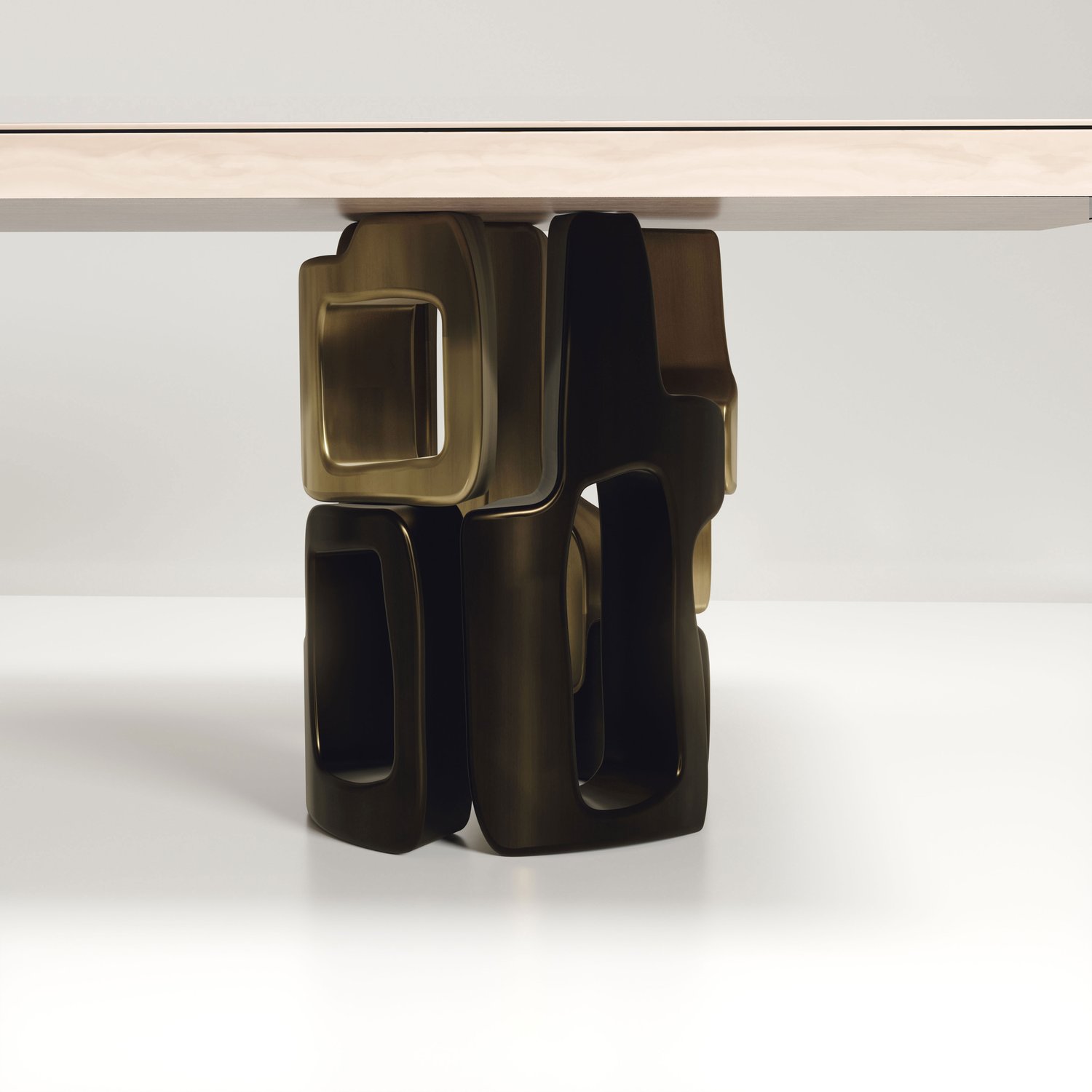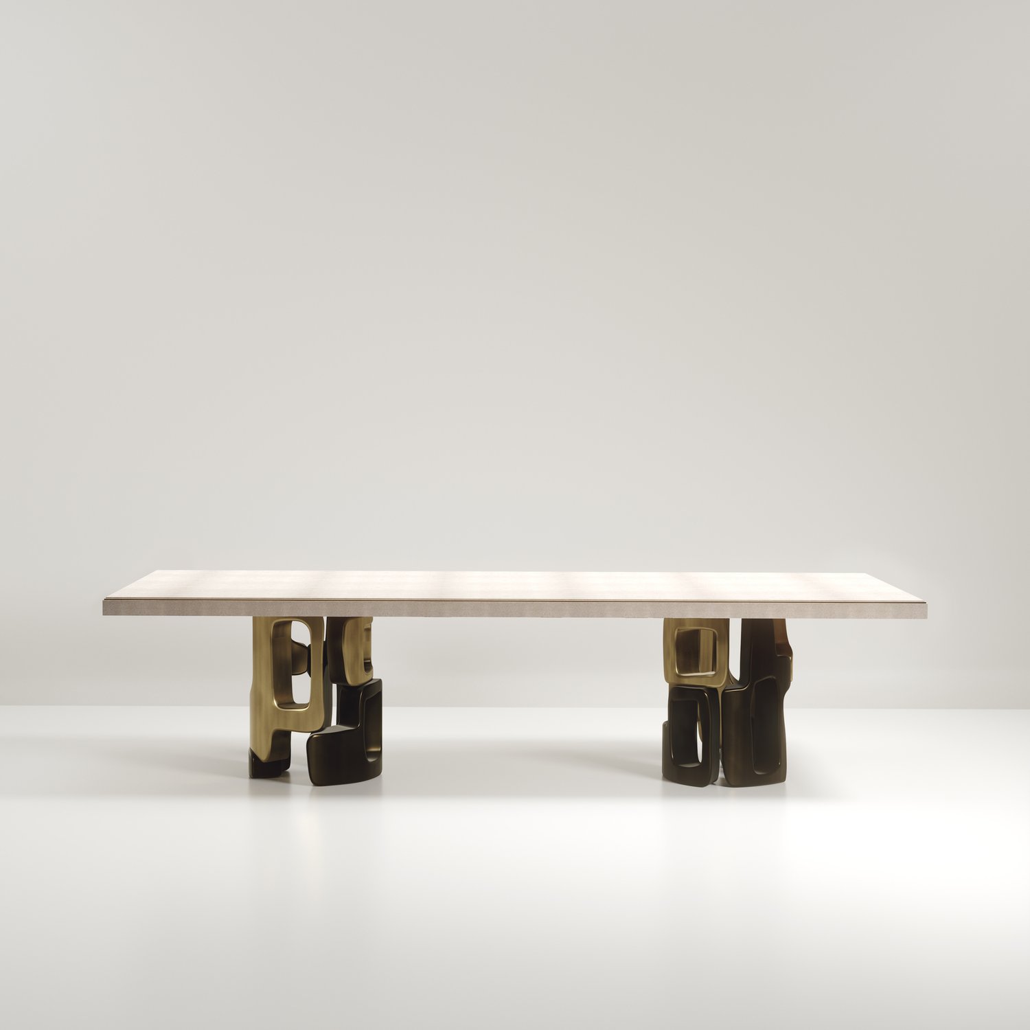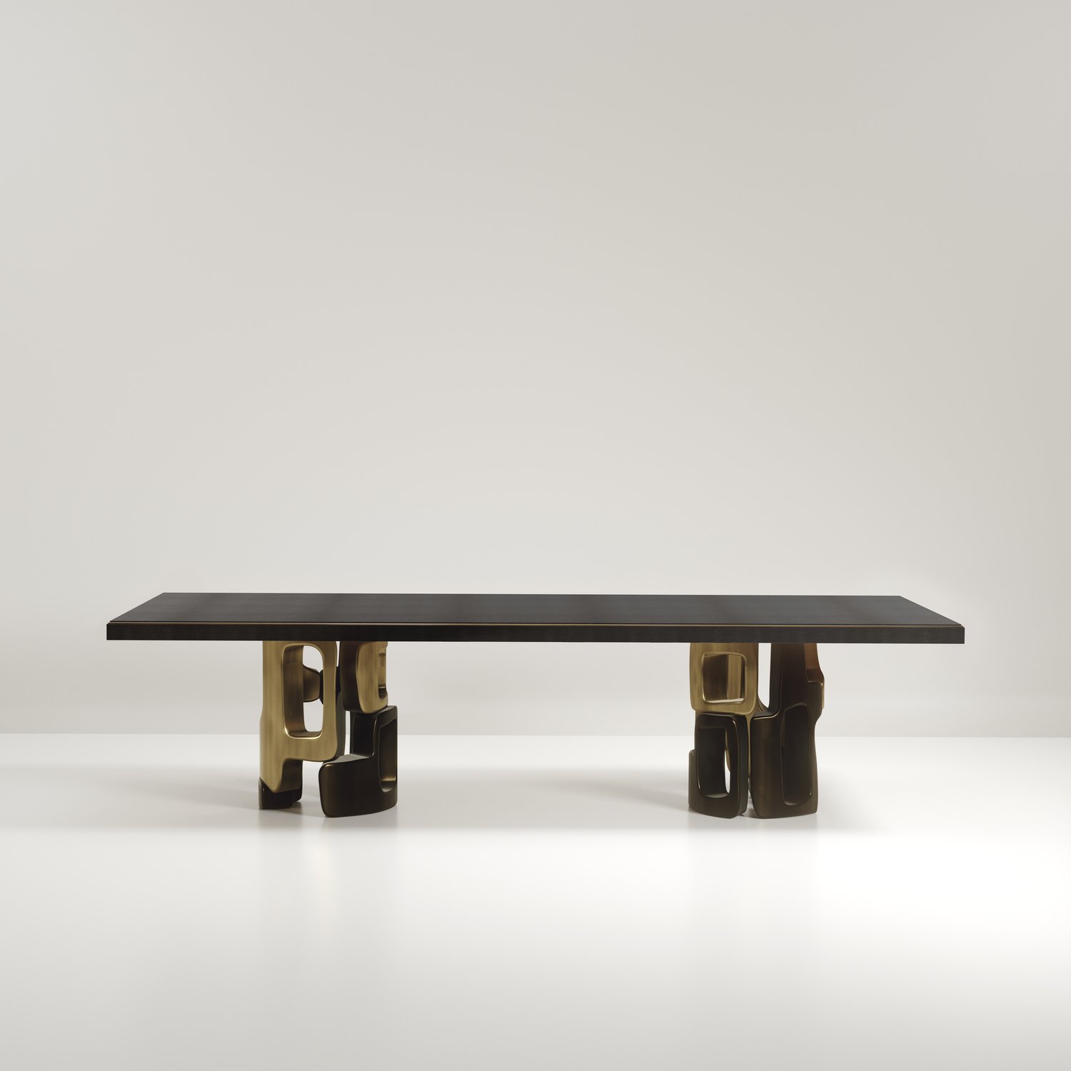 The Apoli I Dining table by Kifu Paris is both dramatic and organic in its unique design. The stunning semi-precious Tiger Eye Blue top sits on a pair of geometric and sculptural bronze-patina brass bases. This piece is designed by Kifu Augousti the daughter of Ria and Yiouri Augousti. Part of the Apoli Capsule Series, see images of collection at end of slide.