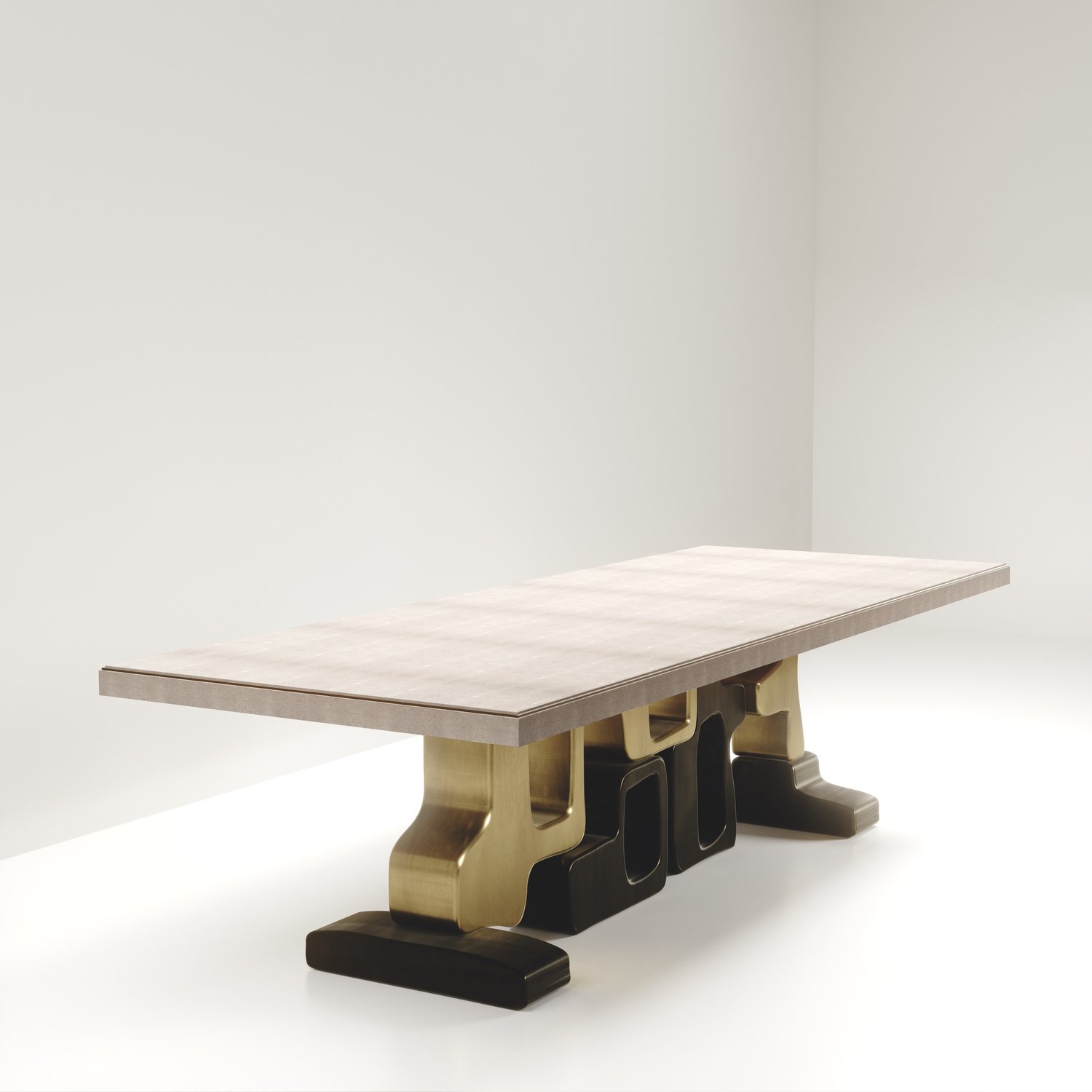 The Apoli II dining table by Kifu Paris is both dramatic and organic its unique design. The black pen shell inlaid top sits on a long clustered geometric and sculptural bronze-patina brass base. This piece is designed by Kifu Augousti the daughter of Ria and Yiouri Augousti. Part of the Apoli Capsule Series, see images of collection at end of slide.