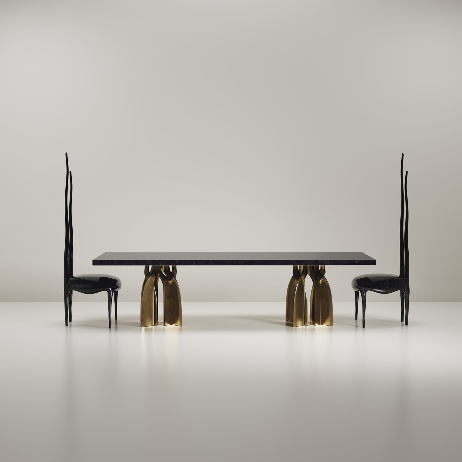 The Chital Dining table is a stunning piece, a statement in any space. The black pen shell inlaid top is sleek and dramatic, and followed by bronze-patina brass sculptural legs clustered together as the base. This piece is designed by Kifu Augousti, the daughter of Ria & Yiouri Augousti. Available in other finishes and as a round breakfast table version.