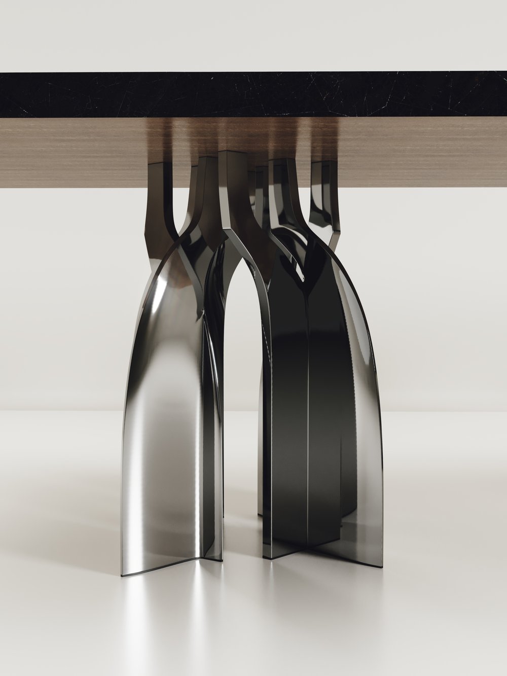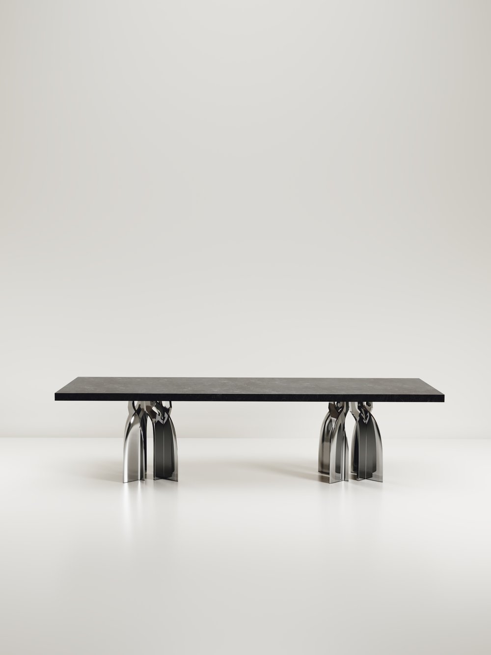 The Chital Dining table is a stunning piece, a statement in any space. The black pen shell or antique natural shagreen inlaid top is sleek and dramatic, and followed by a new chrome finish polished stainless steel sculptural legs clustered together as the base. This piece is designed by Kifu Augousti, the daughter of Ria & Yiouri Augousti. Available in other finishes and as a round breakfast table version.