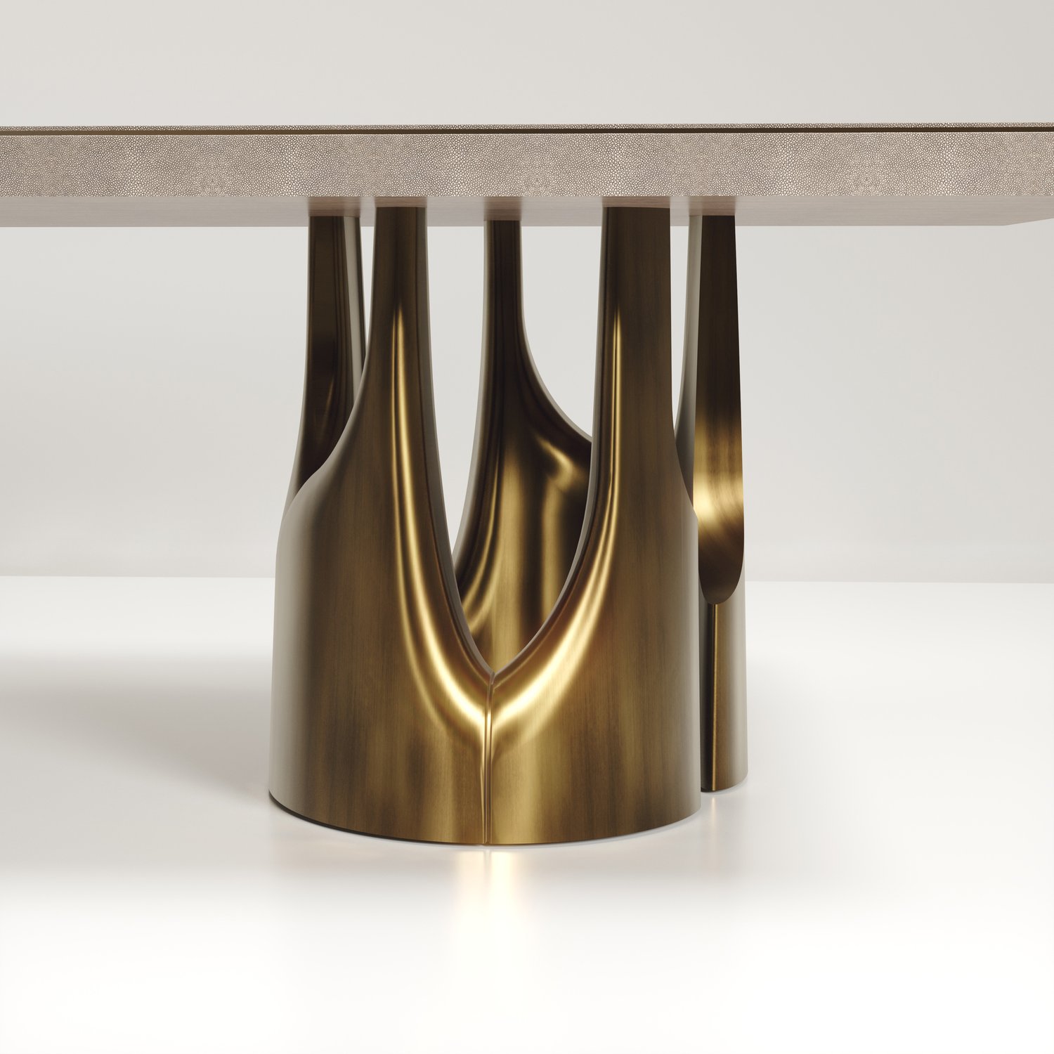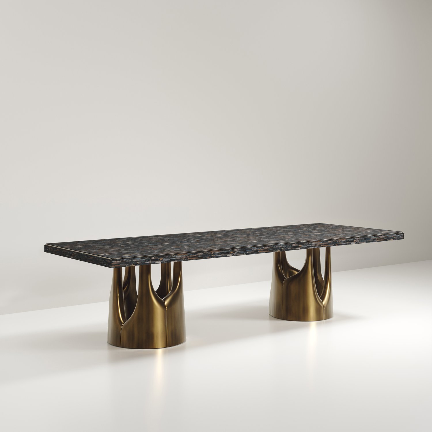 The Triptych I Dining Table by R&Y Augousti is a stunning multi-faceted sculptural piece. The beautiful hand craved details on the long clustered bronze-patina base demonstrate the incredible artisan work of Augousti.